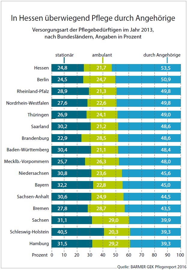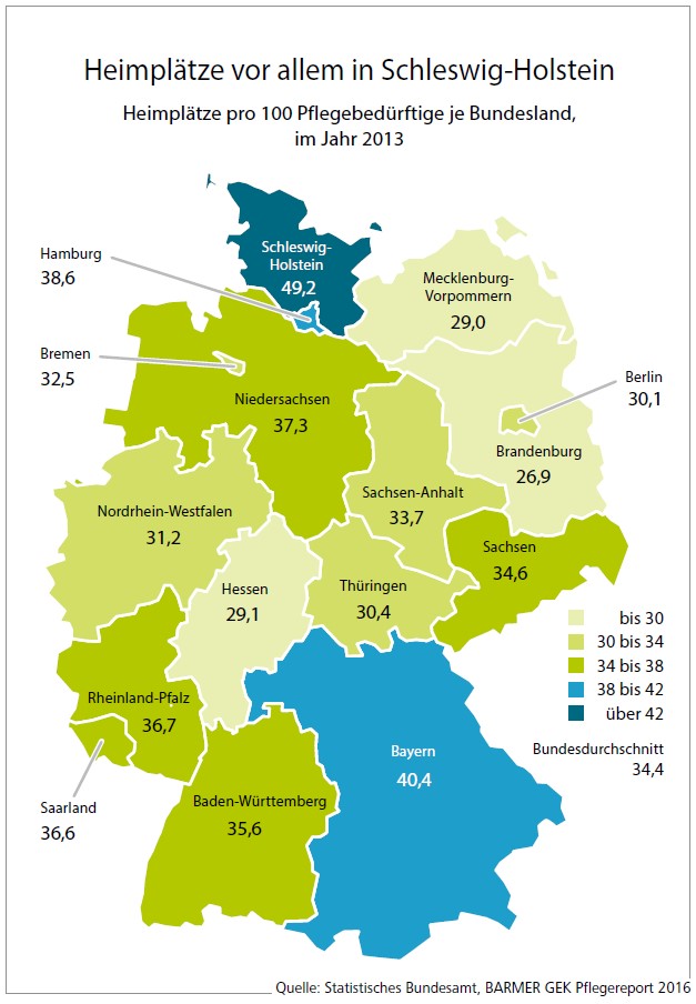 So wird in Thüringen etwa jeder zweite Pflegebedürftige (49 Prozent) durch Familienangehörige betreut, in Sachsen, Schleswig-Holstein und Hamburg sind es weniger als 40 Prozent. Ein deutliches Gefälle besteht auch bei den Kapazitäten der vollstationären Pflege: In Thüringen kommen auf 100 Pflegebedürftige nur rund 30 Heimplätze. In Schleswig-Holstein sind es dagegen 49 Heimplätze und in Bayern 40. Im Länderranking liegt Thüringen damit an 13. Stelle hinter elf anderen Bundesländern. Insgesamt existieren derzeit (Stand Feb. 2017) in Thüringen 532 stationäre Pflegeeinrichtungen mit insgesamt über 29.000 verfügbaren Plätzen.