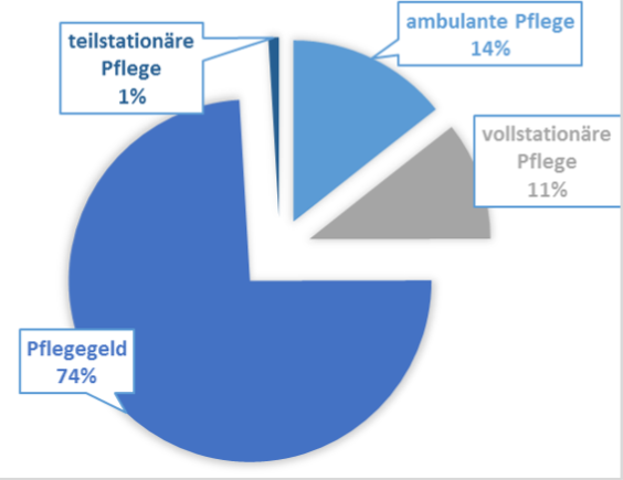 - In der Gesamtbetrachtung aller 94.000 Pflegebedürftigen erhalten 48 Prozent (rund 46.000) ein monatliches Pflegegeld. Jeder vierte lebt in einem Pflegeheim. Quelle: www.gbe-bund.de