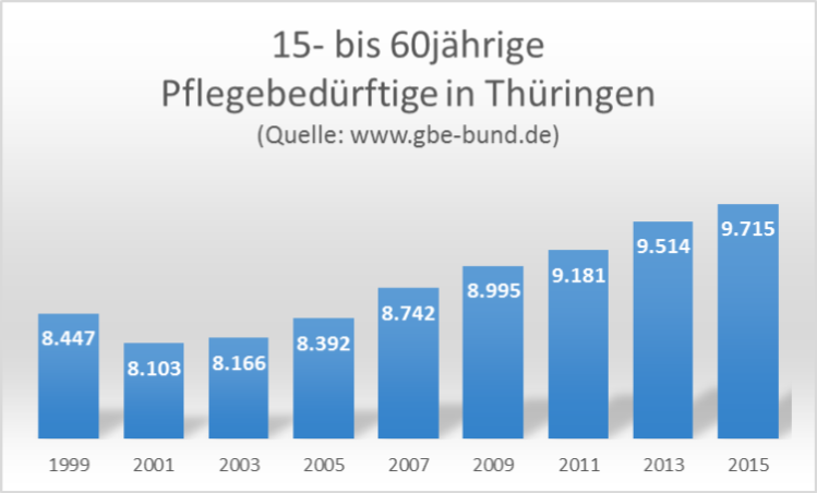 Erfurt, 27.11.2017 - Pflegebedürftigkeit ist nicht nur ein Thema der Alten und Hochbetagten. Die Zahl der „jüngeren“ Pflegebedürftigen im Alter von 15- bis 60 Jahren ist in Thüringen seit der Jahrtausendwende um fast 20 Prozent auf 9700 Personen angestiegen. Das ist jeder zehnte von insgesamt rund 94.000 Pflegebedürftigen im Freistaat, verweist die Barmer auf Zahlen des Statistischen Bundesamtes (s.u. Grafik). „Bettlägerig, hilflos und alt? Ich kann vor Stereotypen nur warnen“, sagt Birgit Dziuk, Landesgeschäftsführerin der Barmer in Thüringen. „Denn Pflege hat viele Gesichter. Besonders die jüngeren Pflegebedürftigen werden oft vergessen. Sie haben andere Krankheitsbilder und andere Bedarfe. Ein 30-Jähriger mit einem Down-Syndrom kann ganz anders am Leben teilhaben, als ein 80-Jähriger, der bettlägerig oder schwer dement ist. Tendenziell wollen junge Pflegebedürftige individueller und selbstbestimmter leben, als es ihnen bisher möglich ist.“
