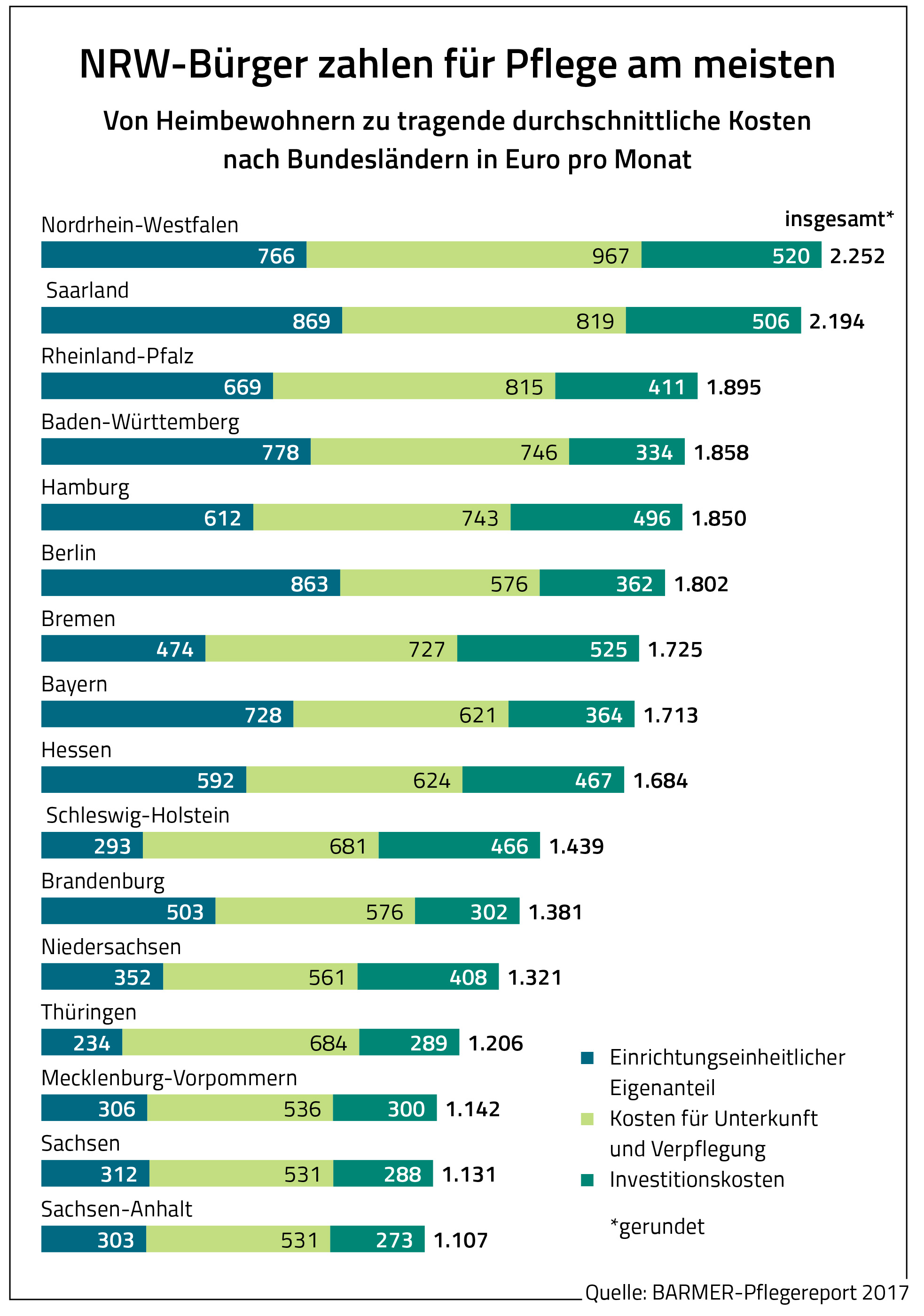 Erfurt, 16. Mai 2018 – Bewohner von Pflegeeinrichtungen in Thüringen müssen in den kommenden Jahren mit erheblich steigenden Eigenanteilen rechnen. Nach einer aktuellen Auswertung der Barmer liegt der Eigenanteil derzeit mit rund 1.200 Euro monatlich fast ein Drittel unter dem bundesweiten Durchschnitt (siehe Grafik). In Nordrhein-Westfalen müssen Pflegebedürftige mit rund 2.250 Euro fast doppelt so viel aus eigener Tasche finanzieren. „Es ist zu erwarten, dass sich Thüringen und andere ostdeutsche Bundesländer bei den Eigenanteilen an das Niveau der anderen Länder annähern werden. Wir müssen darüber nachdenken, wie wir Pflege bezahlbar gestalten, ohne dass die Menschen durch zu hohe Eigenanteile in die Armutsfalle geraten“, sagt Birgit Dziuk, Landesgeschäftsführerin der Barmer, beim 1. Thüringer Pflegeforum in Erfurt. Ursache für steigende Eigenanteile sei das Teilkasko-Prinzip der Pflegeversicherung. Wenn die Löhne für Pflegekräfte steigen, was auch gewollt und richtig sei, wirkt sich dies unmittelbar auf den Eigenanteil der Bewohner in den Pflegeeinrichtungen aus.