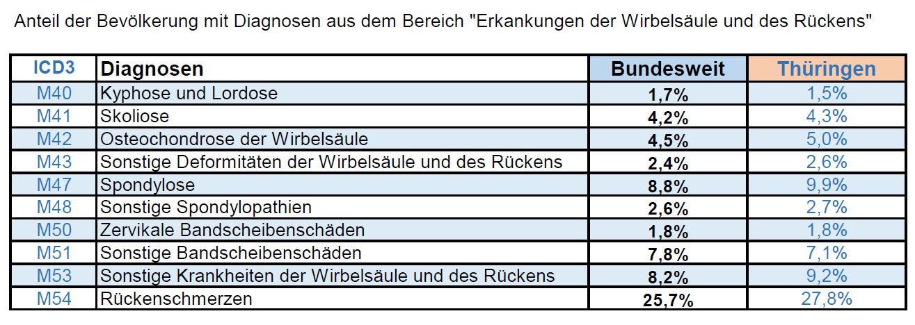 Bei fast 28 Prozent aller Thüringer wurden im Jahr 2014 in der Praxis oder im Krankenhaus Rückenschmerzen diagnostiziert, wie eine aktuelle Auswertung von Versichertendaten belegt. Bundesweit waren es mit 26 Prozent nur etwas weniger. Dabei sind weitere Rückenleiden wie Bandscheibenvorfälle oder die Spondylose noch gar nicht mit eingerechnet (siehe Tabelle). So erklärt sich auch, warum Arbeitnehmer immer häufiger wegen Rückenbeschwerden ausfallen.