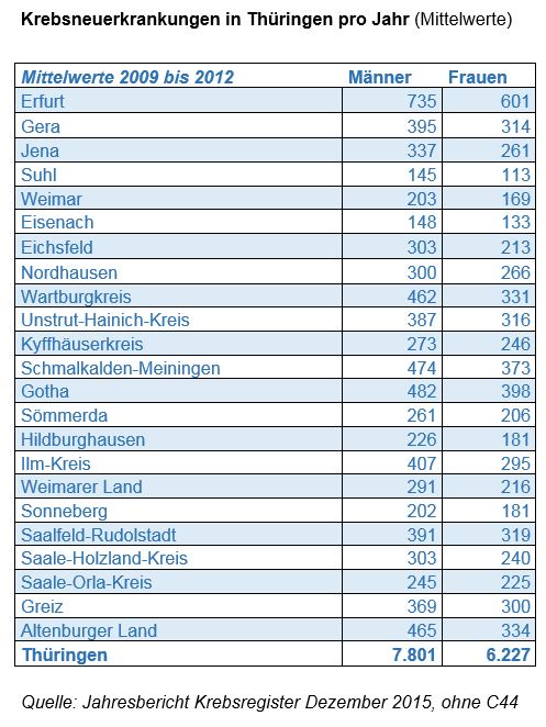 Krebserkrankungen pro Jahr (Mittelwert für die Jahre 2009 bis 2012) nach Regionen in Thüringen.