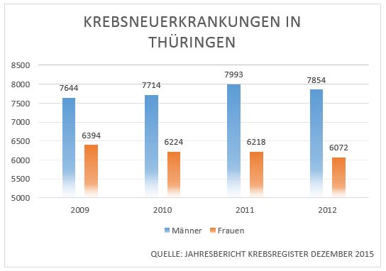 Erfurt (02.02.2016). Zwischen 2009 und 2012 ist das Risiko einer Frau in Thüringen, im Laufe ihres Lebens neu an einer bösartigen Neubildung zu erkranken, von 36,1 Prozent auf 34,9 Prozent gesunken. Bei den Männern ist der Trend gegenläufig: Das Lebensrisiko einer Krebserkrankung stieg von 43,3 Prozent auf 44,1 Prozent. Die Barmer GEK beruft sich dabei auf den Ende 2015 vorgelegten Jahresbericht des ostdeutschen Krebsregisters. Demnach erkrankten 2012 rund 14.000 Thüringer an Krebs. Das Durchschnittsalter liegt bei 70 Jahren. Die häufigsten Krebsarten betreffen demnach Lunge, Darm, Prostata und Brust. Im Schnitt sterben jährlich rund 6500 Thüringer an Krebs. Die Chance auf Heilung oder Stabilisierung ist jedoch besser geworden: Laut Krebsregister beträgt die Überlebensrate bei Männern zehn Jahre nach der Erkrankung etwa 55 Prozent und bei Frauen 59 Prozent. Vor dreißig Jahren waren die Chancen nicht halb so gut.