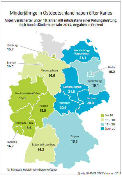 Die Zahlen bestätigen Aussagen des aktuellen Berichts des Thüringer Landesverwaltungsamts über die Gesundheit von Kindern und Jugendlichen. Demnach hat sich die Karieslast der 12-Jährigen in den letzten zehn Jahren halbiert. Im Vergleich zu anderen Bundesländern besteht aber noch Potenzial: "Es ist Besorgnis erregend, dass jeder fünfte Minderjährige in Thüringen im Jahr 2014 eine Zahnfüllung brauchte", sagt Robert Büssow, Sprecher der Barmer GEK in Thüringen. 20,9 Prozent der Kinder und Jugendlichen bis 18 erhielten wegen Karies eine Zahnfüllung – in den meisten alten Bundesländern wurde deutlich seltener gebohrt.