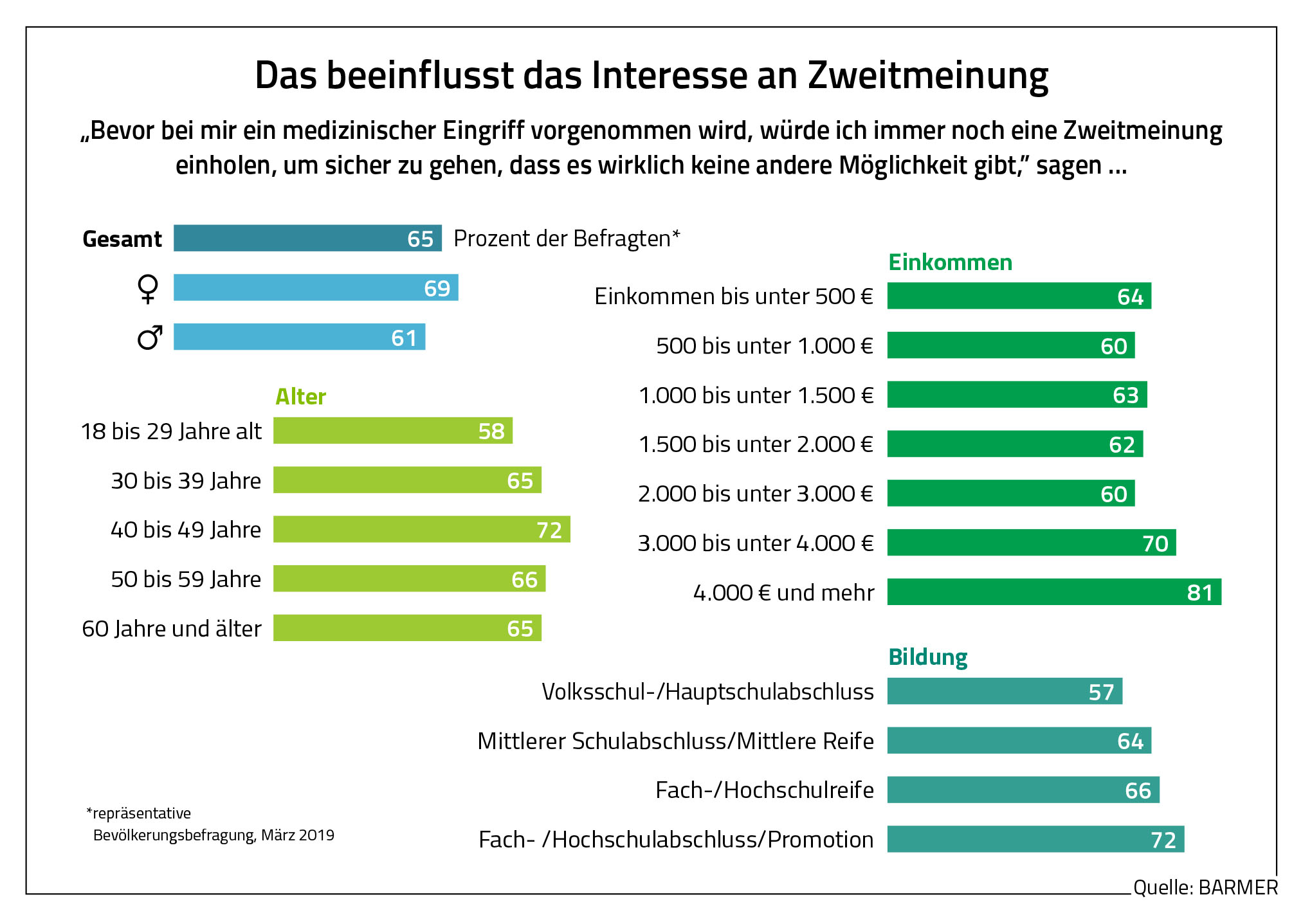 - Zur Studie: Im Auftrag der Barmer wurden deutschlandweit in einer Online-Befragung 1.000 Personen ab 18 Jahren zu planbaren medizinischen Eingriffen und einer ärztlichen Zweitmeinung befragt. Die Interviews wurden im März 2019 durch die respondi AG geführt. Grundgesamtheit der Untersuchung sind alle Erwachsenen ab 18 Jahre, die in Deutschland leben. Aus dieser Grundgesamtheit wurde eine Stichprobe gezogen, die hinsichtlich Alter und Geschlecht an der in Deutschland lebenden Bevölkerung orientiert ist. Weiterhin wurde die Stichprobe nach Bundesland quotiert.