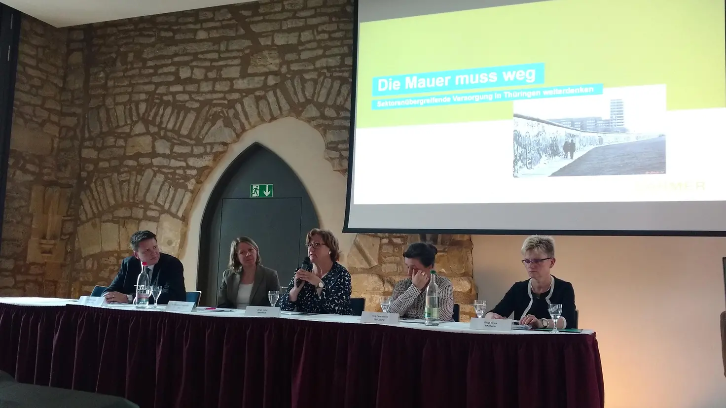 Die Gesundheitsversorgung in Deutschland ist gut. Aber sie könnte noch deutlich besser sein. Ein wesentliches Defizit besteht in der diskontinuierlichen Versorgung von Patienten entlang der Sektorengrenzen - insbesondere dem stationären und dem ambulanten Bereich. „Wir blicken auf ein historisch gewachsenes Gesundheitssystem mit vielfältigen Strukturen und eigenen sektoralen Logiken“, sagte Birgit Dziuk, seit Jahresbeginn neue Landesgeschäftsführerin der Barmer, zur Eröffnung der Veranstaltung „Die Mauer muss weg“ am 10. April im Erfurter Augustinerkloster. Dziuk schlug damit erste Pflöcke für ein Thema ein, das für die Barmer die derzeit größte Reformbaustelle darstellt. Die stärkere Zusammenarbeit und Koordination in der Versorgung müssen sowohl mit Blick auf die Bundestagswahl, aber auch auf Landesebene in den Fokus genommen werden.