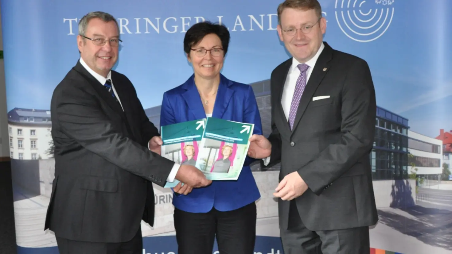 Barmer Landesgeschäftsführer Hermann Schmitt (l.) übergibt den Gesundheitsreport für Thüringer Landesbedienstete an Vize-Ministerpräsidentin Heike Taubert und Landtagspräsident Christian Carius