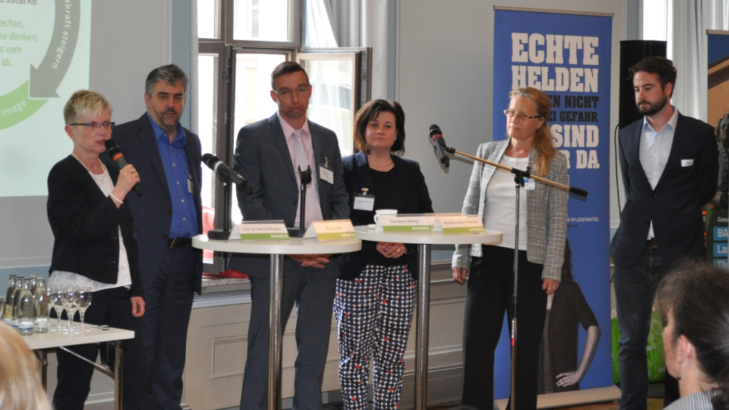 In der Podiumsdiskussion waren (v. l.) Birgit Dziuk, Prof. Heinz Rothgang, Christian Döring (Geschäftsführer Seniorenwerk Nordhausen), Andrea Jakob-Pannier (Barmer), Dr. Sigrun Fuchs (Thüringer Agentur Fachkräftegewinnung), Dr. Laurin Rötzer (RetroBrain). Foto: Barmer