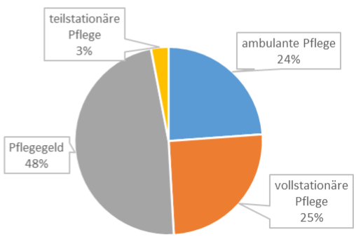 | In der Gesamtbetrachtung aller 94.000 Pflegebedürftigen erhalten 48 Prozent (rund 46.000) ein monatliches Pflegegeld. Jeder vierte lebt in einem Pflegeheim. Quelle: www.gbe-bund.de |