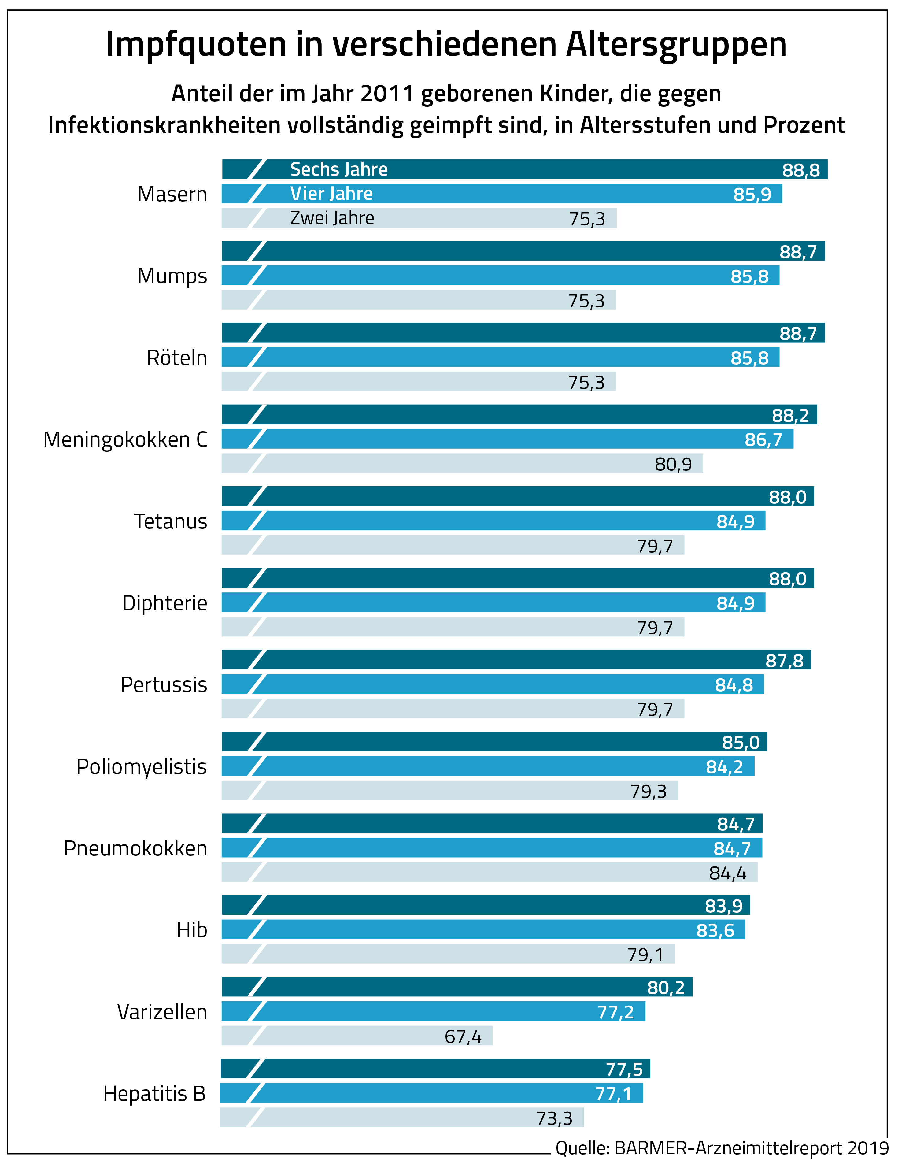 Aus dem Arzneimittelreport gehen darüber hinaus deutliche regionale Unterschiede bei den Impfquoten hervor. So waren die Impfquoten bei den Zweijährigen des Jahrgangs 2015 in Brandenburg, Hessen, Niedersachsen, Nordrhein-Westfalen, Rheinland-Pfalz und Schleswig-Holstein vergleichsweise hoch und in Baden-Württemberg, Bayern, Bremen und Thüringen hingegen gering. In Bayern waren auch 5,3 Prozent der Zweijährigen überhaupt nicht geimpft, während dies in Brandenburg nur auf 2,2 Prozent der Kleinkinder zutraf. Ein ähnliches Bild ergab sich bei den älteren Kindern. So waren in Bayern 3,5 Prozent der Sechsjährigen des Jahrganges 2011 gegen keine der 13 wichtigsten Infektionskrankheiten geimpft. In Brandenburg traf dies nur auf 1,2 Prozent zu.
