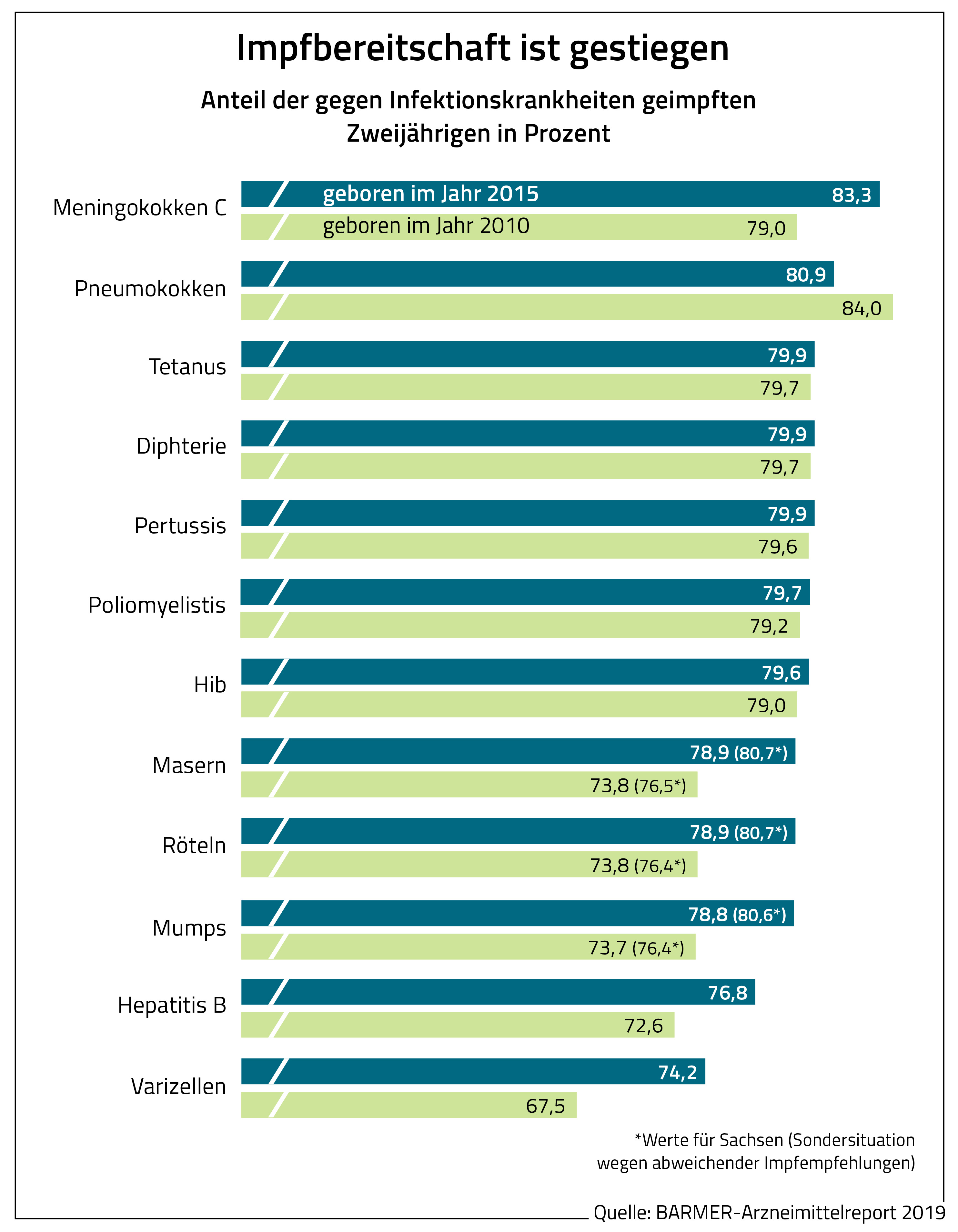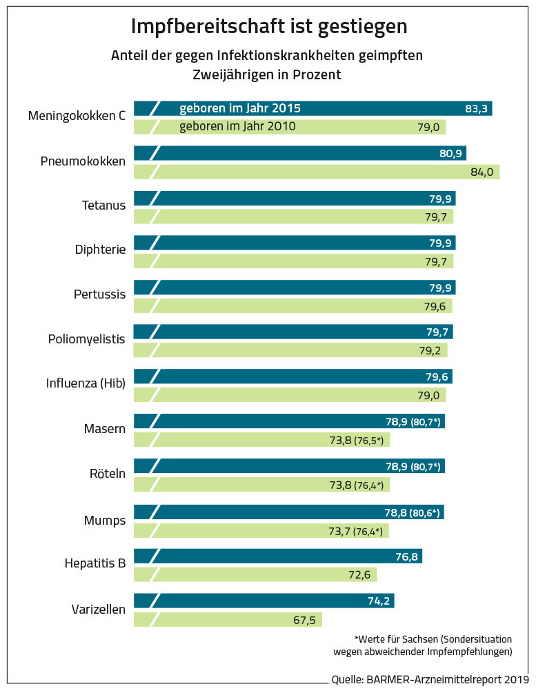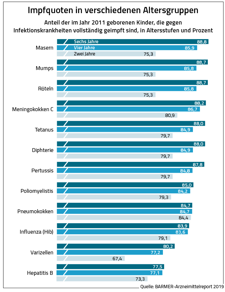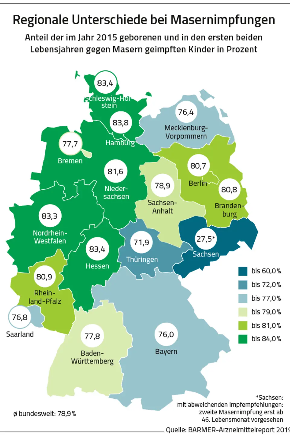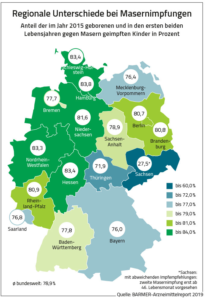 Laut Barmer-Arzneimittelreport hatten im Jahr 2017 nur 88,8 Prozent der Sechsjährigen in Deutschland den empfohlenen Masern-Impfschutz. Die Immunisierungsraten reichten von 79,7 Prozent in Sachsen bis zu 86,4 Prozent in Baden-Württemberg und 91,0 Prozent in Schleswig-Holstein. „Durch Masernimpfungen konnten allein seit der Jahrtausendwende rund 21 Millionen Todesfälle weltweit verhindert werden. Eine Masern- aber auch eine Rötelnerkrankung ist kein unvermeidbares Lebensrisiko, sondern ein Versagen der Gesundheitsvorsorge“, sagte Straub. Schließlich gehe es hier auch um den Schutz von Gefährdeten, die sich aus medizinischen Gründen nicht impfen lassen könnten oder altersbedingt für sich selbst noch keine Impfentscheidung treffen könnten.