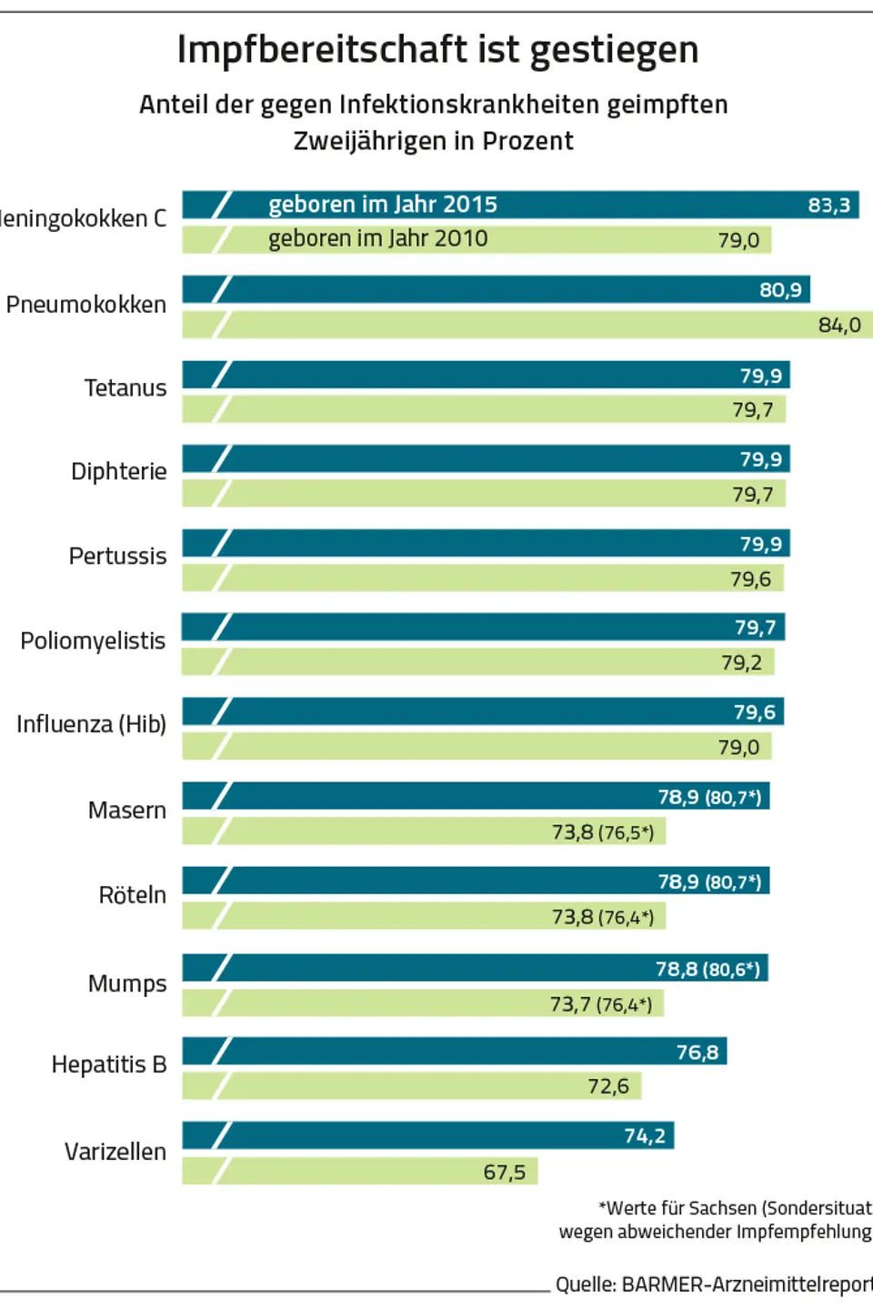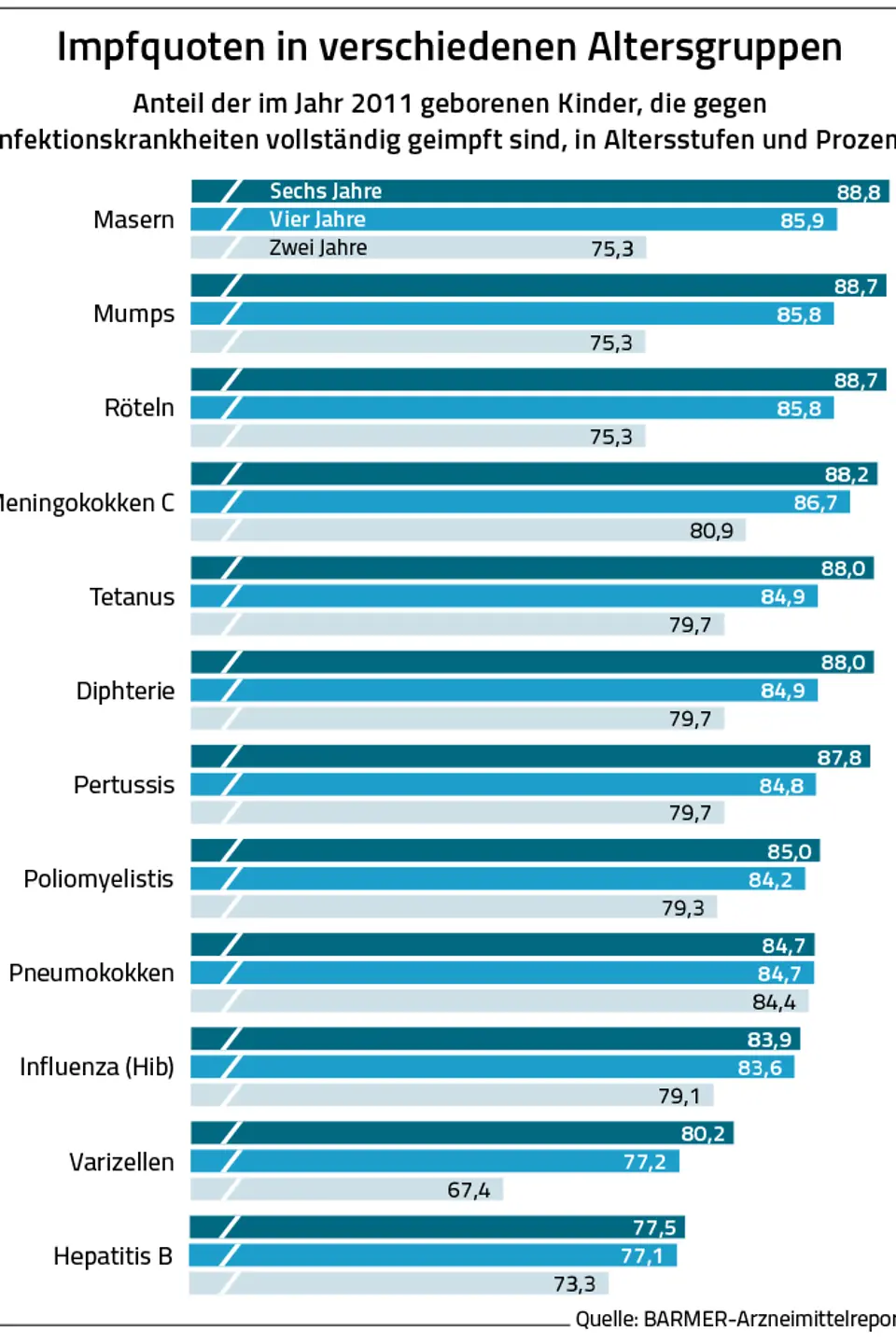 „In Deutschland werden immer noch zu wenige Kinder geimpft. Das macht die Ausrottung bestimmter Infektionskrankheiten unmöglich und verhindert den Schutz für all diejenigen, die sich nicht impfen lassen können. Wir brauchen zielgruppenspezifische Impfkampagnen, um die Skepsis und mögliche Ängste vor Impfungen abzubauen“, sagte Prof. Dr. Christoph Straub, Vorstandsvorsitzender der Barmer. Erforderlich seien auch strukturierte Fortbildungsprogramme für Ärzte, um einen adäquaten Dialog mit Impfskeptikern zu trainieren.