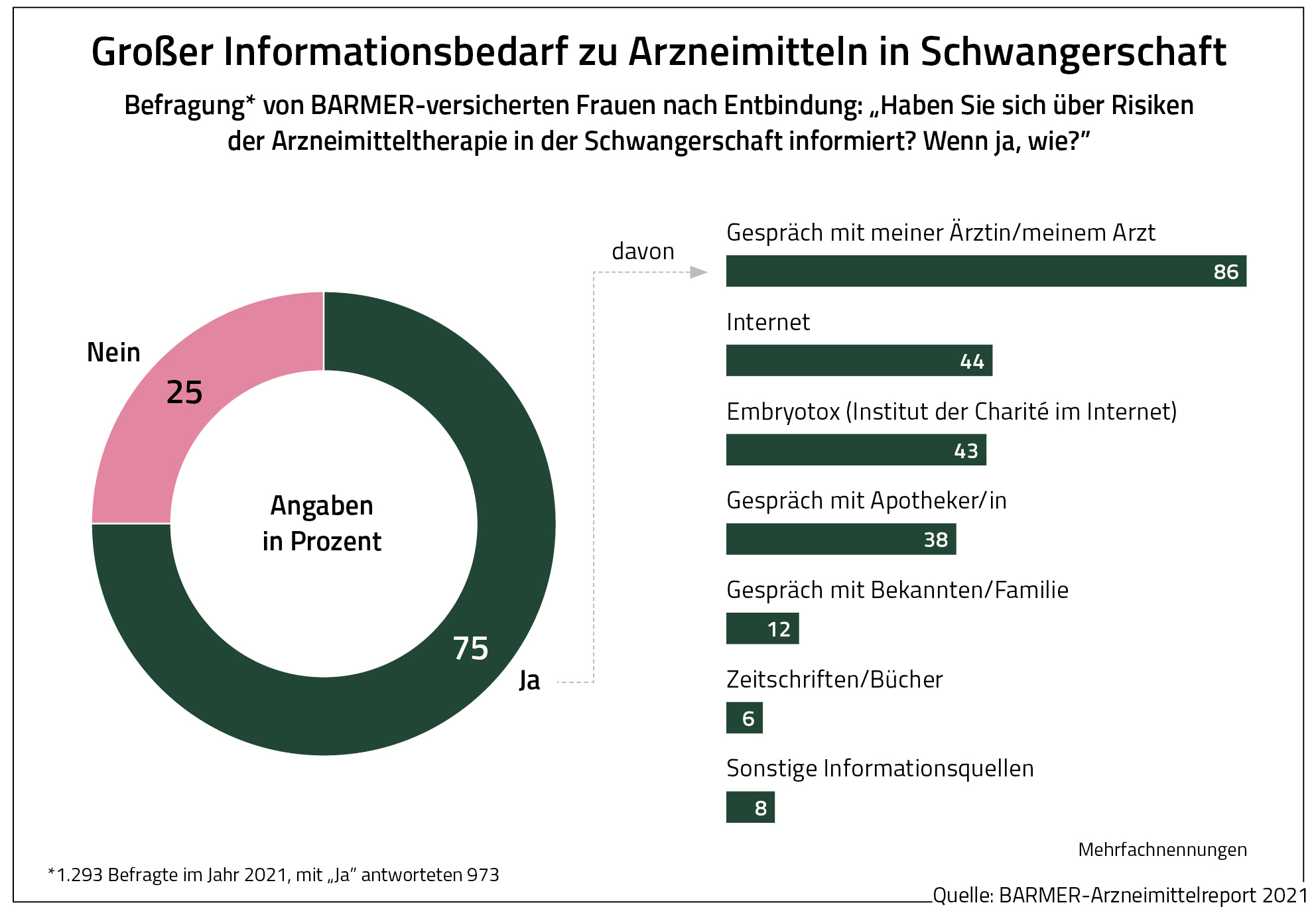Wie aus dem Arzneimittelreport weiter hervorgeht, bekommen Frauen auch im späteren Verlauf der Schwangerschaft Arzneimittel mit Risiken der Schädigung des ungeborenen Kindes verordnet. Demnach traf dies auf 1.210 Barmer-versicherte Frauen mit Entbindung im Jahr 2018 zu. „Zu einem späten Zeitpunkt der Schwangerschaft sind solche Arzneimittel im Einzelfall eventuell akzeptabel, weil die Gefahr für Missbildungen und Schädigungen des Kindes dann etwas geringer ist. Deren Verabreichung muss dann aber zwingend im Medikationsplan stehen“, forderte Grandt. Für einen bestmöglichen Schutz sei ein weiterer Schritt erforderlich. In Großbritannien etwa gelte das Verschreiben eines teratogenen Arzneimittels in der Schwangerschaft als „never event“. Das seien Ereignisse, die grundsätzlich vermeidbar seien und solche katastrophalen Konsequenzen hätten, dass sie nie auftreten dürften. „In Deutschland muss die Verordnung teratogener Arzneimittel ebenfalls zum ,never event‘ werden, zumindest in der Frühschwangerschaft“, sagte Barmer-Vorstandschef Straub.