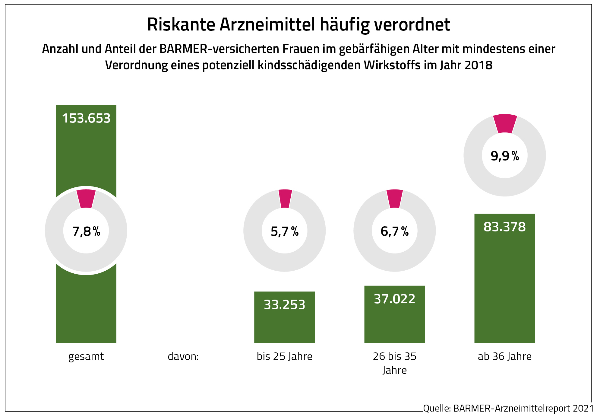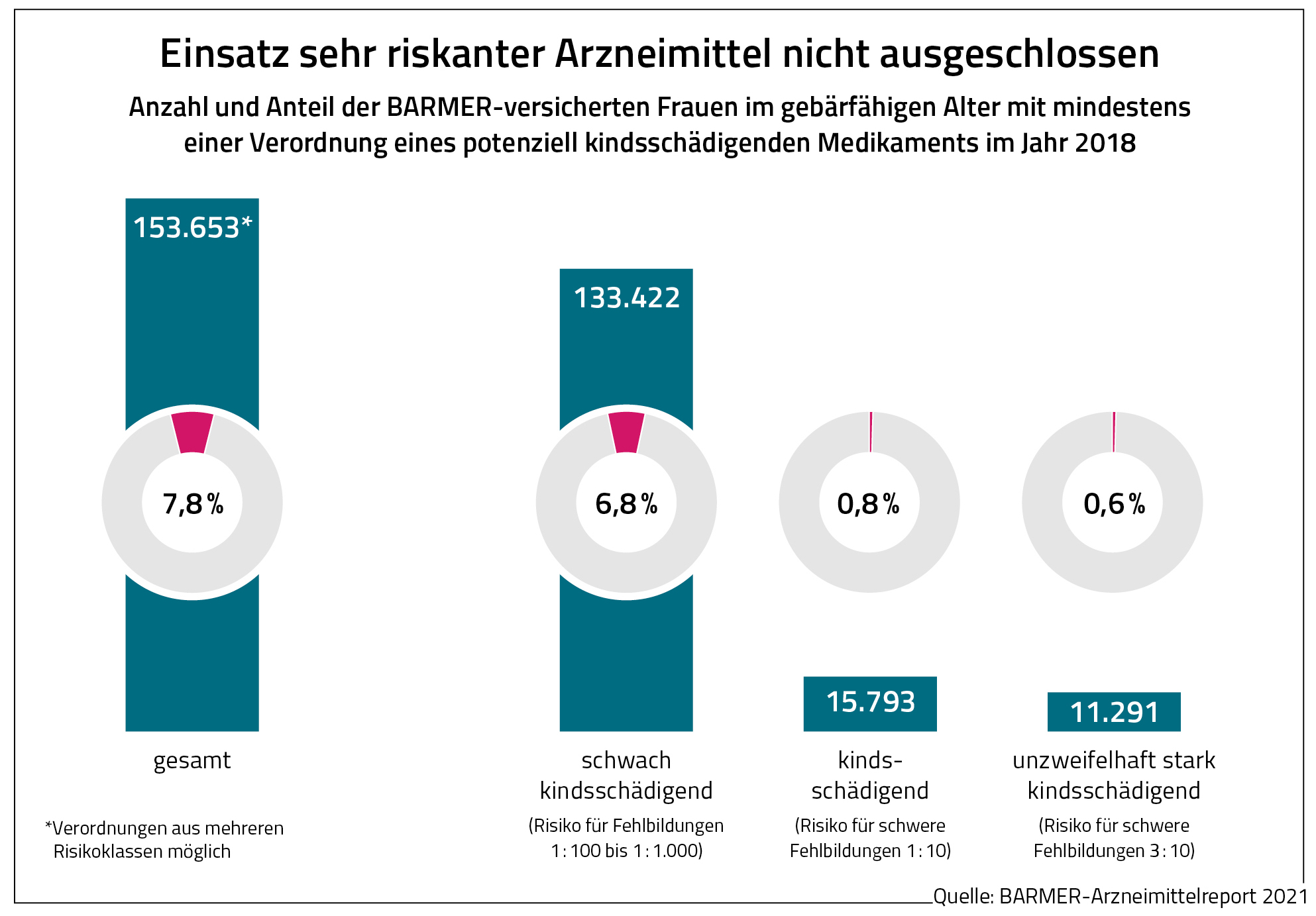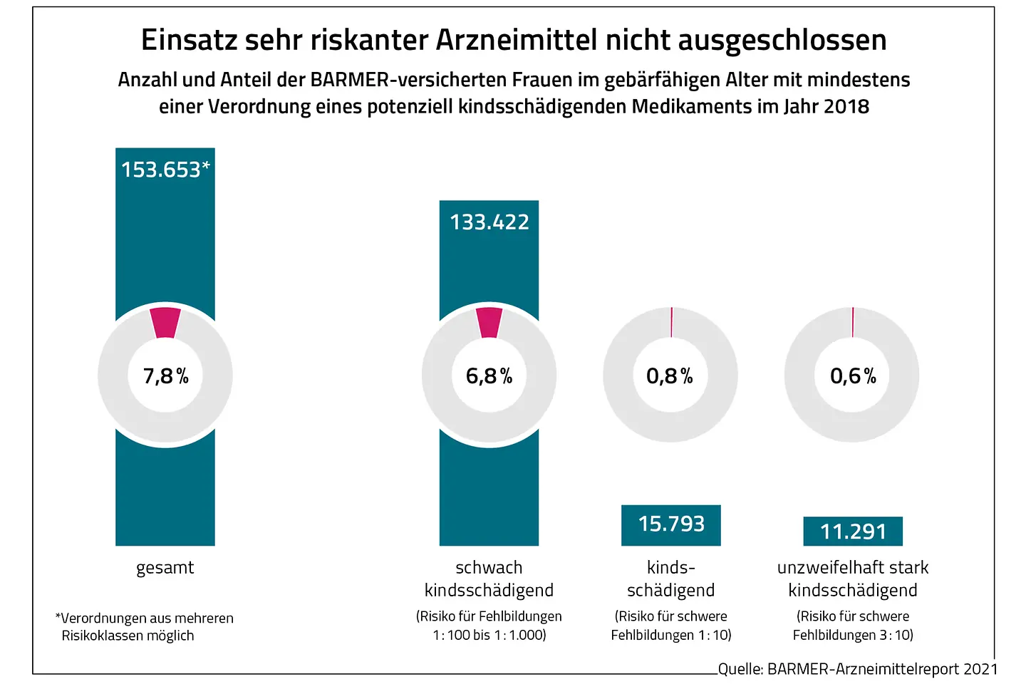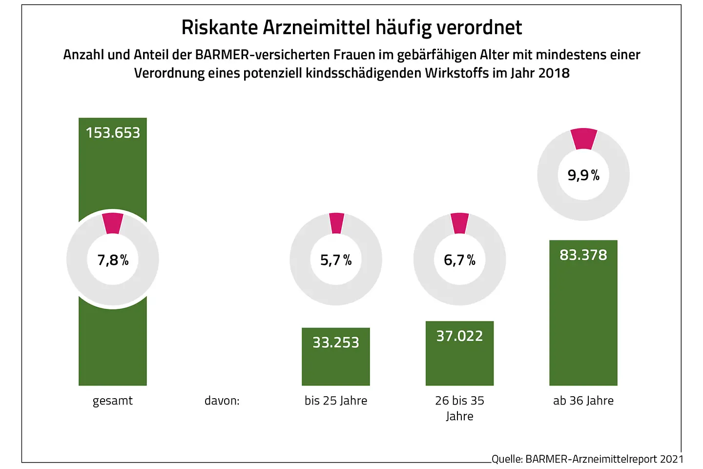 Berlin, 12. August 2021 – Viele Frauen im gebärfähigen Alter bekommen potenziell kindsschädigende Arzneimittel verordnet, auch Teratogene genannt. Allein bei der Barmer waren im Jahr 2018 fast 154.000 Frauen zwischen 13 und 49 Jahren davon betroffen. Problematisch wird deren Einnahme ab dem Beginn der Schwangerschaft. Im ersten Schwangerschaftsdrittel bekamen 663 von rund 66.500 Barmer-Versicherten mit Entbindung im Jahr 2018 Teratogene verordnet. Das geht aus dem Arzneimittelreport 2021 hervor, den die Barmer am Donnerstag vorgestellt hat.
