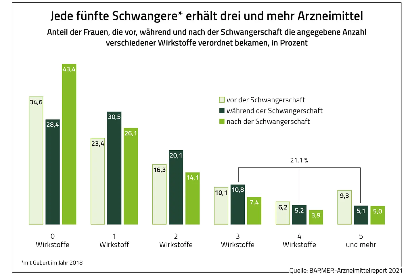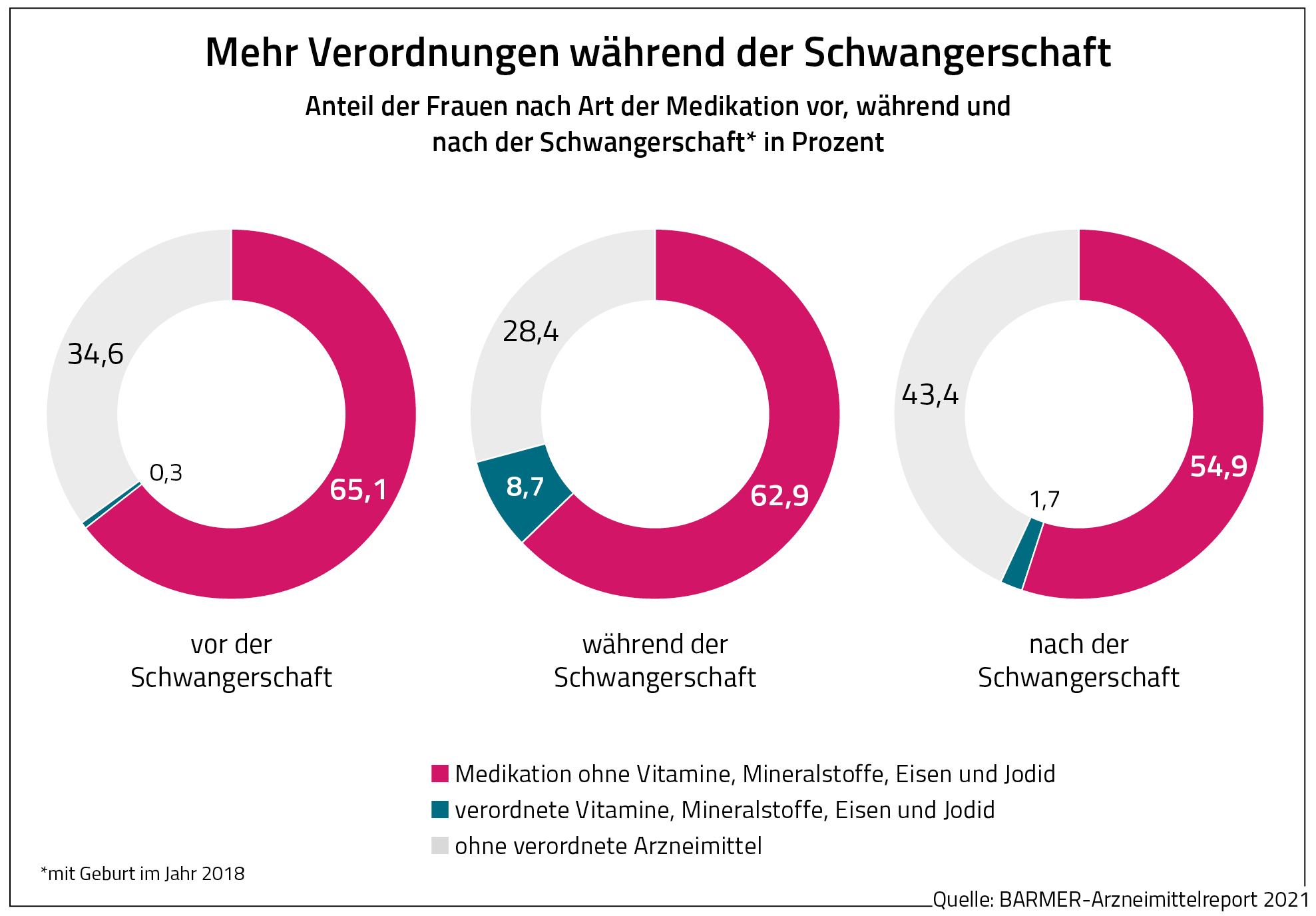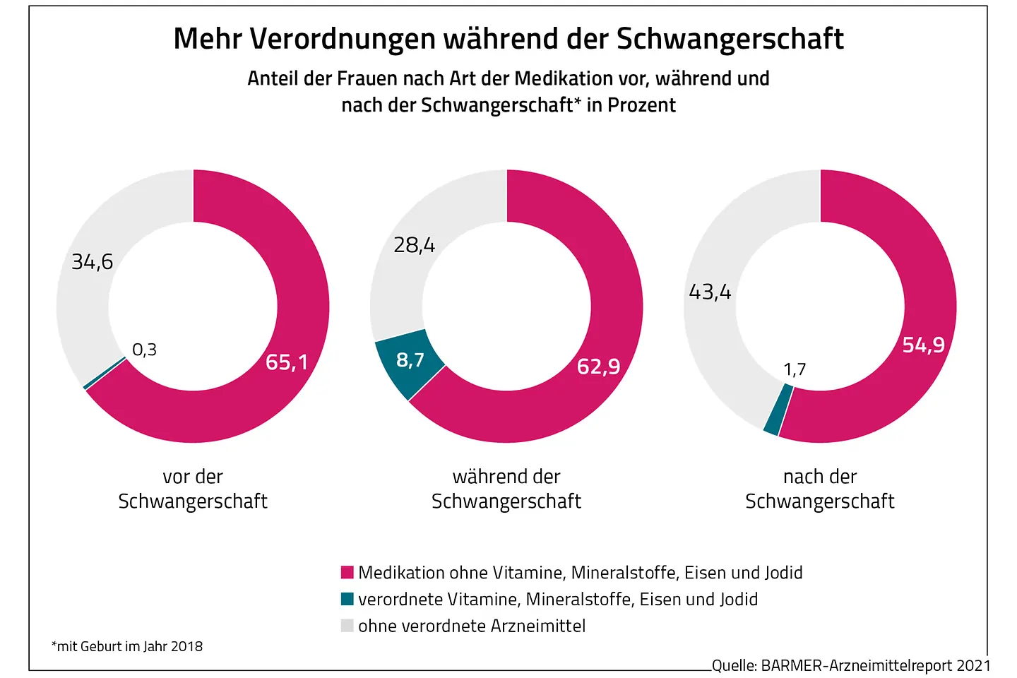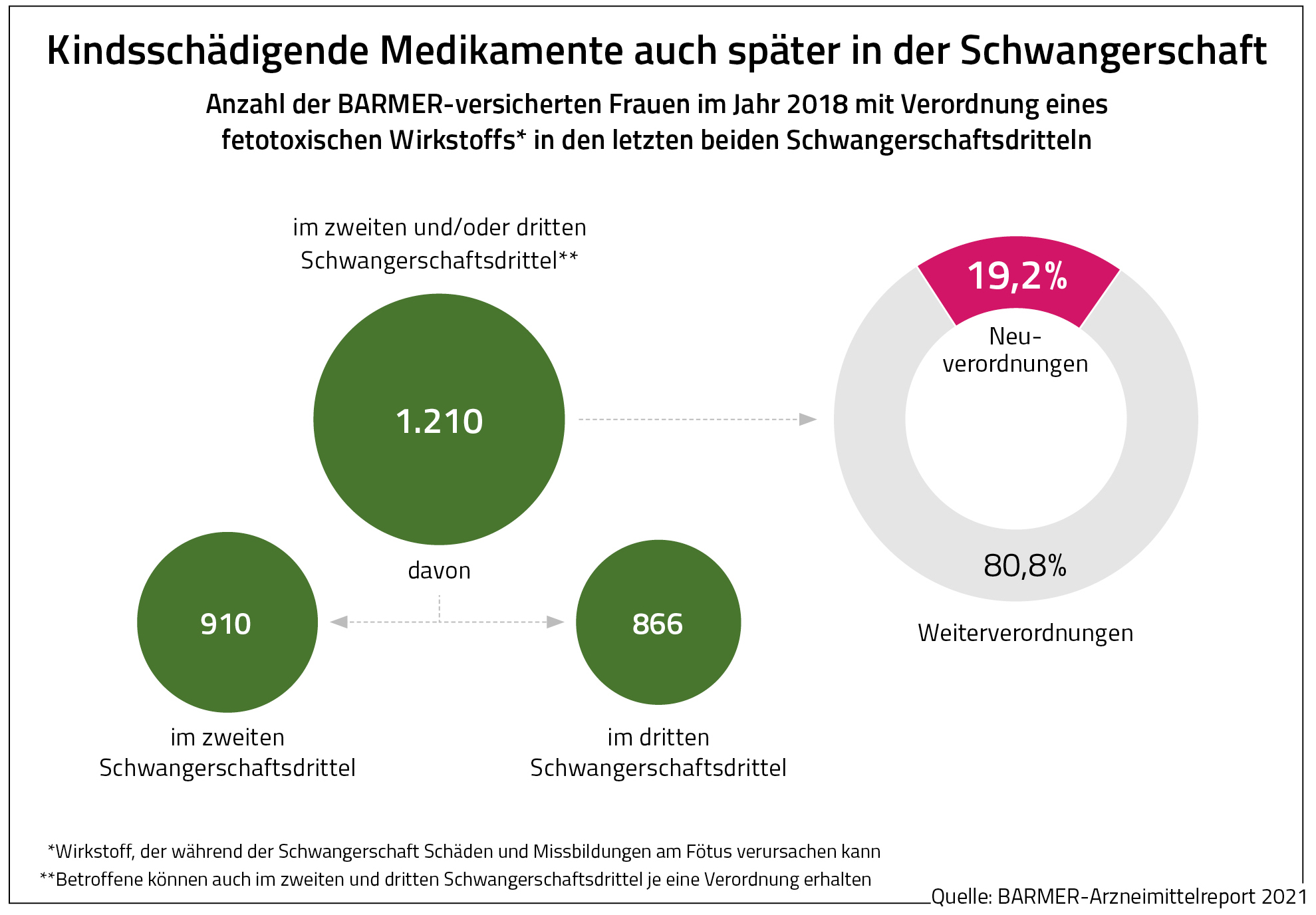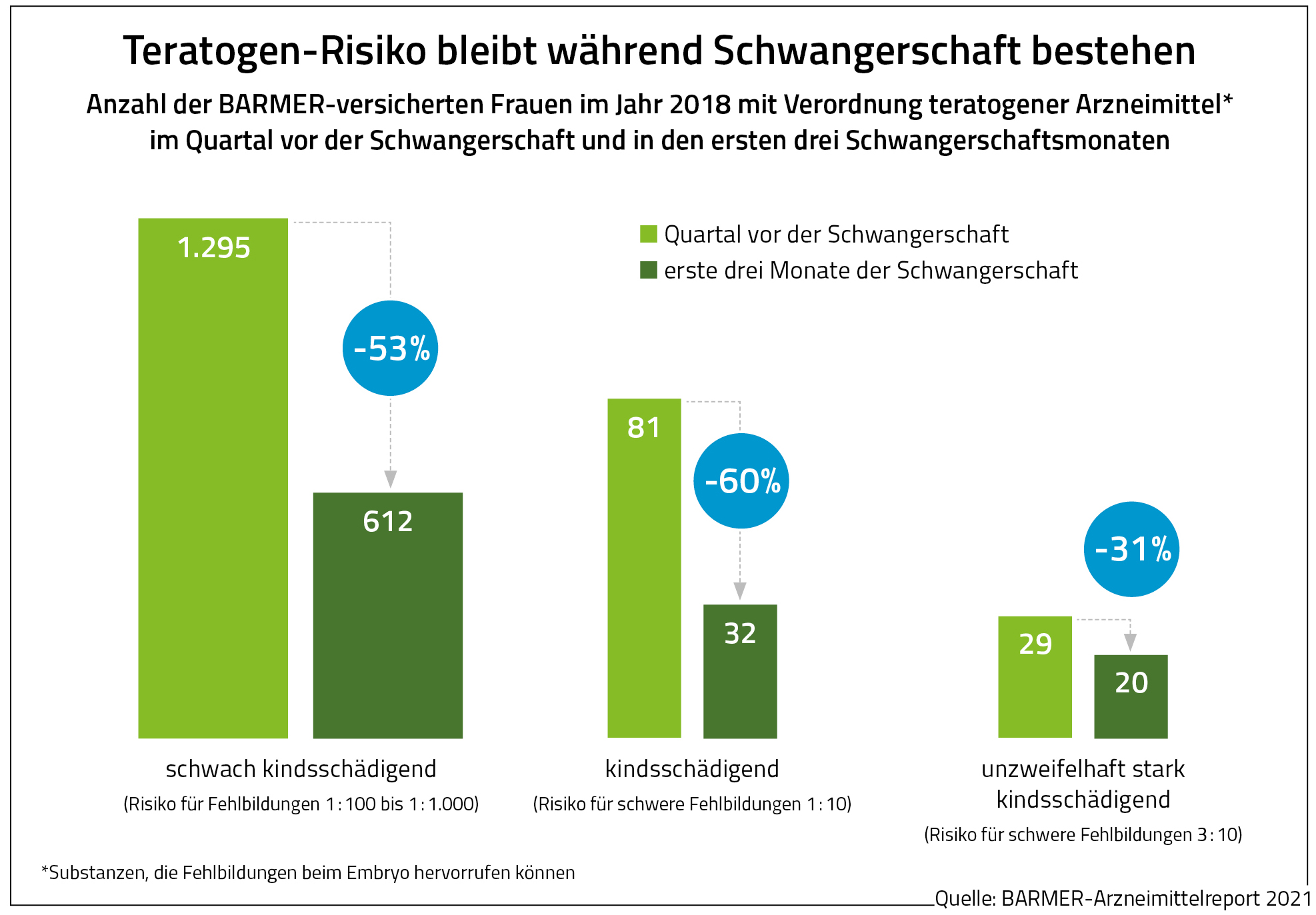 Berlin, 12. August 2021 – Viele Frauen im gebärfähigen Alter bekommen potenziell kindsschädigende Arzneimittel verordnet, auch Teratogene genannt. Allein bei der Barmer waren im Jahr 2018 fast 154.000 Frauen zwischen 13 und 49 Jahren davon betroffen. Problematisch wird deren Einnahme ab dem Beginn der Schwangerschaft. Im ersten Schwangerschaftsdrittel bekamen 663 von rund 66.500 Barmer-Versicherten mit Entbindung im Jahr 2018 Teratogene verordnet. Das geht aus dem Arzneimittelreport 2021 hervor, den die Barmer am Donnerstag vorgestellt hat.