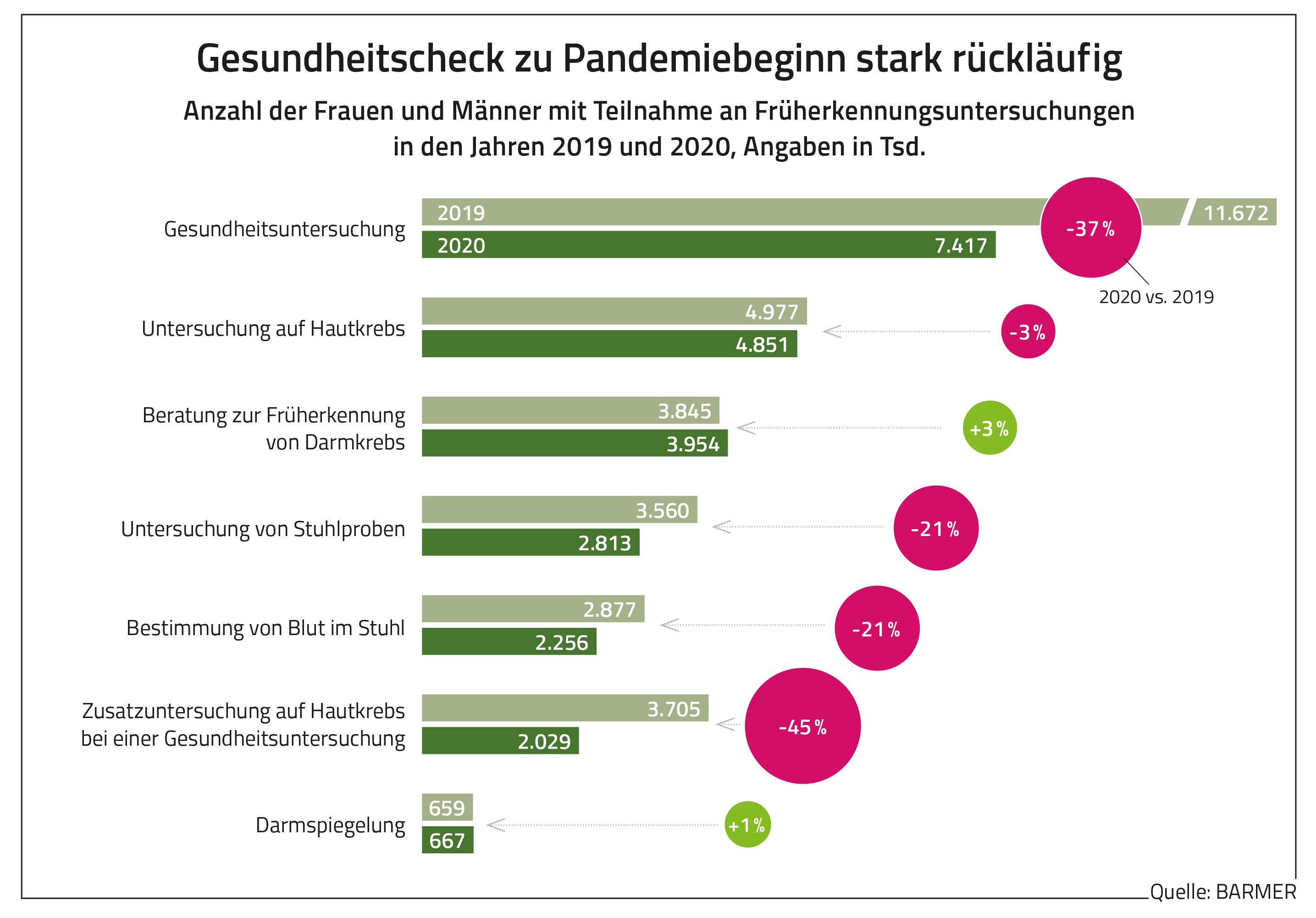 Laut Barmer-Arztreport ist vom Jahr 2019 auf 2020 allein die Zahl der Gesundheitsuntersuchungen bei Erwachsenen von rund 11,7 Millionen auf 7,4 Millionen in Deutschland zurückgegangen. Das entspricht einem Minus von 37 Prozent. Bei der Hautkrebsfrüherkennungsuntersuchung sank die Zahl der Tests von 8,7 Millionen auf 6,9 Millionen und bei den Tests auf verborgenes Blut im Stuhl zur Darmkrebsfrüherkennung von 3,6 Millionen auf etwa 2,8 Millionen. Der Rückgang beträgt hier jeweils mehr als 20 Prozent. "Darmkrebs ist besonders tückisch, weil er lange Zeit symptomlos bleibt. Deshalb ist die Darmkrebsvorsorge besonders wichtig", sagt Prof. Dr. Joachim Szecsenyi, Autor des Arztreports und Geschäftsführer des aQua-Instituts in Göttingen. Gerade in Pandemiezeiten, in der Menschen aus Sorge vor einer Infektion nicht in die Arztpraxis gingen, sei ein niedrigschwelliger Zugang zu Früherkennungsuntersuchungen wichtig. Deshalb habe die Barmer ihr Vorsorgeprogramm erweitert und biete mit der „Digitalen Darmkrebsfrüherkennung“ erstmals einen Test für zu Hause an, so Straub. Dabei würden Anspruchsberechtigte über die Barmer-App zur Früherkennung eingeladen. Per Link könne ein immunologischer Stuhltest angefordert und zur kostenlosen Auswertung in ein Labor geschickt werden. Der Befund würde dann per Brief mitgeteilt. Den Test könnten Barmer-Versicherte bereits ab dem Alter von 40 Jahren erhalten. Gesetzlich sei er erst ab 50 Jahren vorgesehen.
