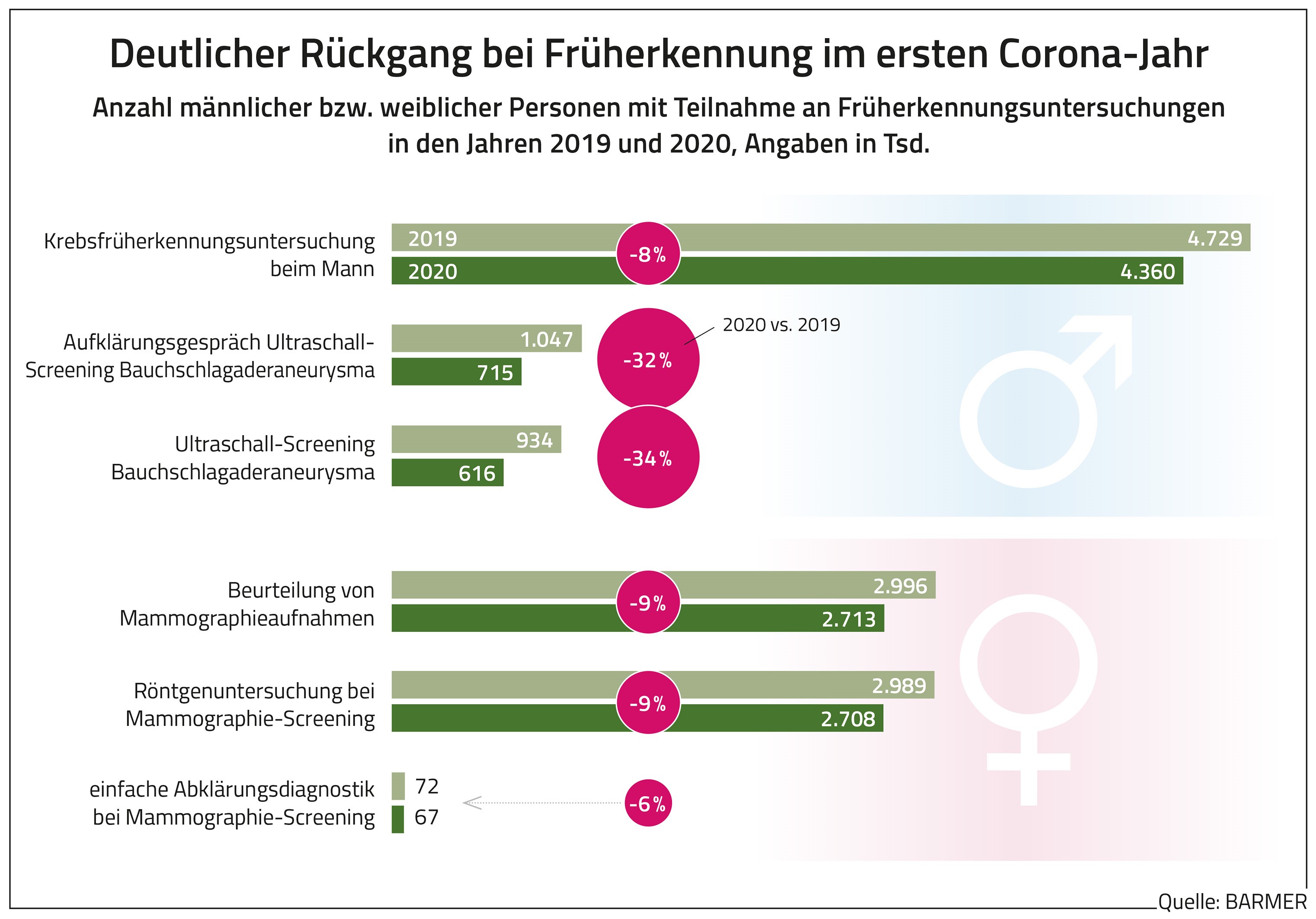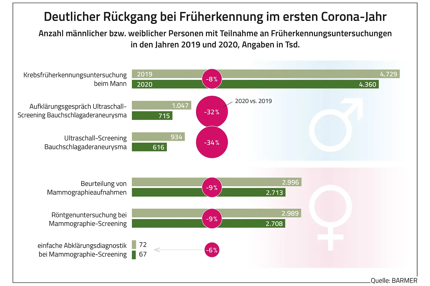 Laut dem Arztreport der Barmer ist darüber hinaus die Brustkrebsfrüherkennung in der Pandemie weniger in Anspruch genommen worden. So sank die Zahl der Teilnehmerinnen am Mammographie-Screening von knapp drei Millionen auf 2,7 Millionen. Das entspricht einem Rückgang um 9,4 Prozent vom Jahr 2019 auf 2020. „Zu Beginn der Pandemie war das Einladungsverfahren zum Mammographie-Screening ausgesetzt, weil in den Praxen Schutzausrüstungen fehlten. Das darf sich nicht wiederholen. Die Schutzmaterialien sollten zentralisiert vorgehalten werden, damit zum Beispiel Früherkennungsuntersuchungen nicht wieder ausgesetzt werden müssen“, fordert Barmer-Vorstandsvorsitzender Straub.