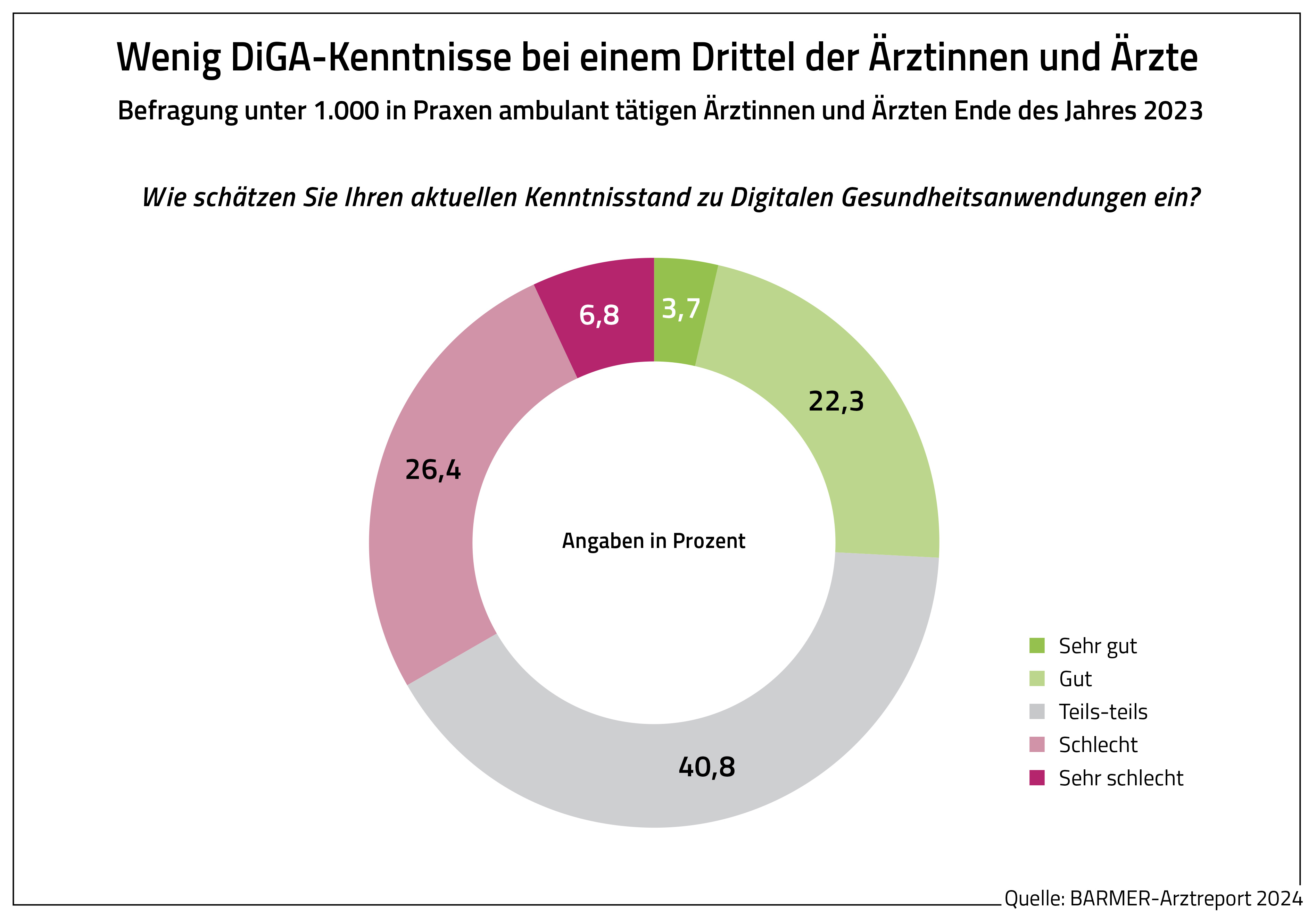 Berlin, 27. Februar 2024 – Beim Einsatz von Digitalen Gesundheitsanwendungen (DiGA) wie etwa zertifizierten Gesundheits-Apps gibt es nach wie vor viele Unsicherheiten. Das ist das zentrale Ergebnis des diesjährigen Barmer-Arztreports. Er basiert neben Routinedaten auf Umfragen unter mehr als 1.700 Patientinnen und Patienten sowie unter 1.000 Ärztinnen, Ärzten, Psychotherapeutinnen und Psychotherapeuten mit Patientenkontakt. Obwohl die Verordnung von DiGA seit Herbst 2020 auf Kassenkosten möglich ist, sind sie dem Arztreport zufolge noch lange nicht in der medizinischen Versorgung Deutschlands angekommen. In zwölf Monaten vor der Befragung Ende 2023 hatten 44 Prozent der Behandelnden keine DiGA verordnet, ein Drittel bescheinigte sich selbst einen schlechten Kenntnisstand zum Thema. „Digitale Gesundheitsanwendungen sind für viele Menschen immer noch eine Blackbox. Zu wenig Detailwissen und falsche Erwartungen führen dazu, dass DiGA zurückhaltend verordnet werden und deren Einsatz oftmals vorzeitig abgebrochen wird“, sagte der Vorstandsvorsitzende der BARMER, Prof. Dr. med. Christoph Straub. Zu kurz genutzte DiGA verursachten jedoch Kosten ohne einen nennenswerten Nutzen. Deshalb brauche es für die Versicherten einen Testzeitraum von 14 Tagen anstatt der bislang gängigen Verordnung über 90 Tage.