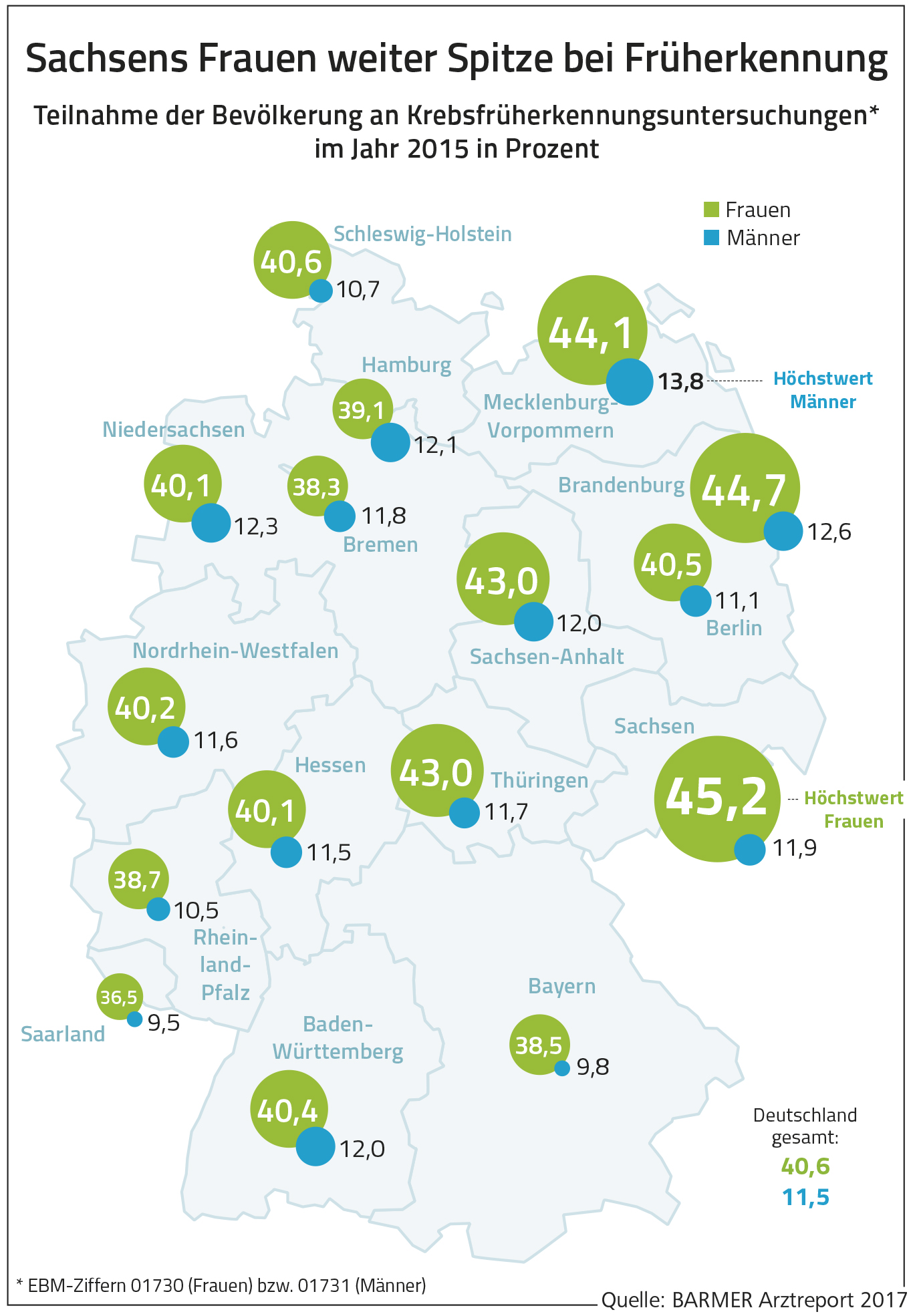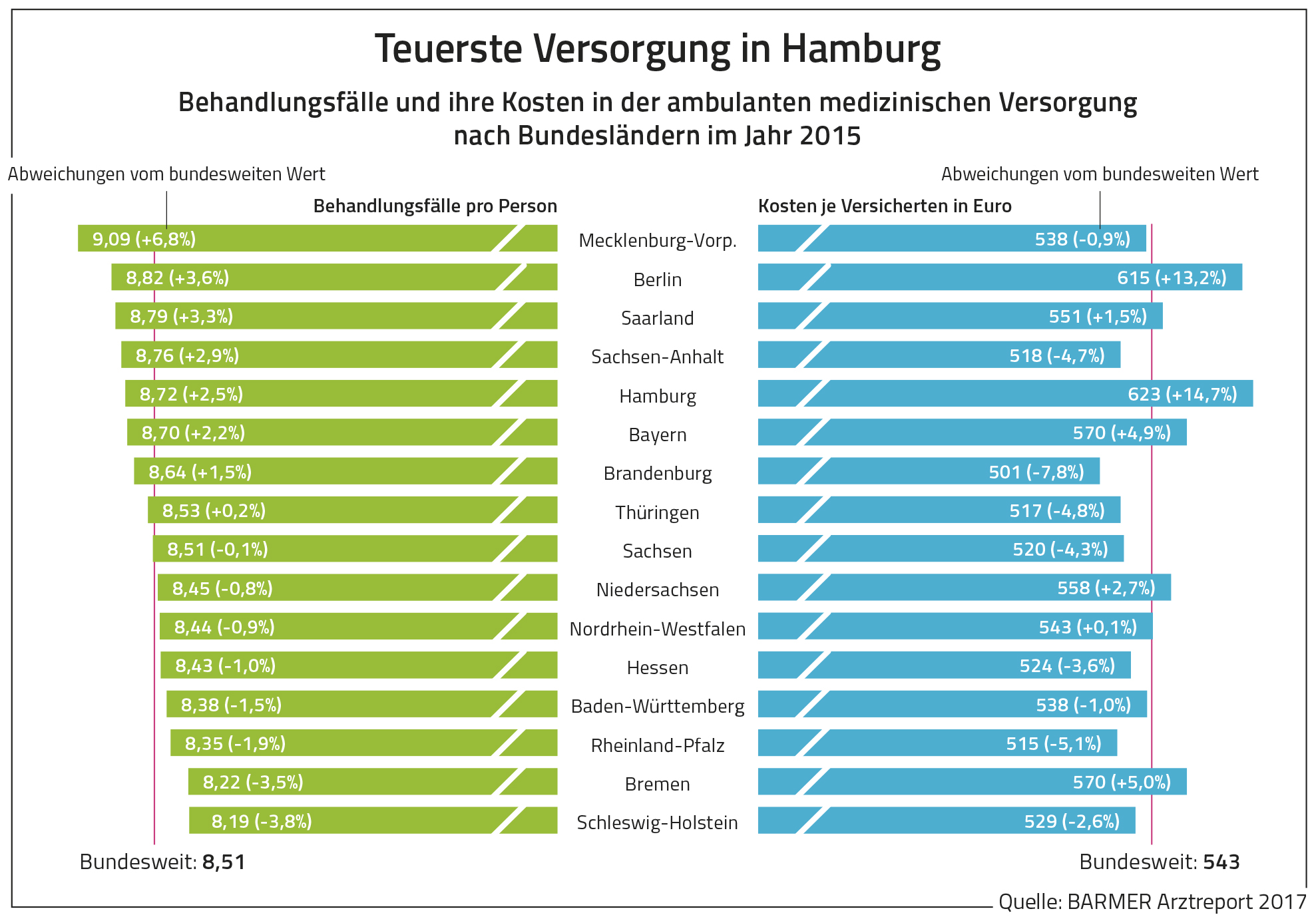 Behandlungskosten: Die geringsten durchschnittlichen Behandlungskosten in der ambulanten medizinischen Versorgung hatte im Jahr 2015 die Gruppe der 20- bis 24-jährigen Männer mit 209 Euro. Die höchsten Ausgaben benötigten Männer zwischen 85 und 89 Jahren mit durchschnittlichen Kosten von 1.153 Euro. Altersübergreifend lagen die durchschnittlichen jährlichen Behandlungskosten für Männer bei 469 und für Frauen bei 615 Euro (Report Seite 228). Im Bundeslandvergleich liegen die Ausgaben für die Gesamtheit der Versicherten in den Stadtstaaten Hamburg und Berlin mit 623 bzw. 615 Euro um 14,7 bzw. 13,2 Prozent über dem Bundesdurchschnitt von 543 Euro. Dagegen werden die durchschnittlichen bundesweiten Kosten in Brandenburg mit 501 Euro um 7,8 Prozent unterschritten (im Report Seite 69).