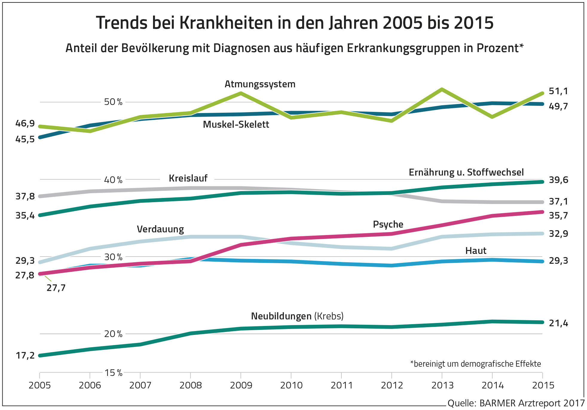 Betroffenheit von Erkrankungen: Der Arztreport vermittelt einen Eindruck davon, wie viele Menschen in Deutschland von einzelnen Krankheiten betroffen sind. Krankheiten der Wirbelsäule und des Rückens wurden 2015 beispielsweise bei mehr als einem Drittel der Einwohner diagnostiziert, eine Hypertonie bei 29 Prozent, was rund 29 Millionen Betroffenen mit Rückenschmerzen, Bandscheibenprobleme, Hexenschuss und Co. sowie 23,5 Millionen Menschen mit Bluthochdruck entspricht (im Report auf Seite 80).