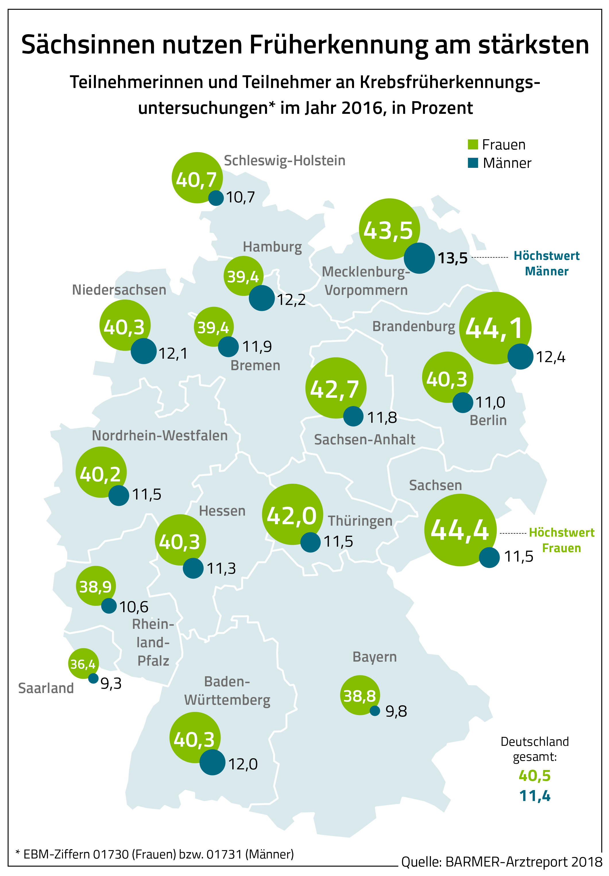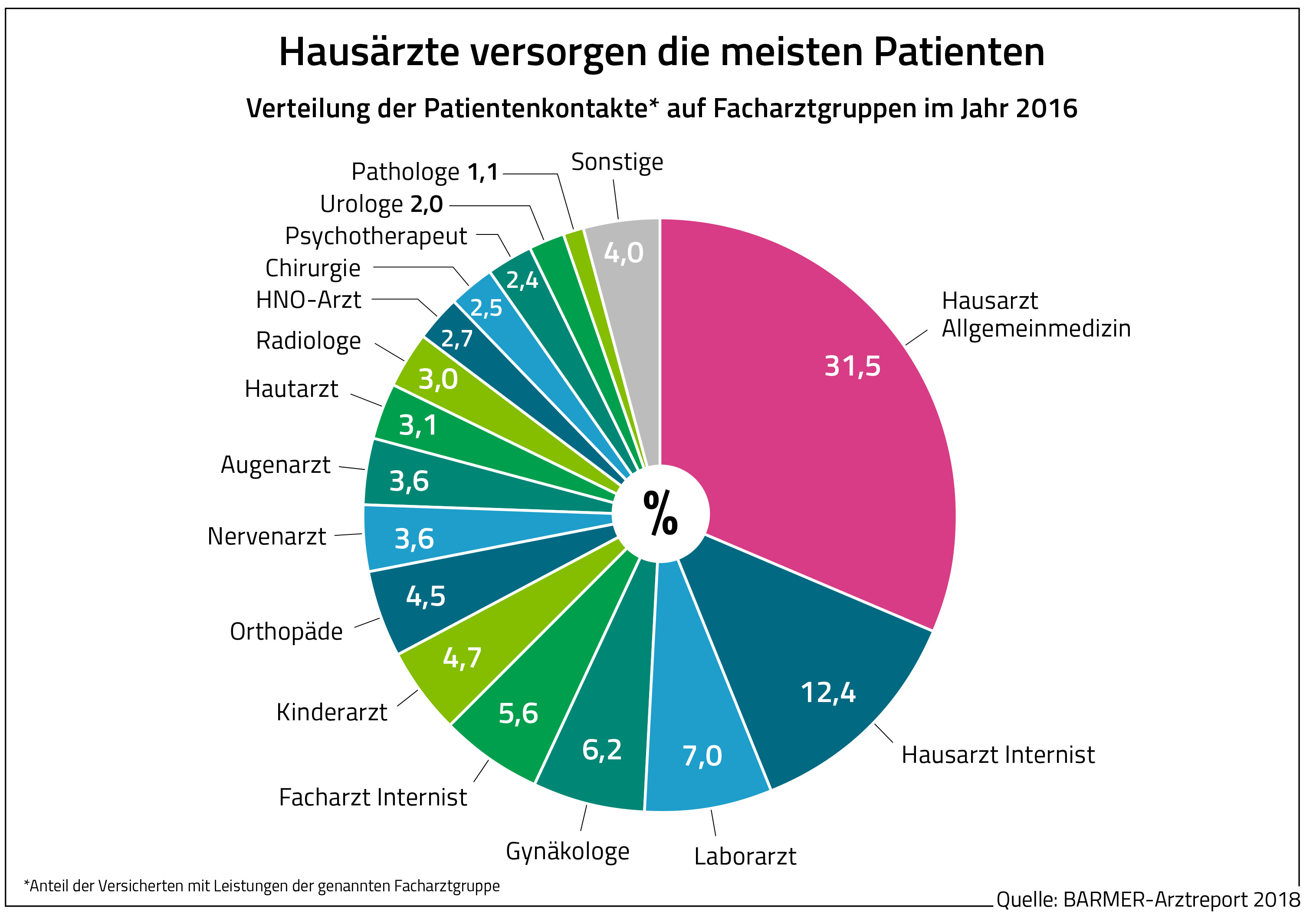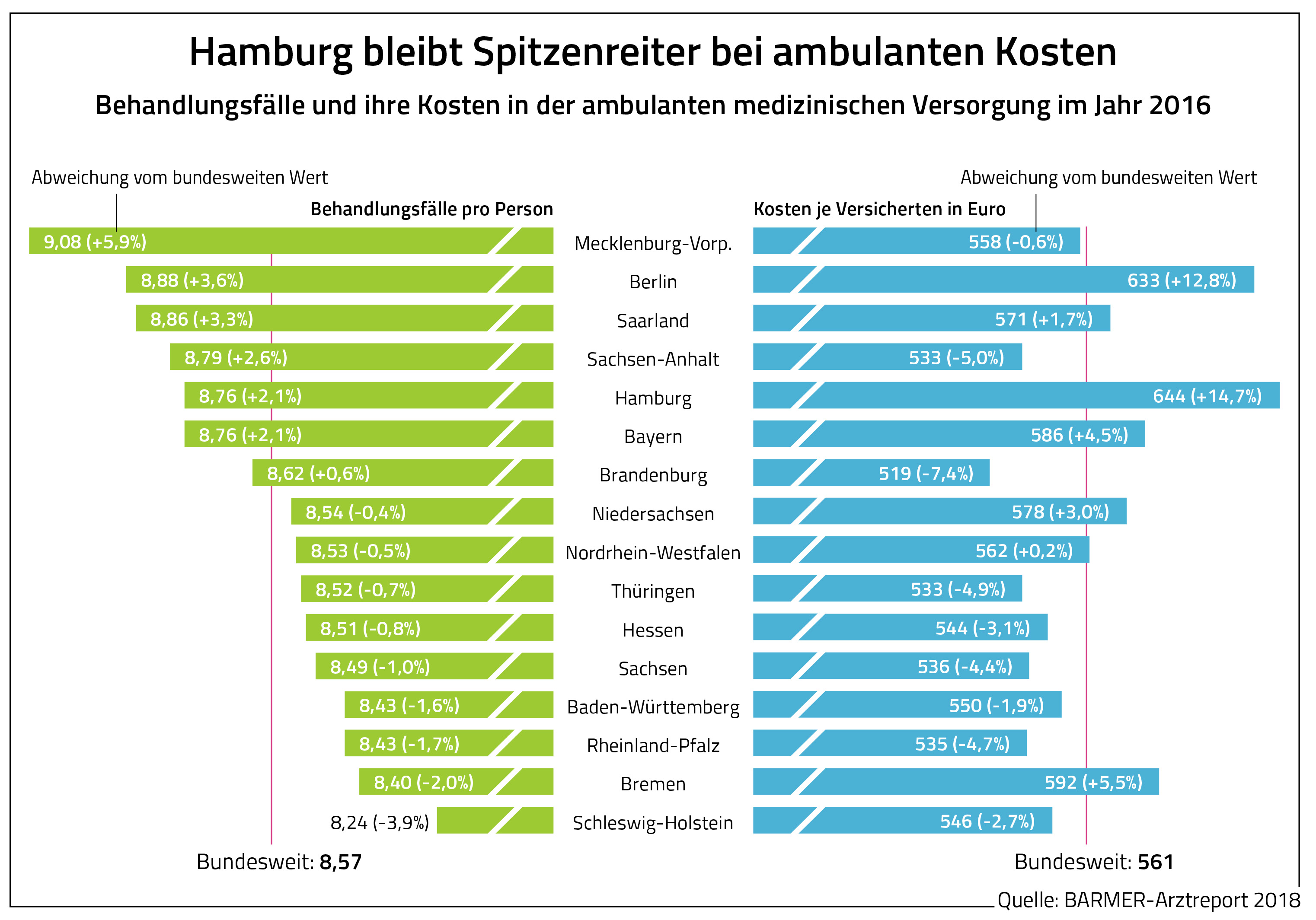 • Behandlungsfälle: Für das Jahr 2016 weist der Barmer-Arztreport eine Behandlungsrate von 93,1 Prozent aus, das heißt, dass von 100 Versicherten nur sieben keine ambulante ärztliche Versorgung benötigten. Hochgerechnet auf die bundesdeutsche Bevölkerung bedeutet dies, dass etwa 76,1 Millionen Menschen ambulante medizinische Hilfe benötigt haben. Dabei ergaben sich bei Männern 7,07 Behandlungsfälle und bei Frauen 10,03, woraus sich ein Gesamtwert von 8,57 Behandlungsfällen im Jahr 2016 errechnet. Das entspricht etwa 700 Millionen einzelnen Behandlungsfällen (im Report Seite 49).