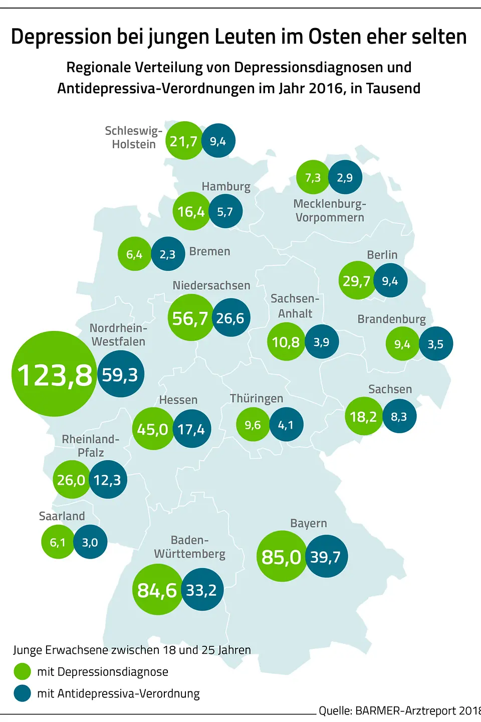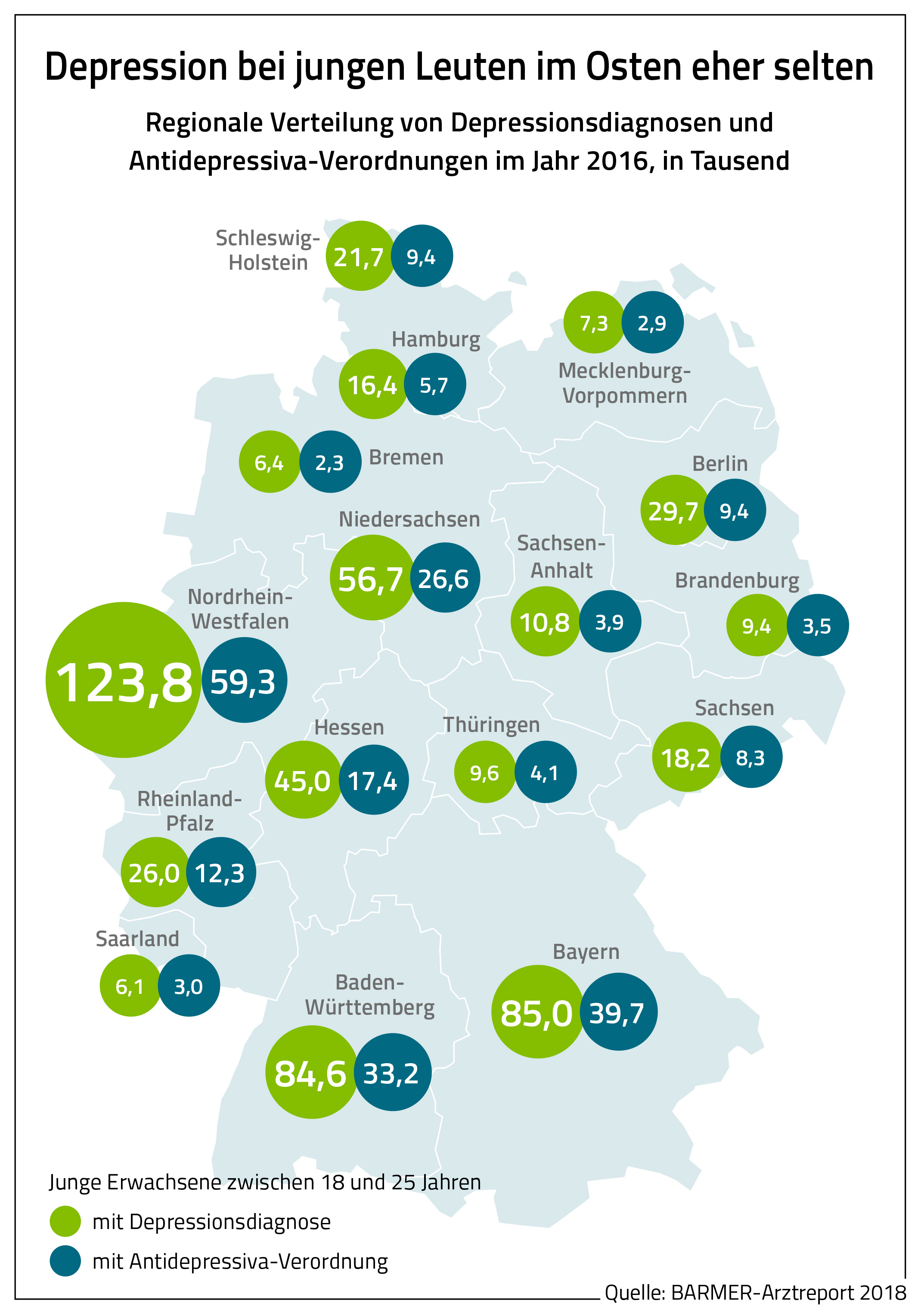 Bei Studierenden steige mit zunehmendem Alter das Risiko für eine Depression deutlich. Im 18. Lebensjahr erkrankten 1,4 Prozent der Studierenden erstmals an einer Depression, bei den Nicht-Studierenden seien es 3,2 Prozent. Gut zehn Jahre später liege der Anteil bei den Studierenden bei 3,9 Prozent und bei den Nicht-Studierenden bei 2,7 Prozent. Ältere Studierende seien somit besonders gefährdet. Psychische Erkrankungen könnten zudem bereits in der Jugend einen Einfluss darauf haben, ob später ein Studium aufgenommen wird. „Bei Jugendlichen mit einer psychischen Störung im Alter von 17 Jahren ist die Wahrscheinlichkeit für eine Studienaufnahme in den Folgejahren um etwa ein Drittel reduziert“, sagte der Autor des Arztreports und Geschäftsführer des aQua-Instituts in Göttingen, Prof. Dr. Joachim Szecsenyi.