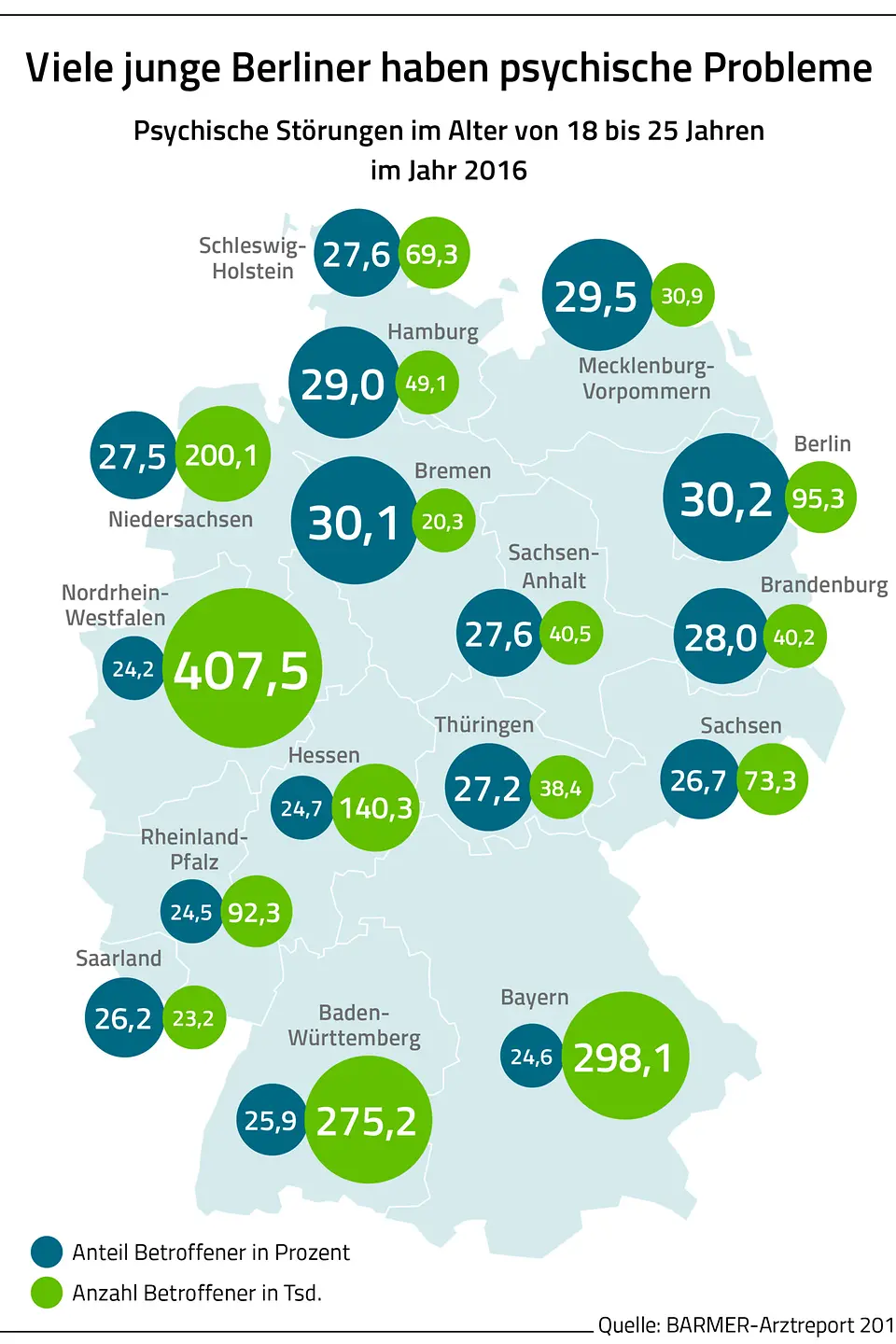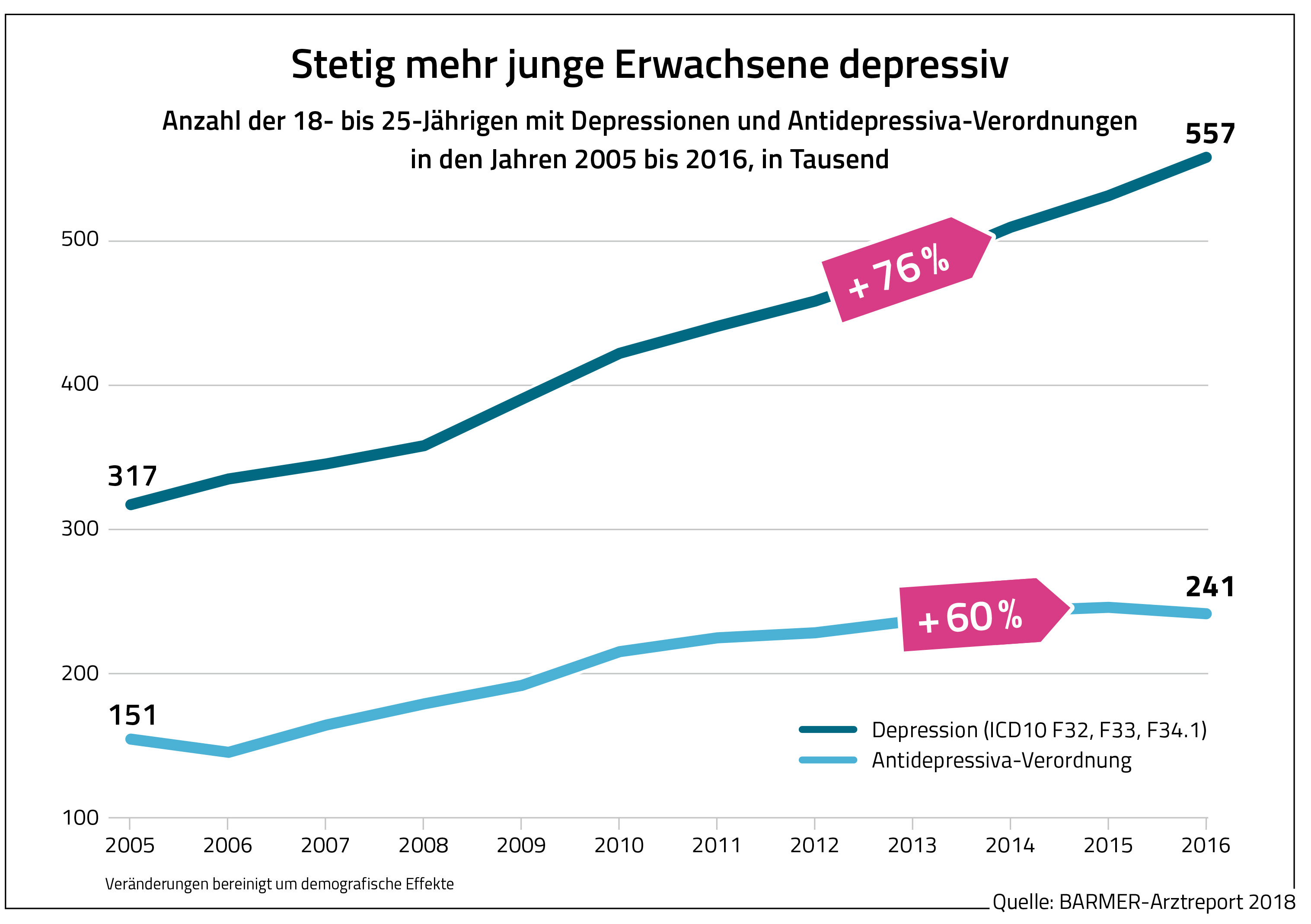 Berlin, 22. Februar 2018 – Immer mehr junge Erwachsene leiden unter psychischen Erkrankungen wie Depressionen, Angststörungen oder Panikattacken. Allein zwischen den Jahren 2005 bis 2016 ist der Anteil der 18- bis 25-Jährigen mit psychischen Diagnosen um 38 Prozent und darunter bei Depressionen um 76 Prozent gestiegen. Diese Zahlen stammen aus dem Barmer-Arztreport 2018, der heute in Berlin vorgestellt wurde. Demnach ist selbst bei den Studierenden, die bislang als weitgehend „gesunde“ Gruppe galten, inzwischen mehr als jeder sechste (17 Prozent) von einer psychischen Diagnose betroffen. Das entspricht rund 470.000 Personen.