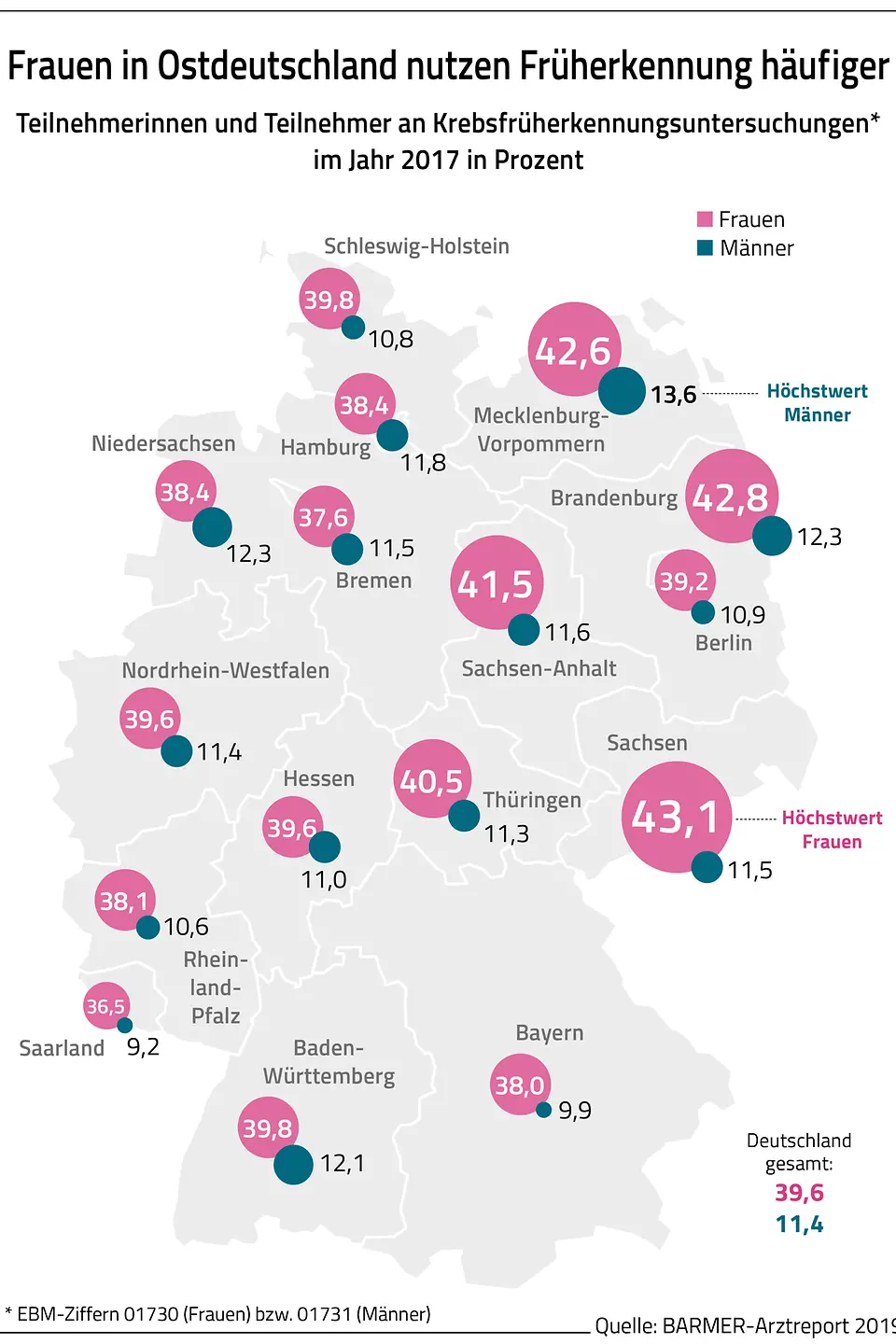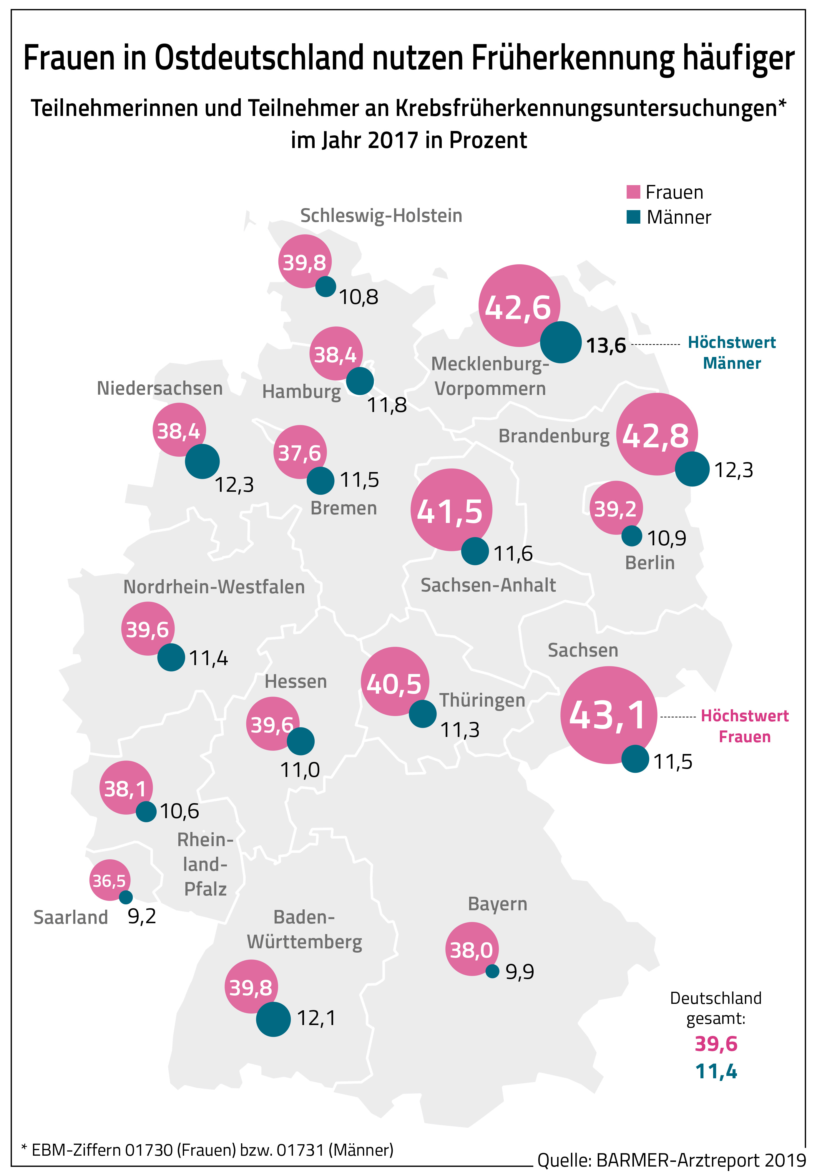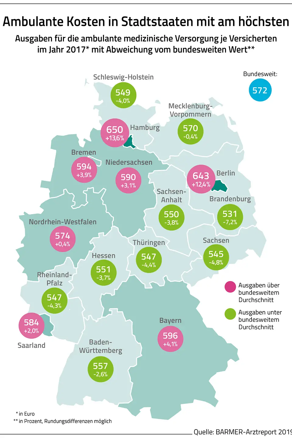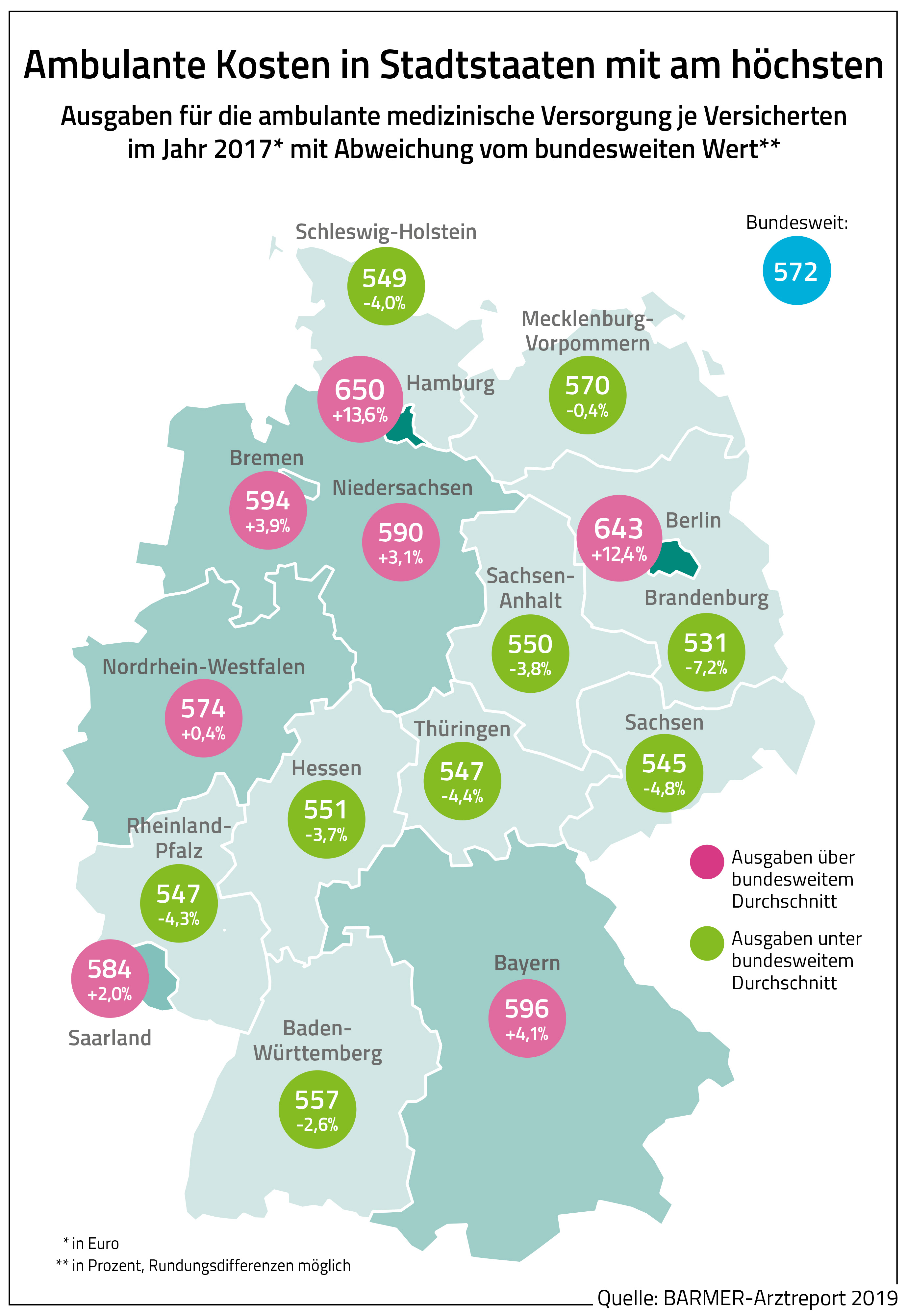 Vor allem in Hamburg und Berlin waren im Jahr 2017 die Behandlungskosten je Versicherten vergleichsweise hoch. Mit 650 Euro in der Hansestadt und mit 643 Euro in der Hauptstadt lagen sie um 13,6 beziehungsweise 12,4 Prozent über dem Bundesdurchschnitt von 572 Euro. Die geringsten Kosten lagen in Brandenburg mit 531 Euro um 7,2 Prozent unter dem deutschlandweiten Schnitt (Seite 61).
