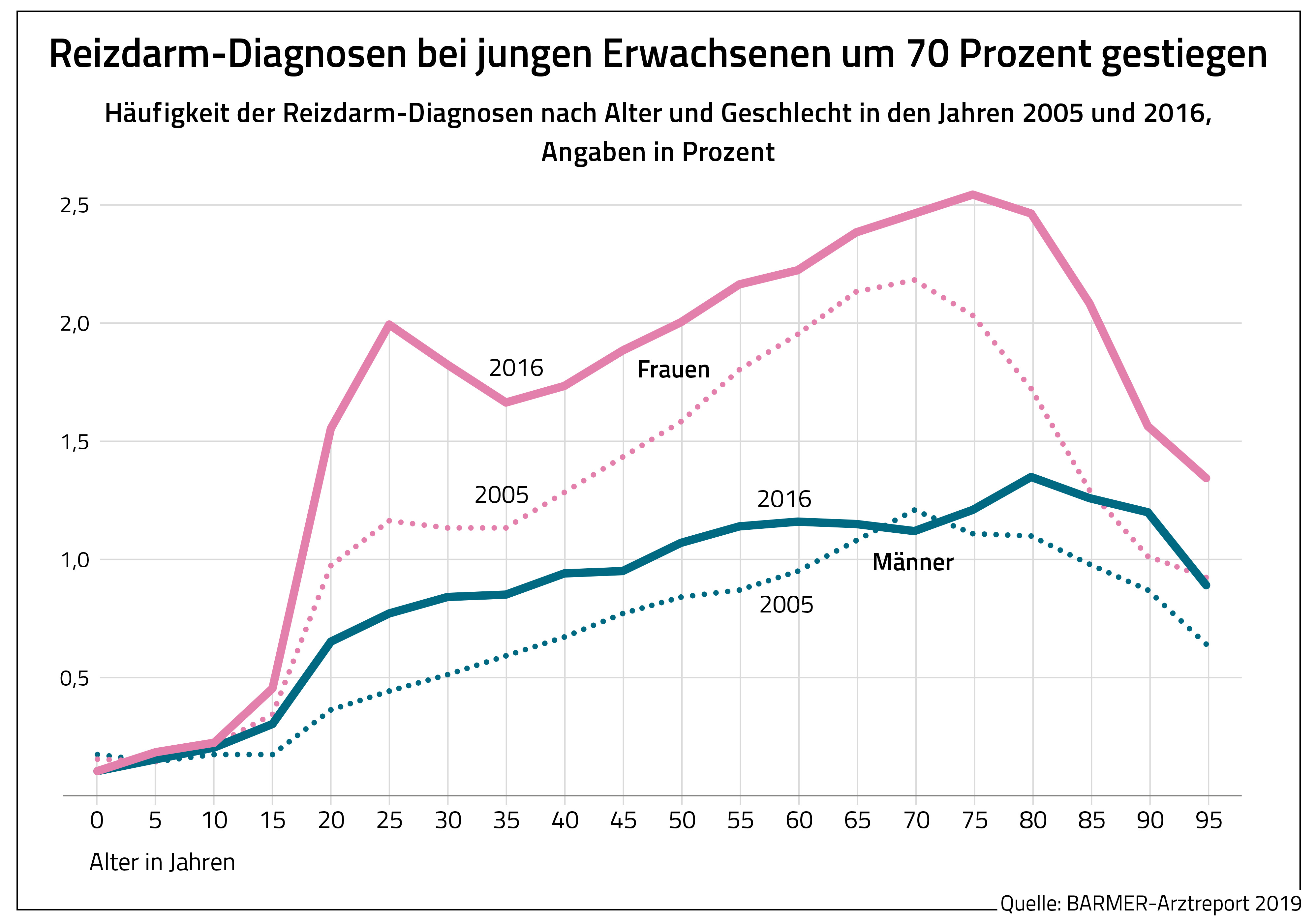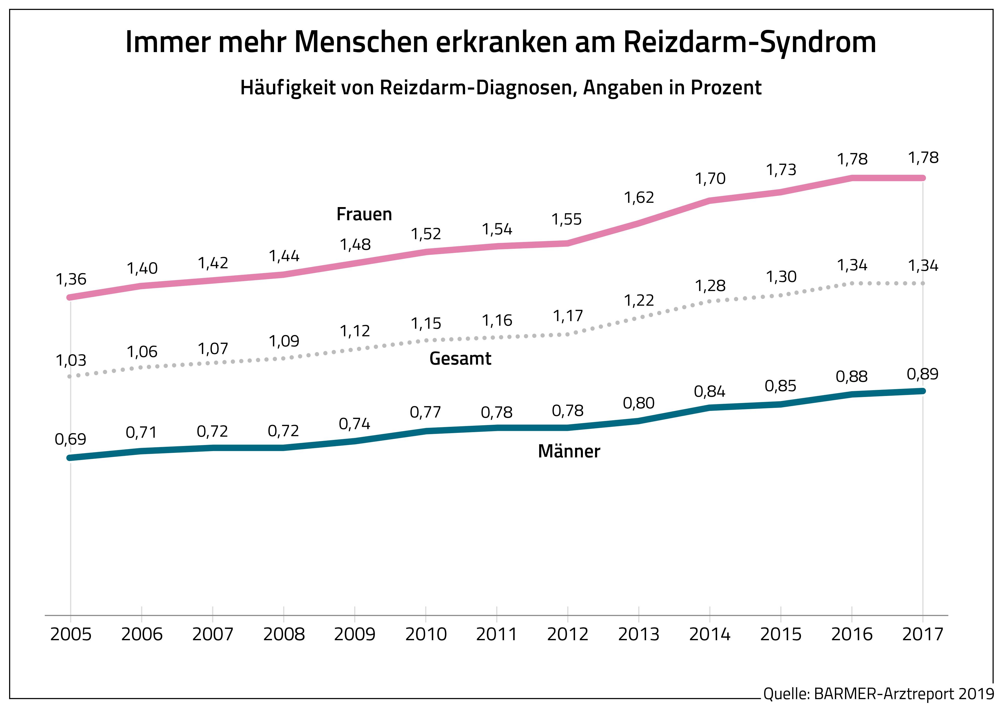 Berlin, 28. Februar 2019 – Laut aktuellem Barmer-Arztreport erhielten eine Million Menschen in Deutschland im Jahr 2017 die Diagnose Reizdarmsyndrom. Das sei jedoch nur die Spitze des Eisbergs, zahlreiche Betroffene mieden aus Scham den Gang zum Arzt. Tatsächlich sei davon auszugehen, dass bis zu elf Millionen Erwachsene an Symptomen wie Durchfall, Krämpfen oder Verstopfung leiden. Erkrankt seien dabei zunehmend Jüngere. So sei die Anzahl der Betroffenen im Alter von 23 bis einschließlich 27 Jahren zwischen den Jahren 2005 und 2017 von knapp 40.000 auf rund 68.000 gestiegen. Dies sei ein Zuwachs von 70 Prozent. „Aufgrund dieser hohen Relevanz muss die Versorgung der Betroffenen deutlich besser werden“, forderte der Barmer-Vorstandsvorsitzende, Prof. Dr. Christoph Straub.