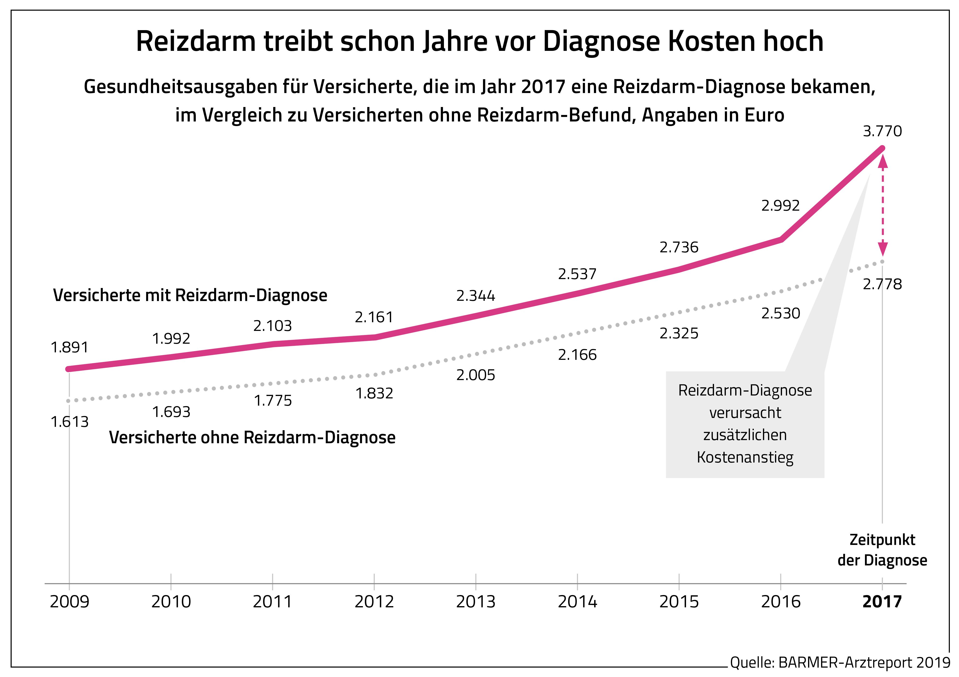 Wer an einem Reizdarmsyndrom erkrankt ist, verursache den Reportergebnissen zufolge bereits acht Jahre vor der Erstdiagnose deutlich höhere Kosten als Vergleichspersonen, die diese Erkrankung nicht haben. „Die Betroffenen leiden mitunter schon viele Jahre an einem Reizdarmsyndrom und suchen deswegen immer wieder Hilfe beim Arzt. Die Erkrankung wird aber lange Zeit nicht erkannt, und die Betroffenen erhalten eine falsche Therapie“, betonte Barmer-Chef Straub. Wenn die Diagnose feststehe, stiegen die Behandlungskosten noch einmal deutlich an. Das läge auch an den bereits erwähnten Verfahren, die dann zum Einsatz kämen.