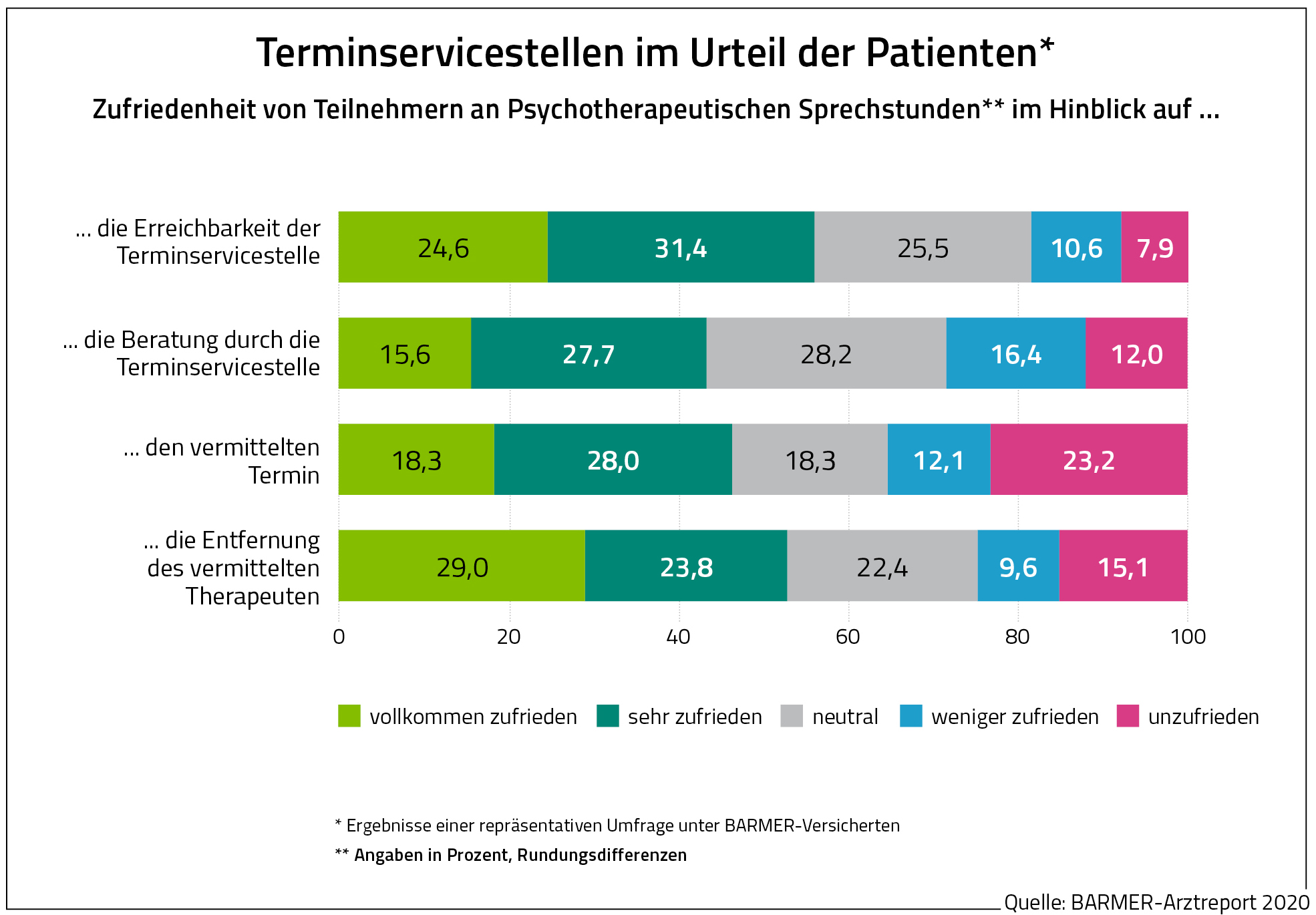 Mehr Kritik gab es laut Umfrage an den Terminservicestellen. So war nicht einmal jeder zweite Befragte mit dem vermittelten Termin zur Sprechstunde zufrieden. Die Gründe dafür seien vielfältig und umfassen unter anderem Schwierigkeiten, die Therapie mit dem Beruf zu vereinbaren oder die Uhrzeit, zu der die Therapie stattfinden solle. Ein anderer Grund für die Kritik könnte die Entfernung zum Therapeuten sein, an der nur etwas mehr als jeder zweite Befragte nichts auszusetzen hatte. „Die Terminservicestellen sorgen für einen schnellen Erstberatungstermin. Der Patient hat aber kein Anrecht darauf, dass der Therapeut in nächster Nähe ist. Wenn es nicht anders geht, müssen die Servicestellen leider an einen weiter entfernten Experten vermitteln“, sagte Szecsenyi.