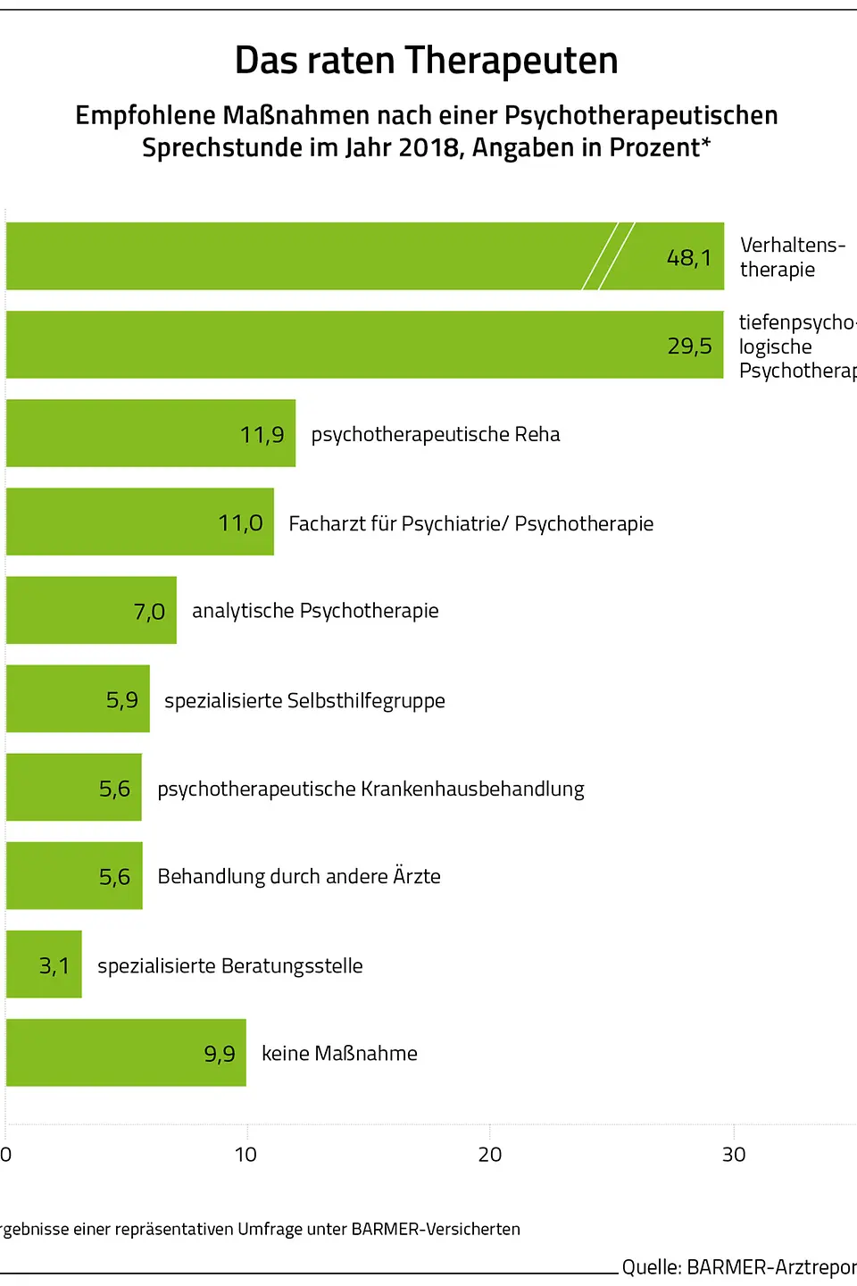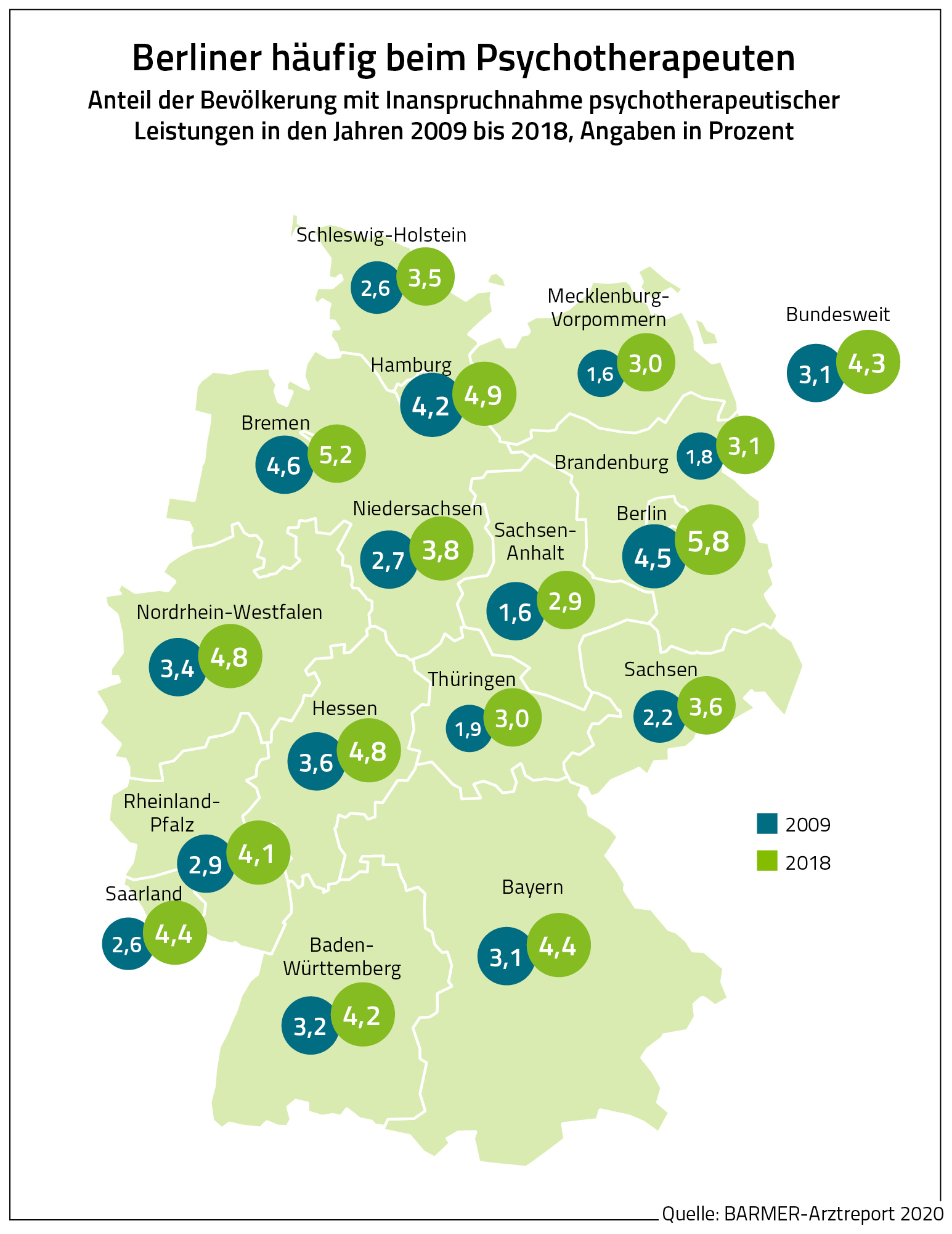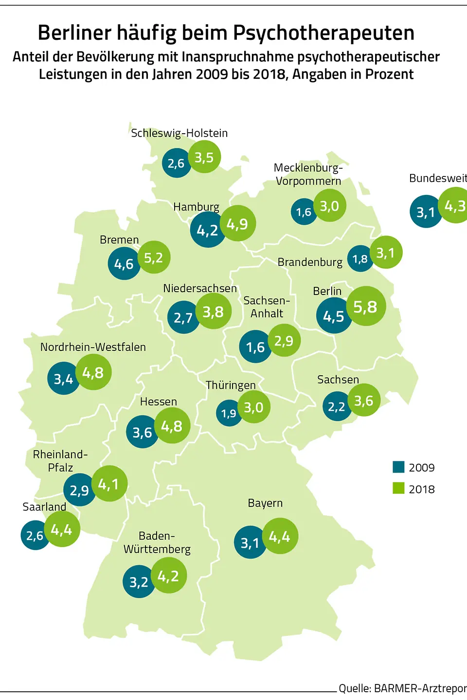 Dem Barmer Arztreport zufolge gab es im Jahr 2018 mehr als 36.500 Ärzte und Therapeuten mit einer psychotherapeutischen Qualifikation. Seit dem Jahr 2009 stieg die Zahl der psychologischen Psychotherapeuten um 54 Prozent von 13.700 auf 21.000. Die Zahl der ambulant tätigen Kinder- und Jugendpsychotherapeuten hat sich mehr als verdoppelt, von rund 2.600 auf etwa 5.500.