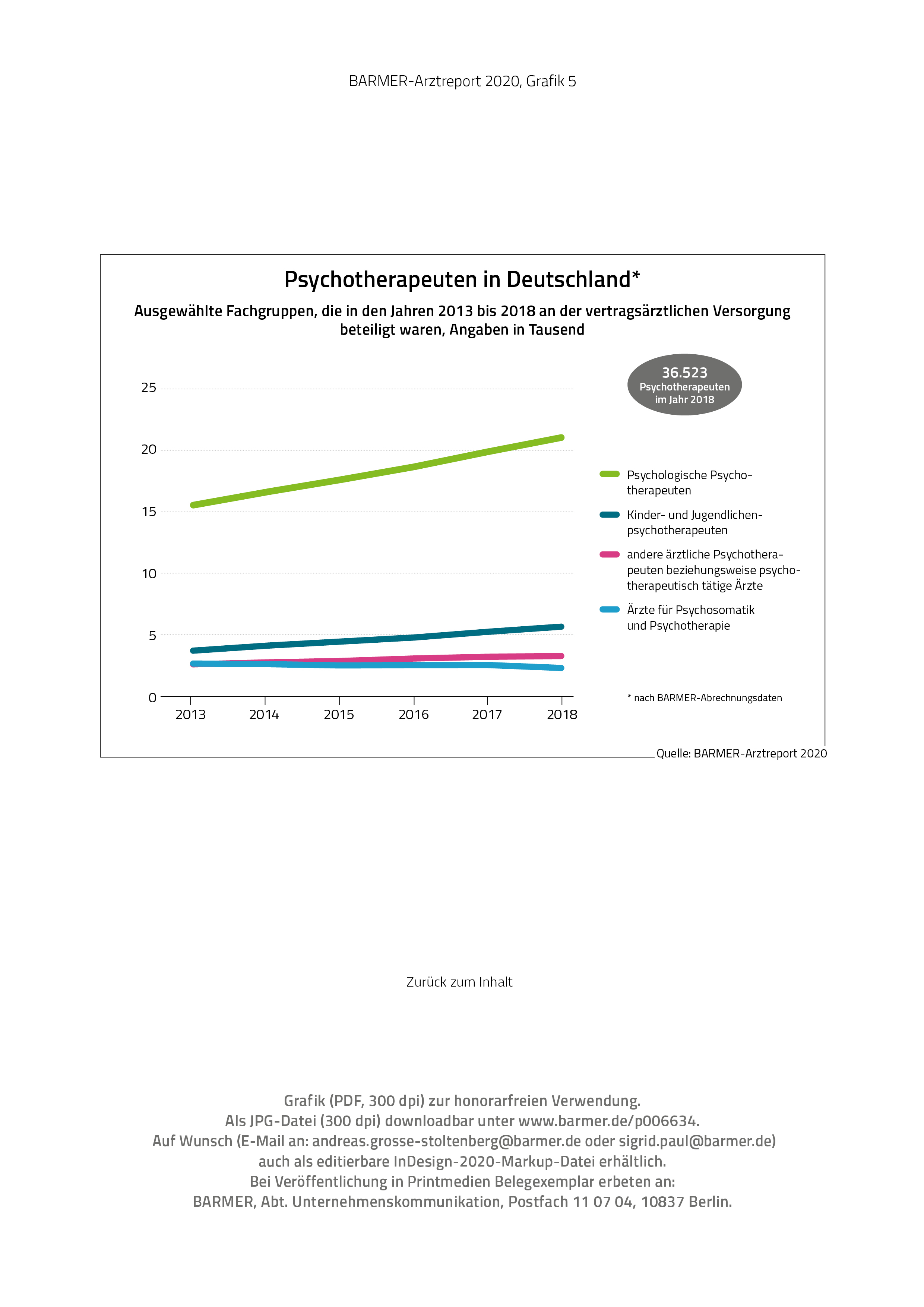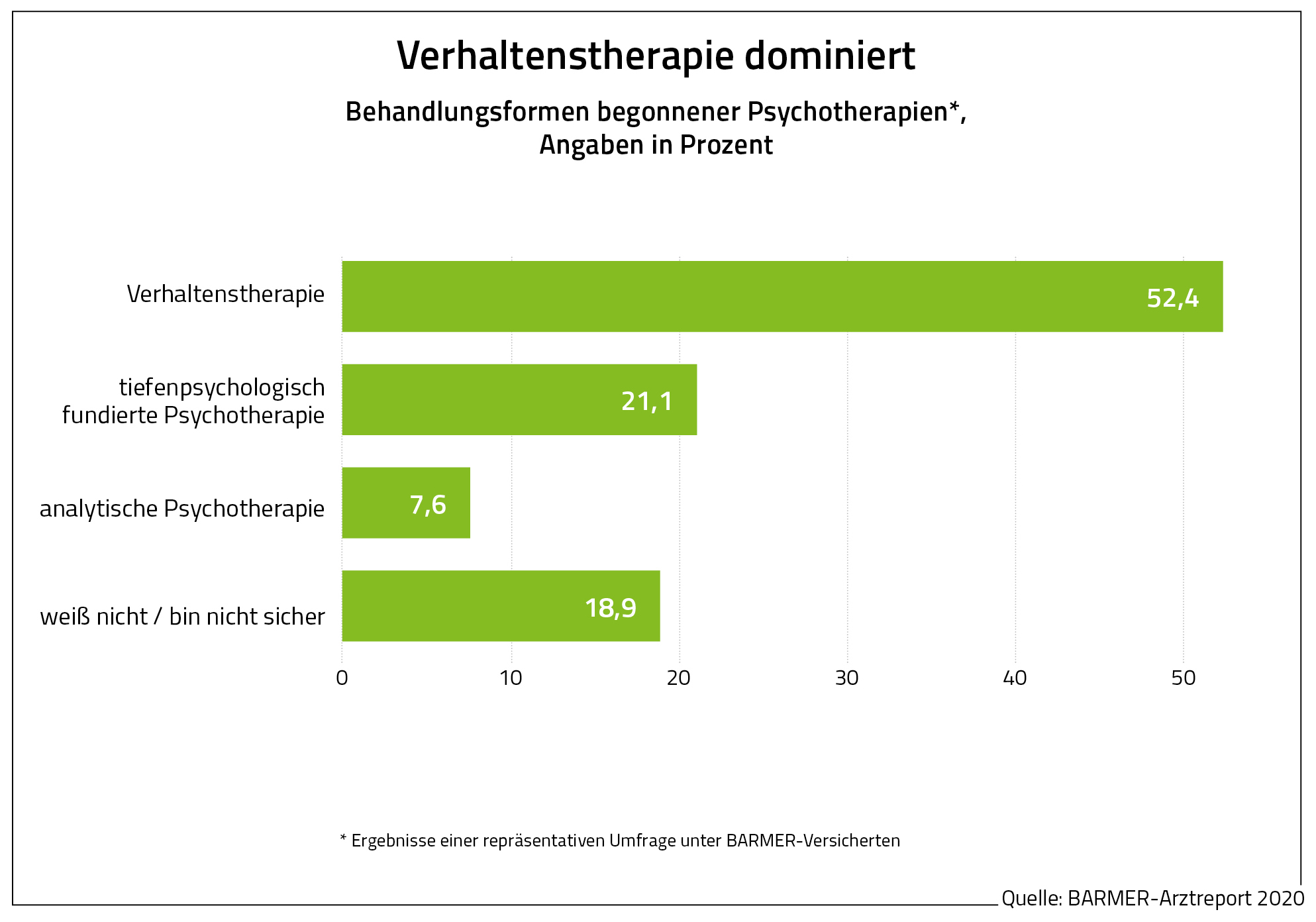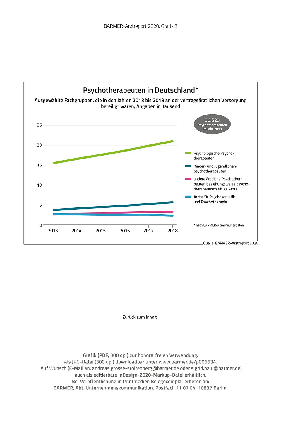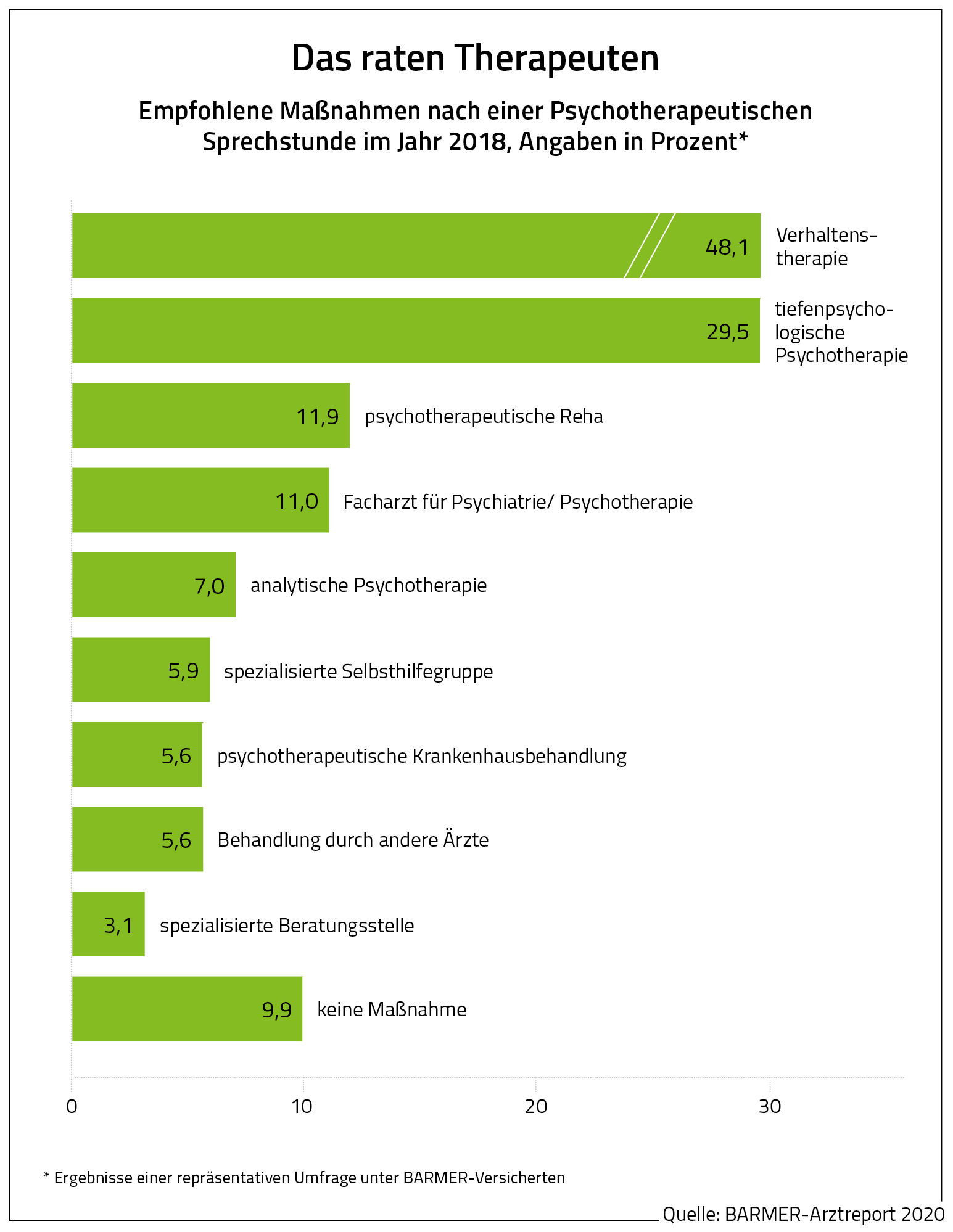 Dem Barmer Arztreport zufolge gab es im Jahr 2018 mehr als 36.500 Ärzte und Therapeuten mit einer psychotherapeutischen Qualifikation. Seit dem Jahr 2009 stieg die Zahl der psychologischen Psychotherapeuten um 54 Prozent von 13.700 auf 21.000. Die Zahl der ambulant tätigen Kinder- und Jugendpsychotherapeuten hat sich mehr als verdoppelt, von rund 2.600 auf etwa 5.500.