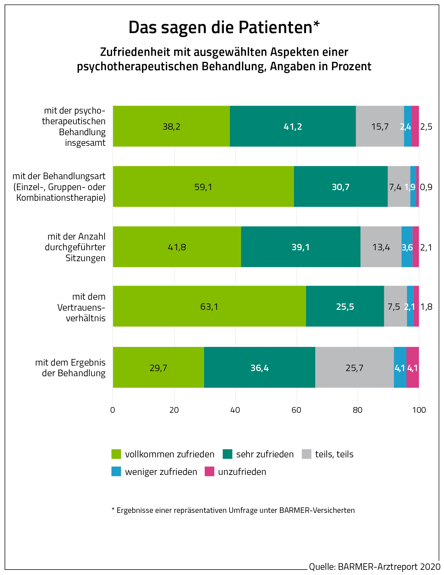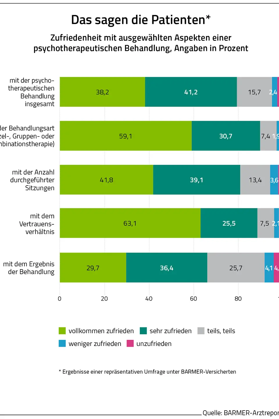 Durchwachsen fiel gemäß der Umfrage auch das Urteil der Befragten zur Psychotherapie selbst aus. So waren zwar fast 89 Prozent der Befragten mit dem Vertrauensverhältnis zum Therapeuten sehr zufrieden, allerdings nur 66 Prozent mit dem Ergebnis der Therapie. Jeder Dritte war demnach teilweise oder gänzlich unzufrieden mit den Resultaten. „Viele Patientinnen und Patienten wünschen sich eine konkrete Lösung für ihre Probleme. Eine Psychotherapie deckt aber eher Verhaltensmuster auf und gibt Denkanstöße zum eigenen Handeln. Deshalb ist es wichtig, dass die Therapeuten den Patientinnen und Patienten zu Beginn klar formulieren, was sie sich von einer Therapie erhoffen können“, so Barmer-Vorstandschef Straub.