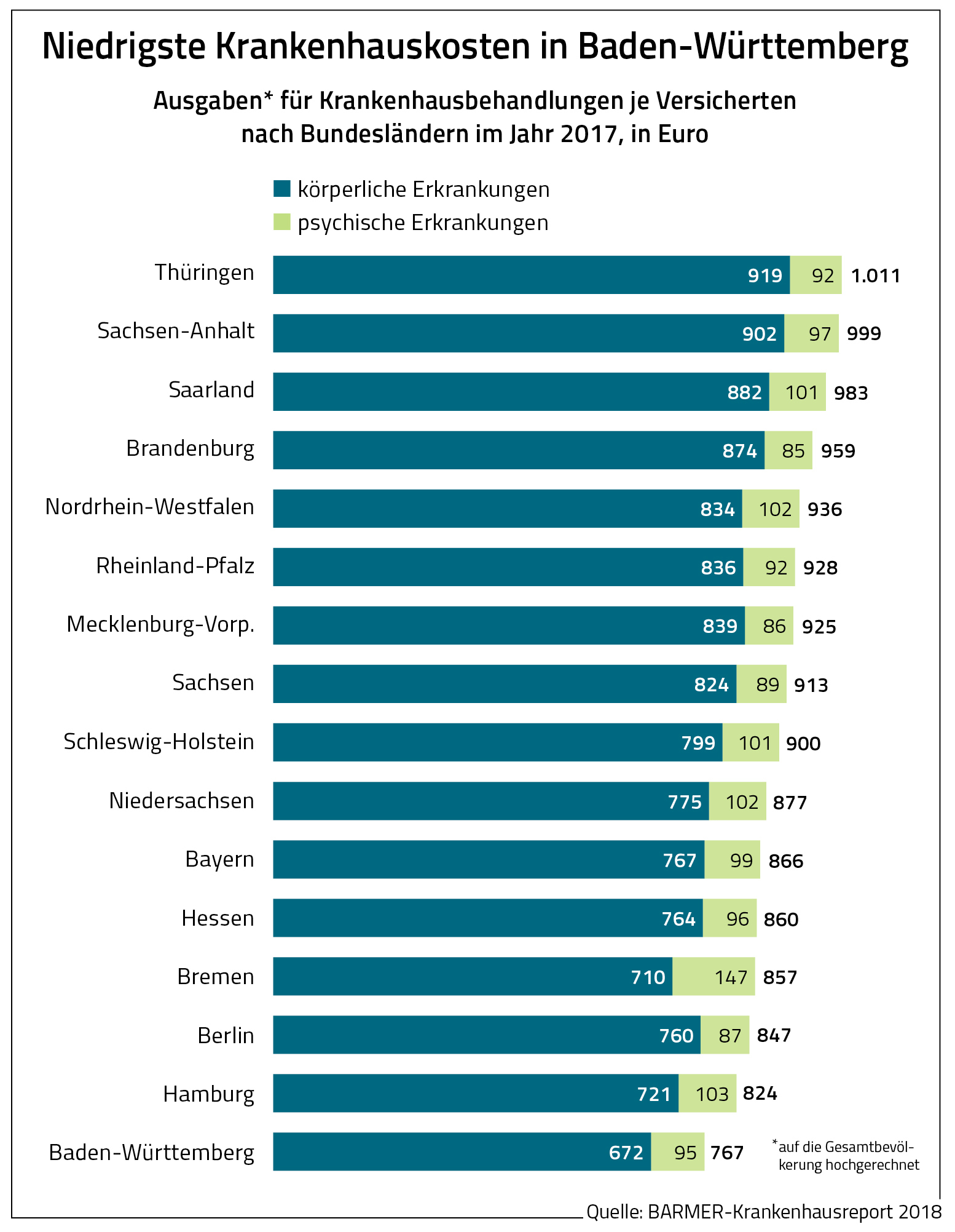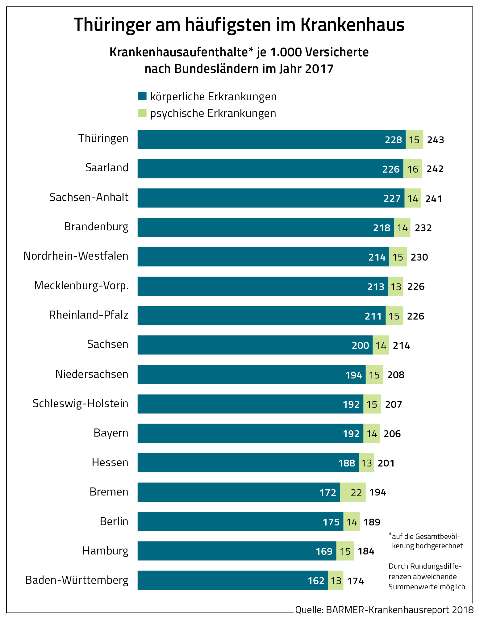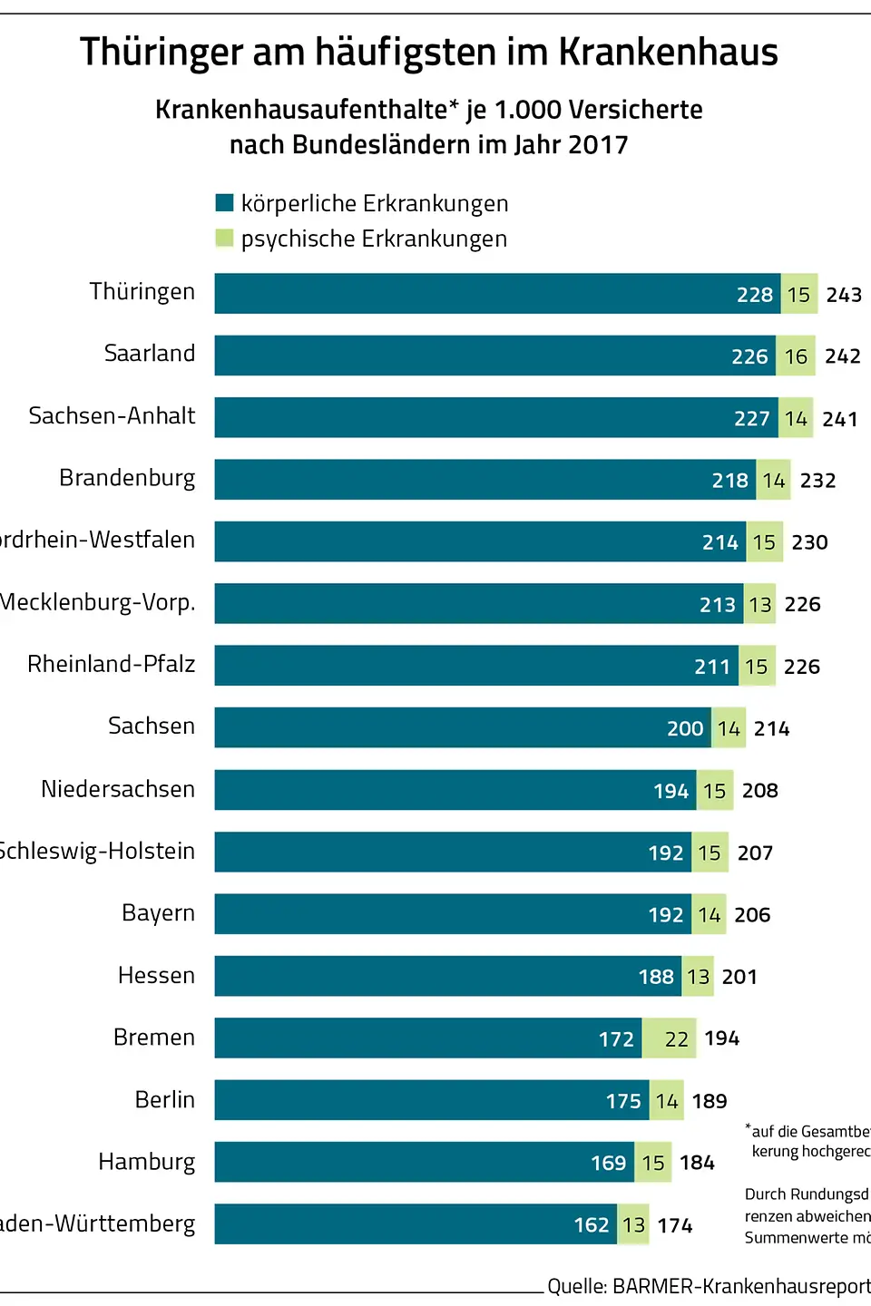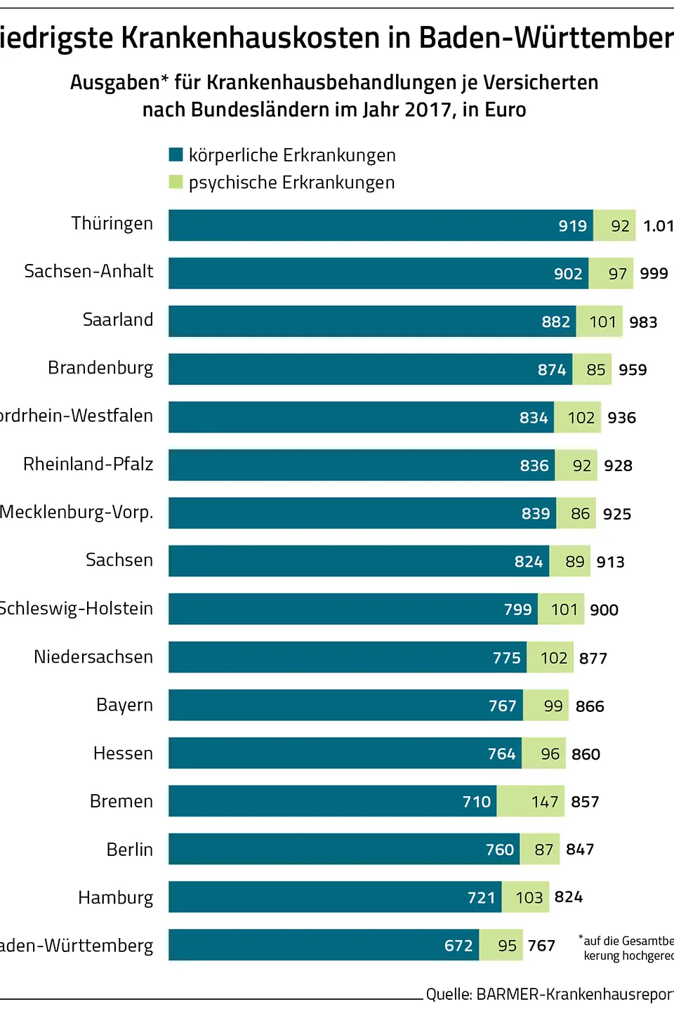 - Regionale Unterschiede: Während in Thüringen im Jahr 2017 nur 243 und im Saarland 242 von 1.000 Personen einen Krankenhausaufenthalt hatten, waren es in Hamburg nur 184 und in Baden-Württemberg 174. Große Unterschiede gab es auch bei den Kosten je Versicherten. Sie schwankten zwischen 672 Euro für körperliche und 95 Euro für psychische Erkrankungen in Baden-Württemberg und 919 Euro und 92 Euro in Thüringen (Report S.37 und 39).