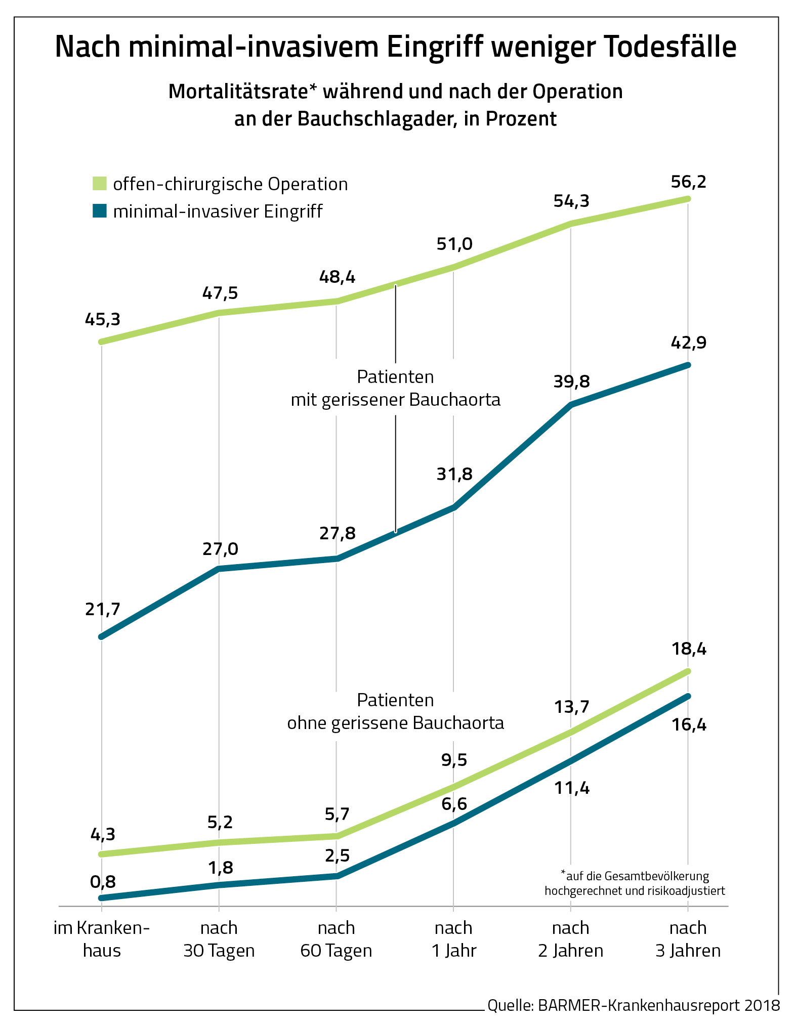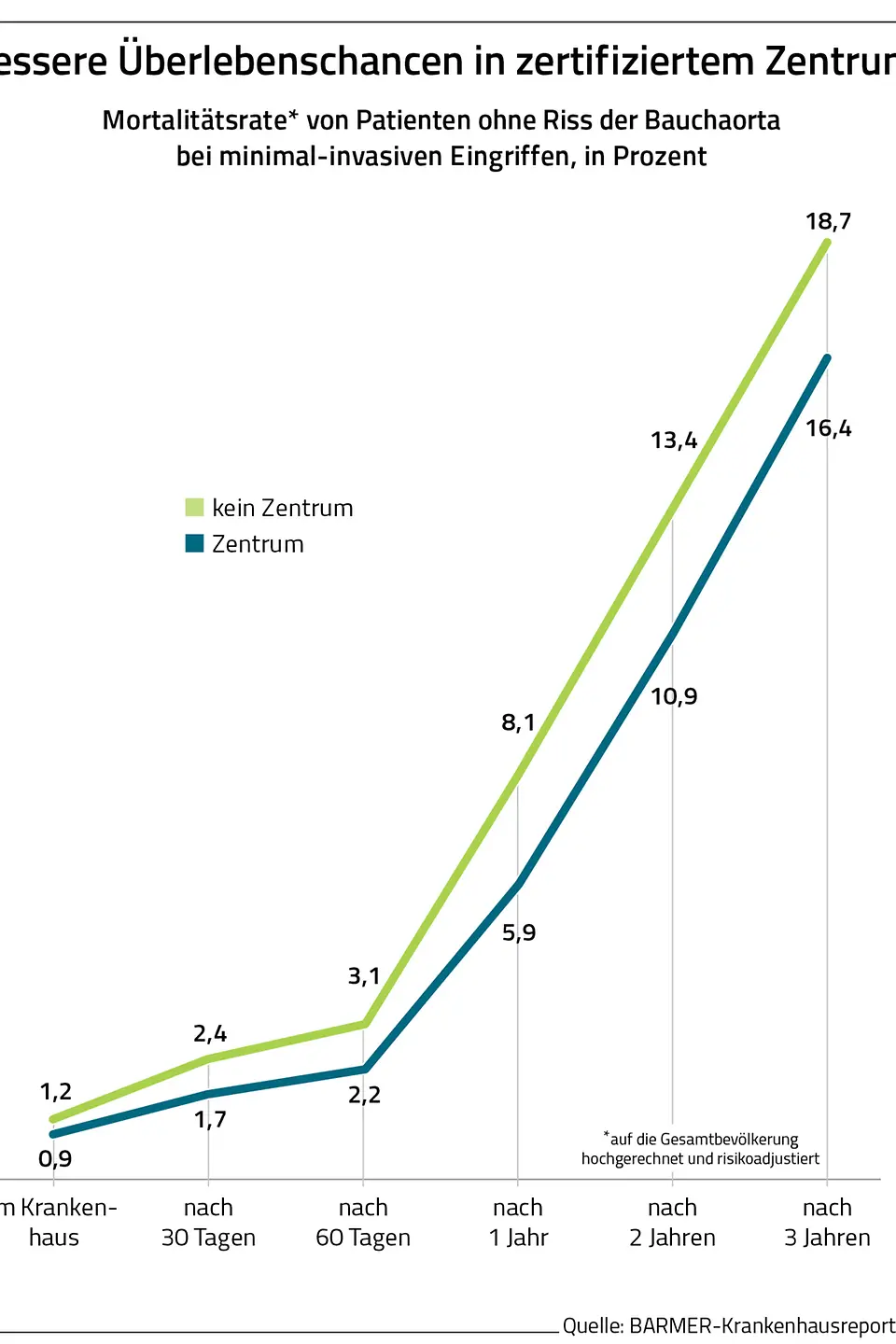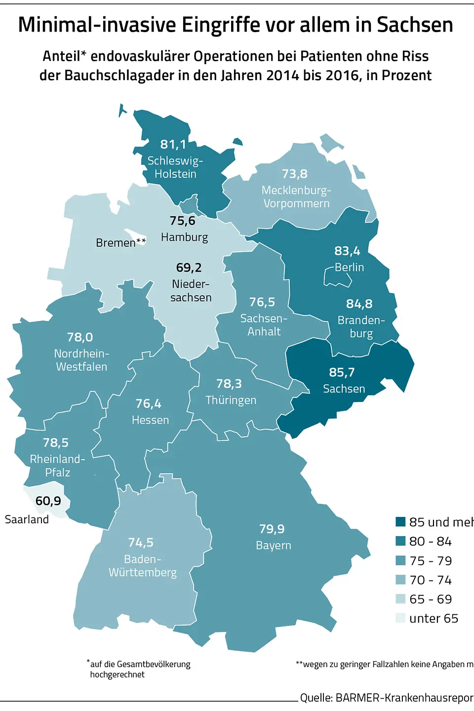 Berlin, 9. August 2018 – In Deutschland leiden rund 200.000 Frauen und Männer über 65 Jahren an einer erweiterten Bauchschlagader, einer im schlimmsten Falle tödlichen Gefahr. Wie hoch deren Sterberisiko im Falle einer planbaren Operation ist, hängt davon ab, wie und in welchem Krankenhaus operiert wird. Das geht aus dem Barmer-Krankenhausreport 2018 hervor, der am Donnerstag in Berlin vorgestellt wurde. So war die Sterberate drei Jahre nach einem planbaren Eingriff um zwei Prozentpunkte geringer, wenn die Operation nicht offen-chirurgisch, sondern minimal-invasiv erfolgte. Zudem war die Sterblichkeitsrate um 2,3 Prozentpunkte geringer, wenn der minimal-invasive Eingriff in einem zertifizierten Gefäßzentrum durchgeführt wurde.