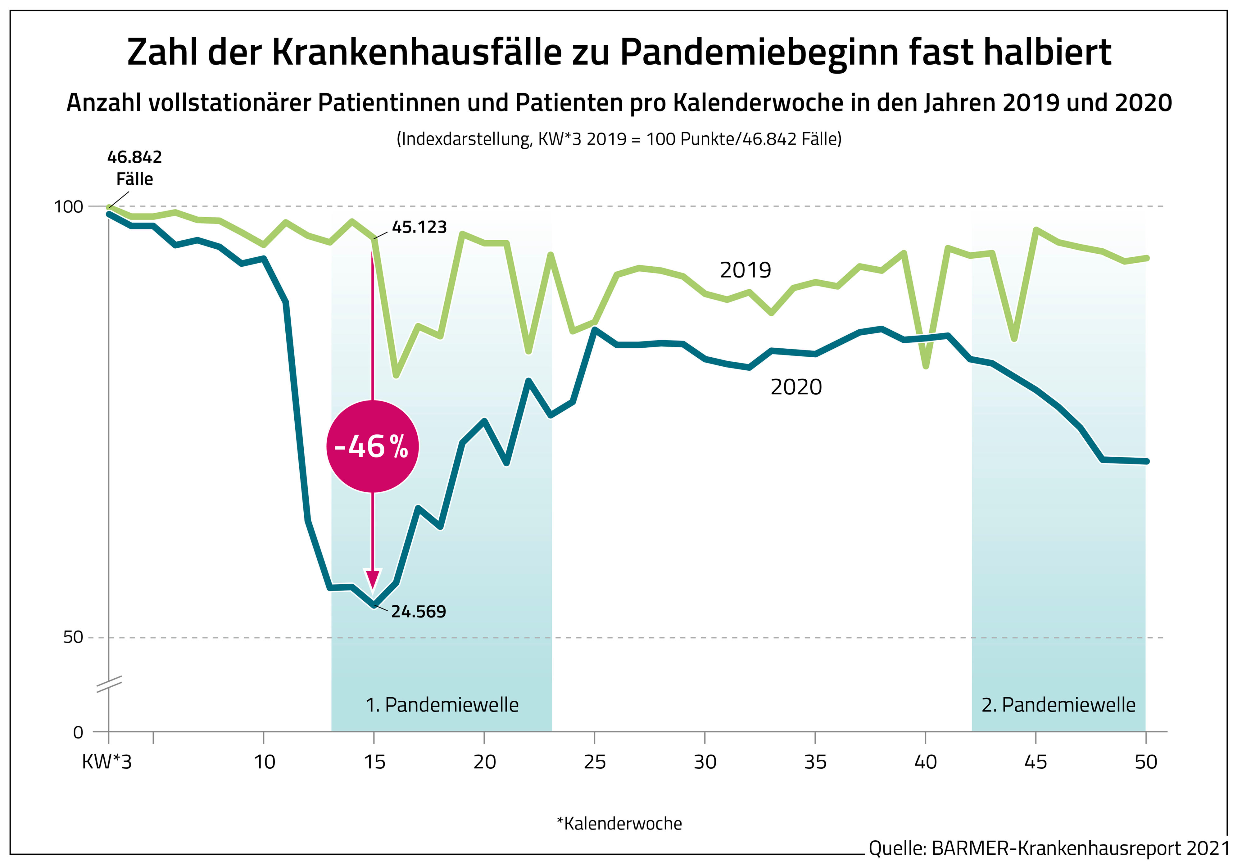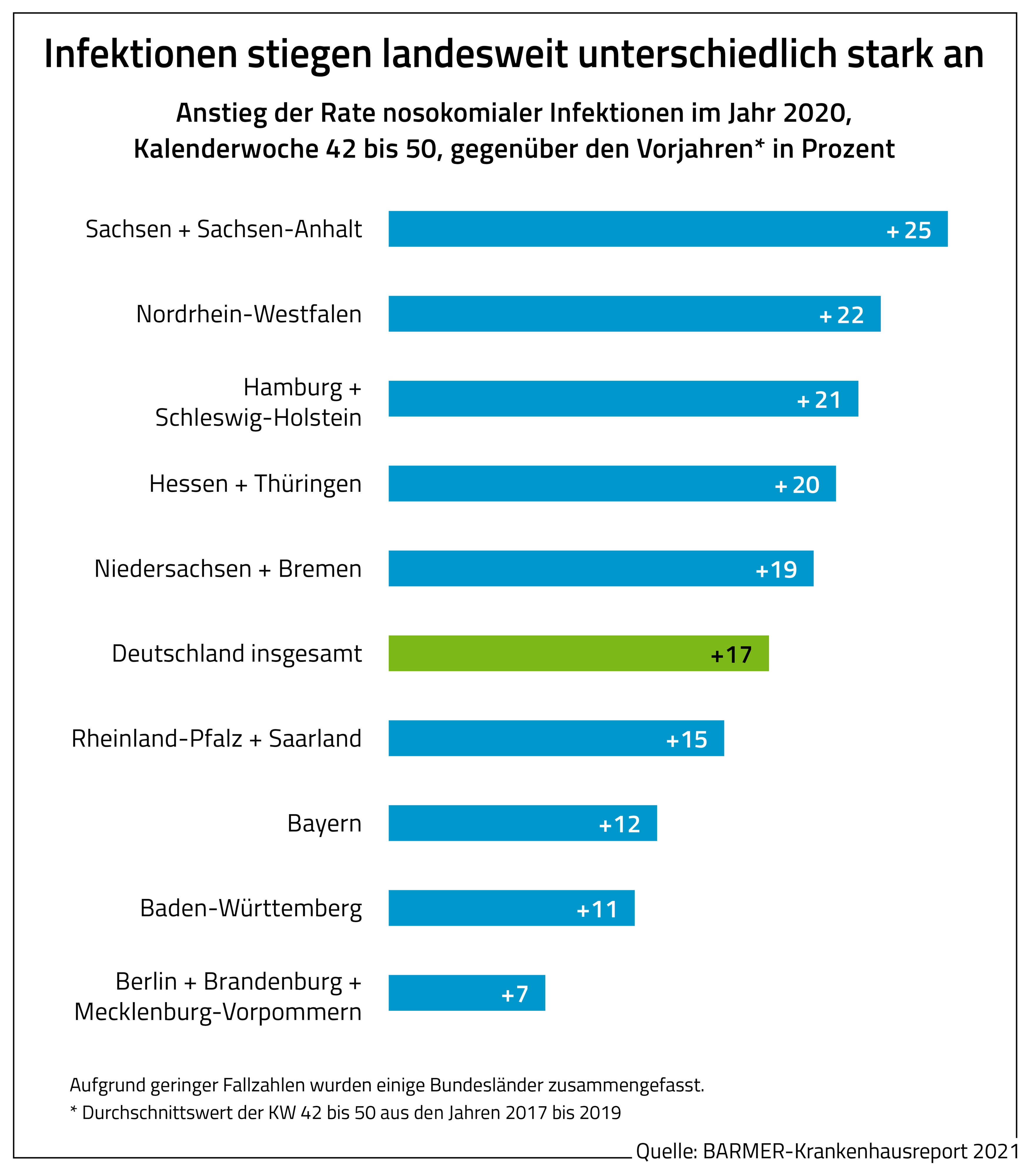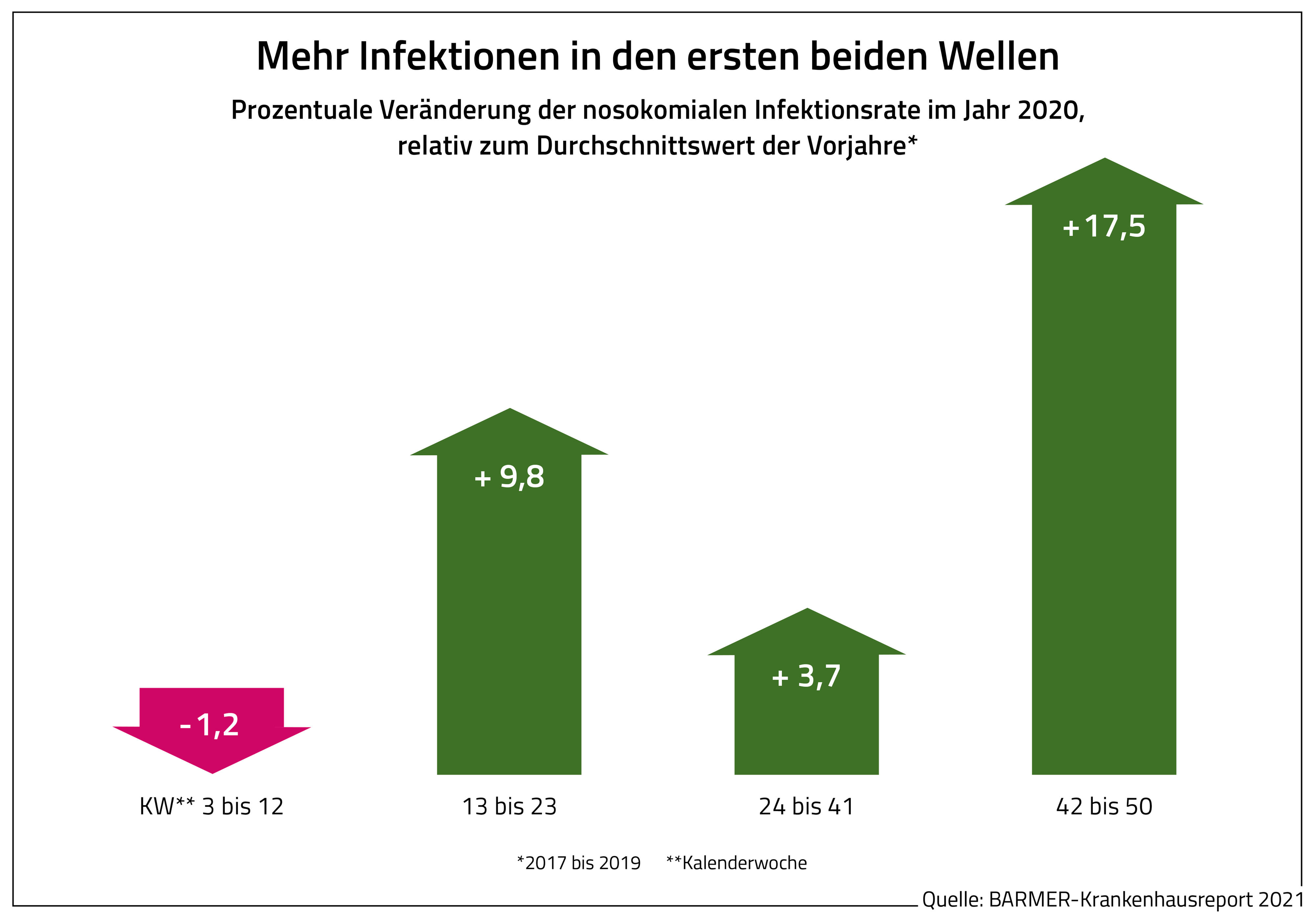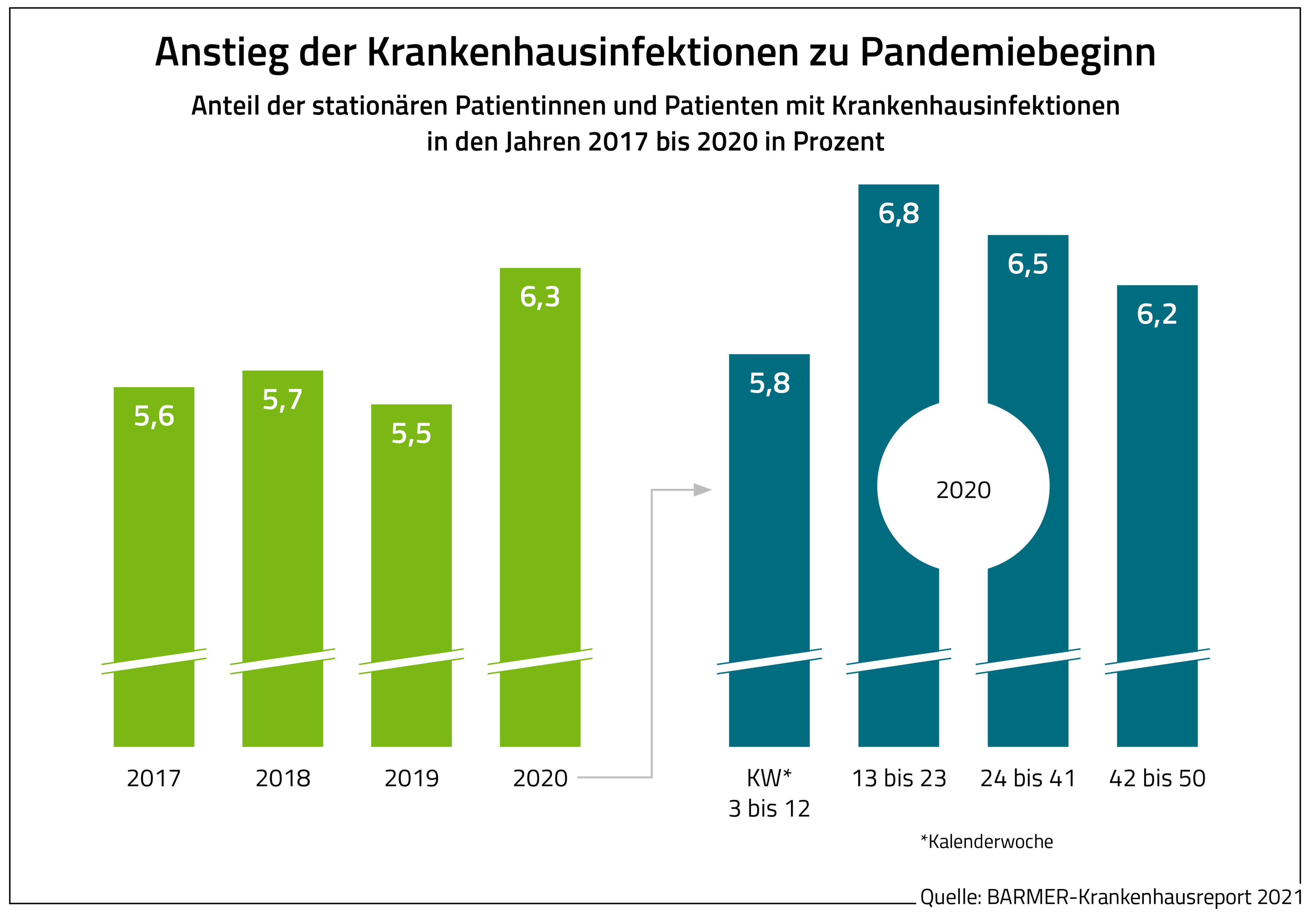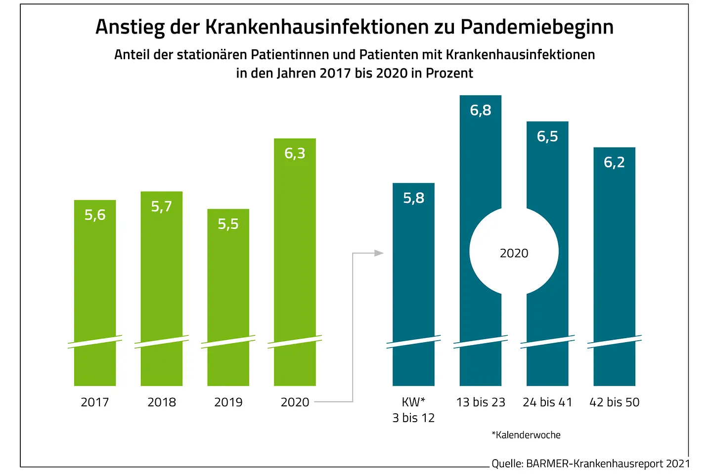 Berlin, 8. September 2021 – Jedes Jahr erwerben bis zu 600.000 Patientinnen und Patienten in deutschen Krankenhäusern eine sogenannte nosokomiale Infektion. Bis zu 15.000 Betroffene sterben an einer solchen Krankenhausinfektion. Seit Beginn der Corona-Pandemie hat sich diese Situation verschärft. Bis Ende des Jahres 2020 gab es deutschlandweit etwa 34.000 zusätzlich Infizierte und bis zu 1.300 weitere Todesfälle aufgrund einer nosokomialen Infektion. Das geht aus dem neuen Barmer-Krankenhausreport hervor, der heute in Berlin vorgestellt wurde.