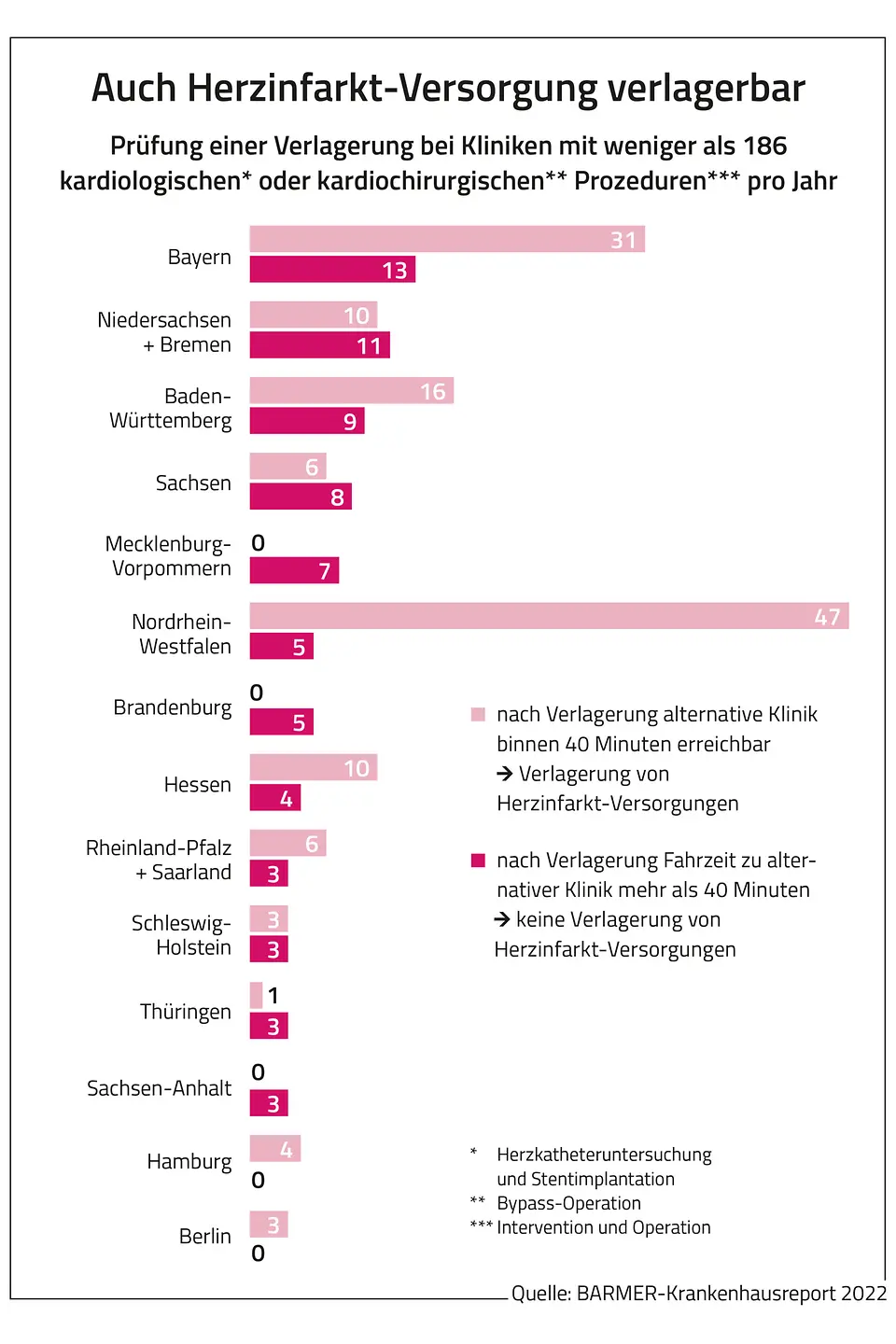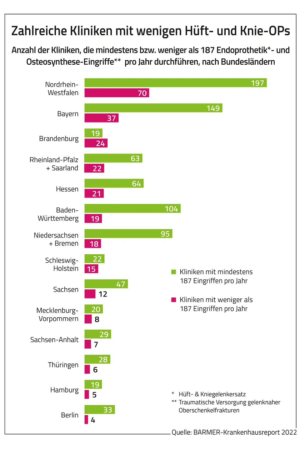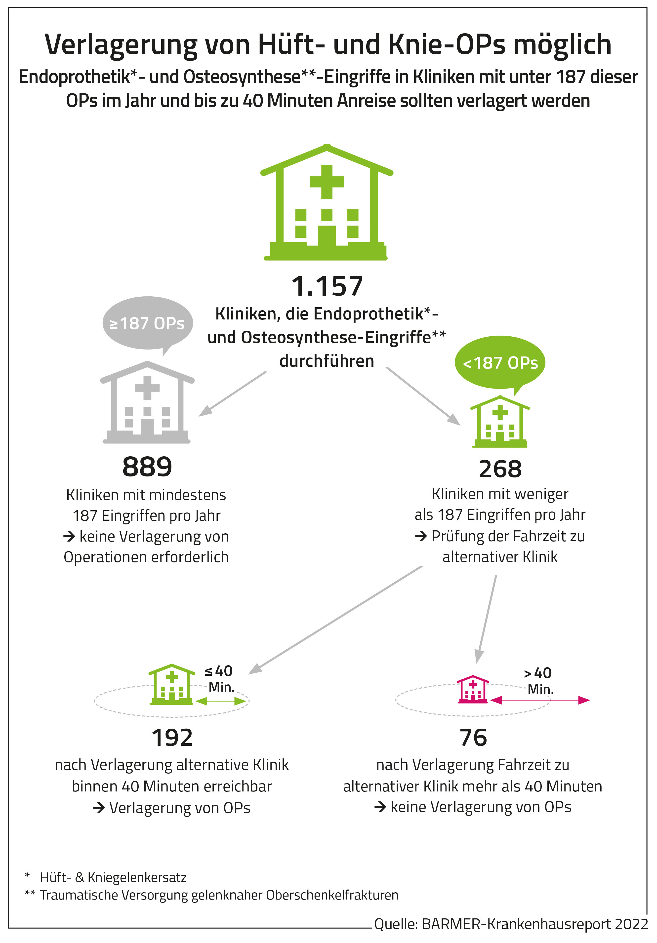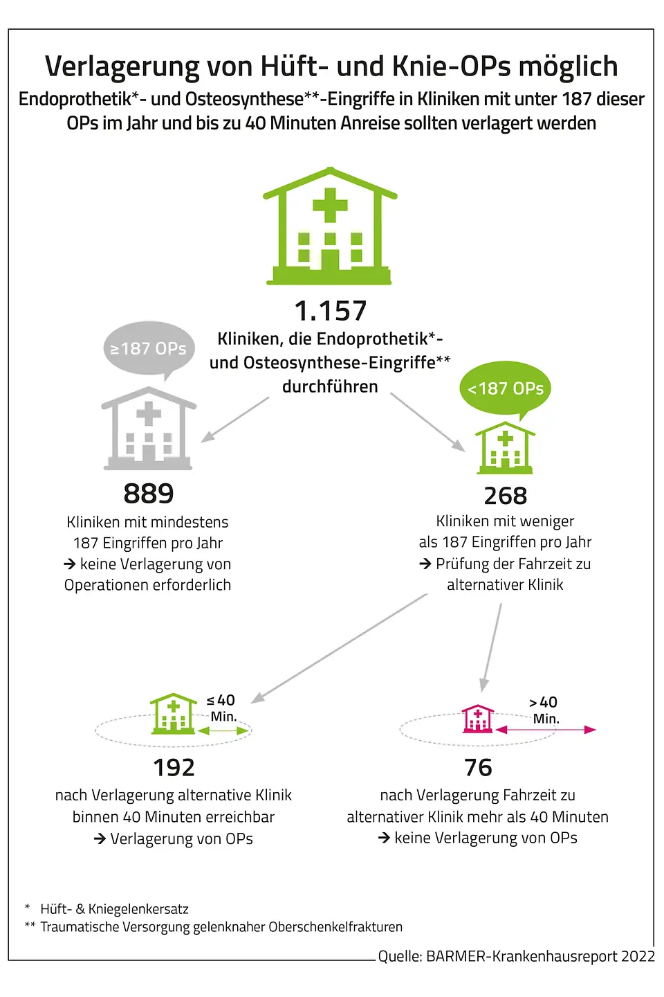 Berlin, 8. September 2022 – Zehntausende Patientinnen und Patienten in Deutschland könnten von mehr Qualität bei Hüft-, Knie- und Herzoperationen profitieren und vor Gelegenheitschirurgie bewahrt werden. Dabei müssten sie nur geringfügig längere Fahrzeiten zur Klinik in Kauf nehmen. Das geht aus dem aktuellen Krankenhausreport der Barmer hervor, der heute in Berlin vorgestellt wurde. Darin wurde für fünf Prozent der Hüft- und Knieoperationen sowie für drei Prozent der Herzinfarkteingriffe geprüft, ob sie sich von Standorten mit der geringsten Routine an Kliniken mit höheren Fallzahlen verlagern lassen. Dort haben die Ärztinnen und Ärzte sowie das Pflegepersonal in der Regel eine höhere Expertise. Bereits bei diesen niedrigen Schwellenwerten könnten pro Jahr mindestens 18.000 der insgesamt mehr als 500.000 Hüft- und Knie-OPs an anderen Standorten durchgeführt werden, ohne dass sich die Fahrzeit für die Patienten deutlich verlängert. Analog ließen sich von den rund 400.000 Eingriffen am Herzen über 8.000 verlagern. Durch höhere Schwellenwerte könnten sogar noch deutlich mehr Eingriffe an Kliniken mit mehr Expertise erfolgen, ohne dass die Erreichbarkeit darunter leide. „Auch vor der angestrebten Reform der Krankenhausversorgung können bereits heute durch die konsequente Verlagerung von Operationen in Kliniken mit mehr Erfahrung und besserer Ausstattung Qualität und Patientensicherheit deutlich erhöht werden. Diese Potenziale gilt es jetzt im Sinne der Patienten konsequent zu heben“, sagte Prof. Dr. med. Christoph Straub, Vorstandsvorsitzender der BARMER. Mit einer tiefgreifenden Reform der Krankenhausversorgung samt Neuausrichtung der Krankenhausplanung wären darüber hinaus systematische bedarfs- und qualitätsorientierte Konzentrationsprozesse im Sinne der Patienten umsetzbar.