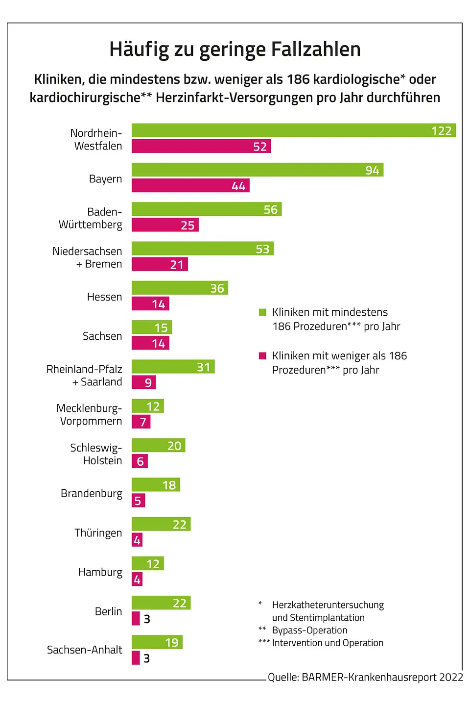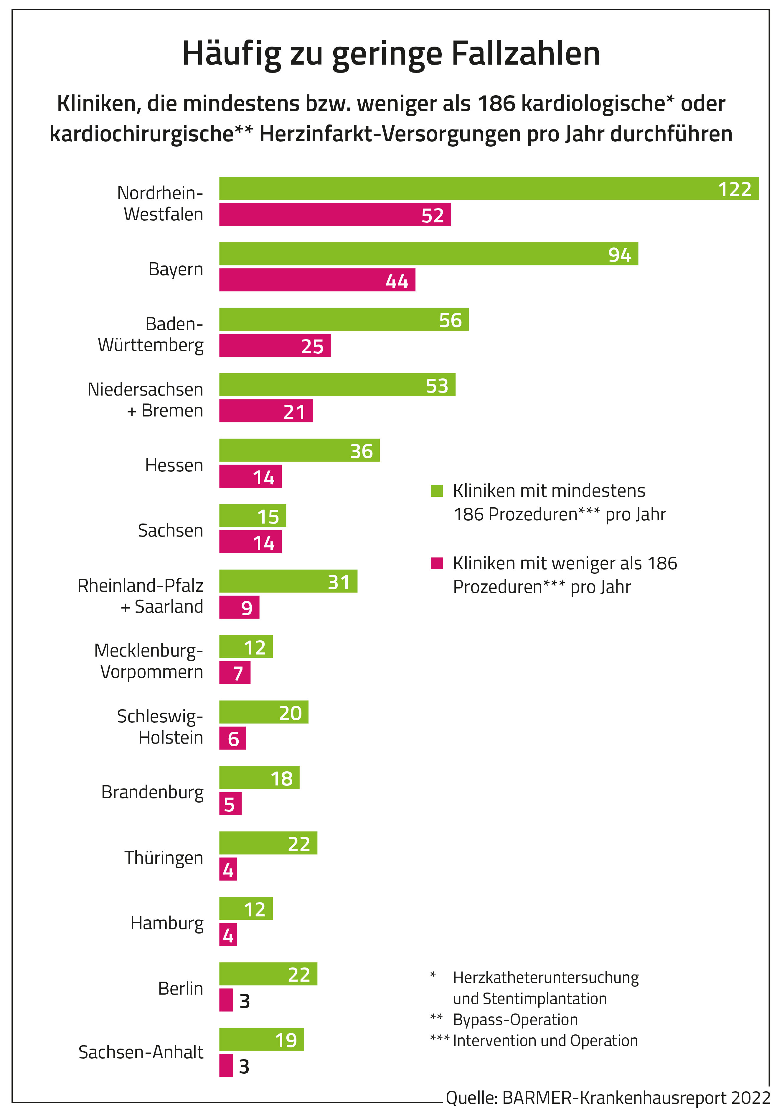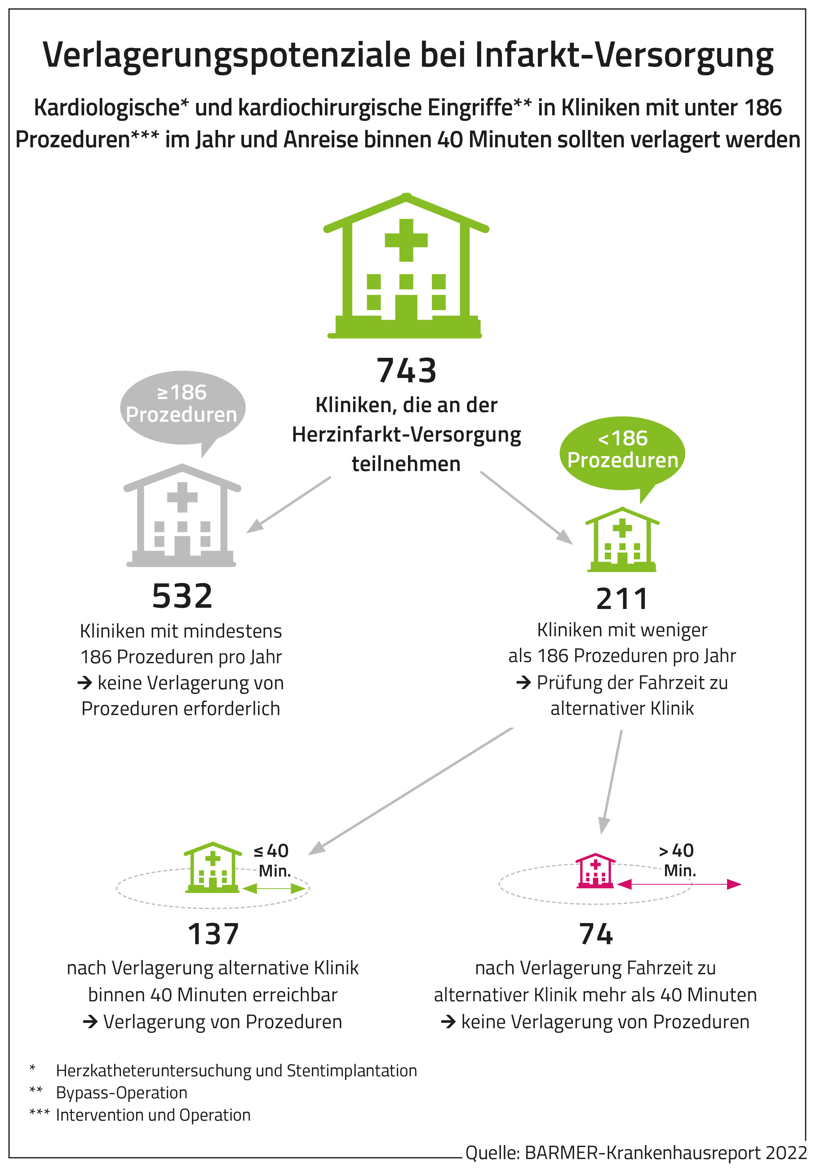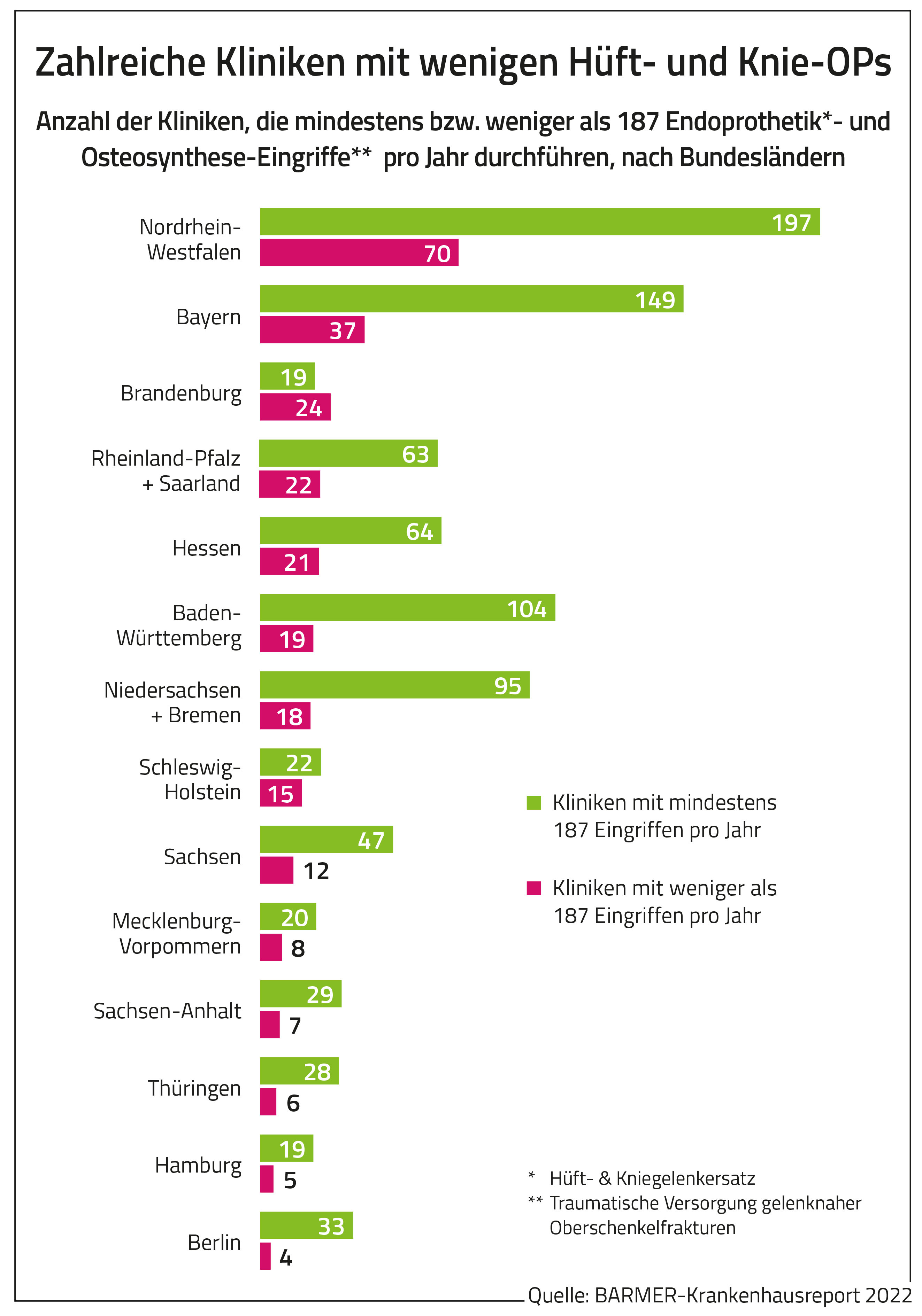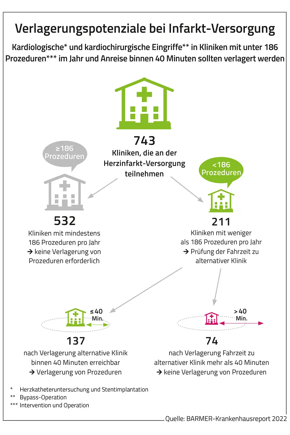Berlin, 8. September 2022 – Zehntausende Patientinnen und Patienten in Deutschland könnten von mehr Qualität bei Hüft-, Knie- und Herzoperationen profitieren und vor Gelegenheitschirurgie bewahrt werden. Dabei müssten sie nur geringfügig längere Fahrzeiten zur Klinik in Kauf nehmen. Das geht aus dem aktuellen Krankenhausreport der Barmer hervor, der heute in Berlin vorgestellt wurde. Darin wurde für fünf Prozent der Hüft- und Knieoperationen sowie für drei Prozent der Herzinfarkteingriffe geprüft, ob sie sich von Standorten mit der geringsten Routine an Kliniken mit höheren Fallzahlen verlagern lassen. Dort haben die Ärztinnen und Ärzte sowie das Pflegepersonal in der Regel eine höhere Expertise. Bereits bei diesen niedrigen Schwellenwerten könnten pro Jahr mindestens 18.000 der insgesamt mehr als 500.000 Hüft- und Knie-OPs an anderen Standorten durchgeführt werden, ohne dass sich die Fahrzeit für die Patienten deutlich verlängert. Analog ließen sich von den rund 400.000 Eingriffen am Herzen über 8.000 verlagern. Durch höhere Schwellenwerte könnten sogar noch deutlich mehr Eingriffe an Kliniken mit mehr Expertise erfolgen, ohne dass die Erreichbarkeit darunter leide. „Auch vor der angestrebten Reform der Krankenhausversorgung können bereits heute durch die konsequente Verlagerung von Operationen in Kliniken mit mehr Erfahrung und besserer Ausstattung Qualität und Patientensicherheit deutlich erhöht werden. Diese Potenziale gilt es jetzt im Sinne der Patienten konsequent zu heben“, sagte Prof. Dr. med. Christoph Straub, Vorstandsvorsitzender der BARMER. Mit einer tiefgreifenden Reform der Krankenhausversorgung samt Neuausrichtung der Krankenhausplanung wären darüber hinaus systematische bedarfs- und qualitätsorientierte Konzentrationsprozesse im Sinne der Patienten umsetzbar.