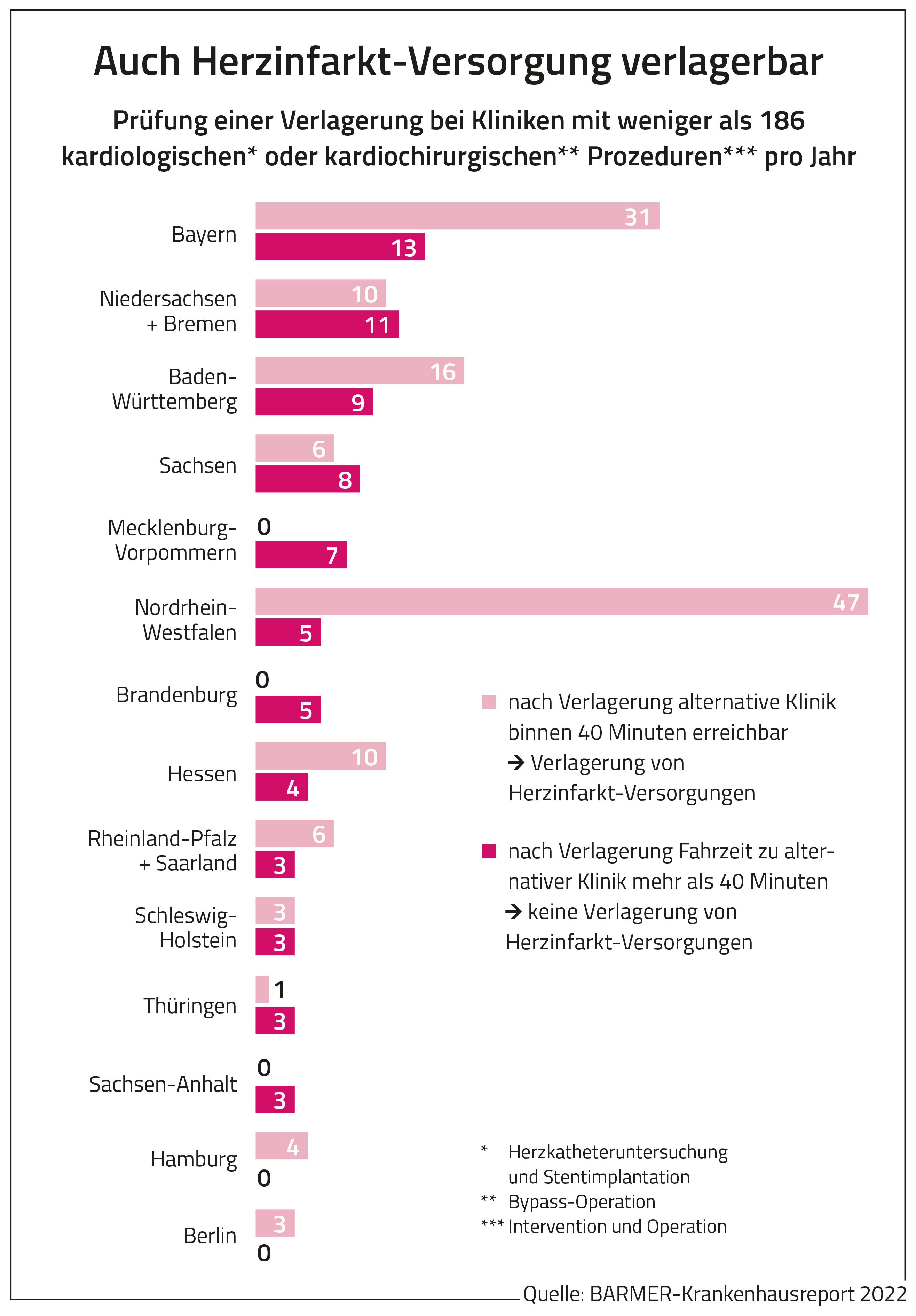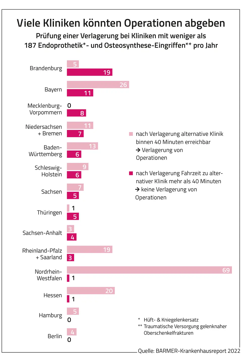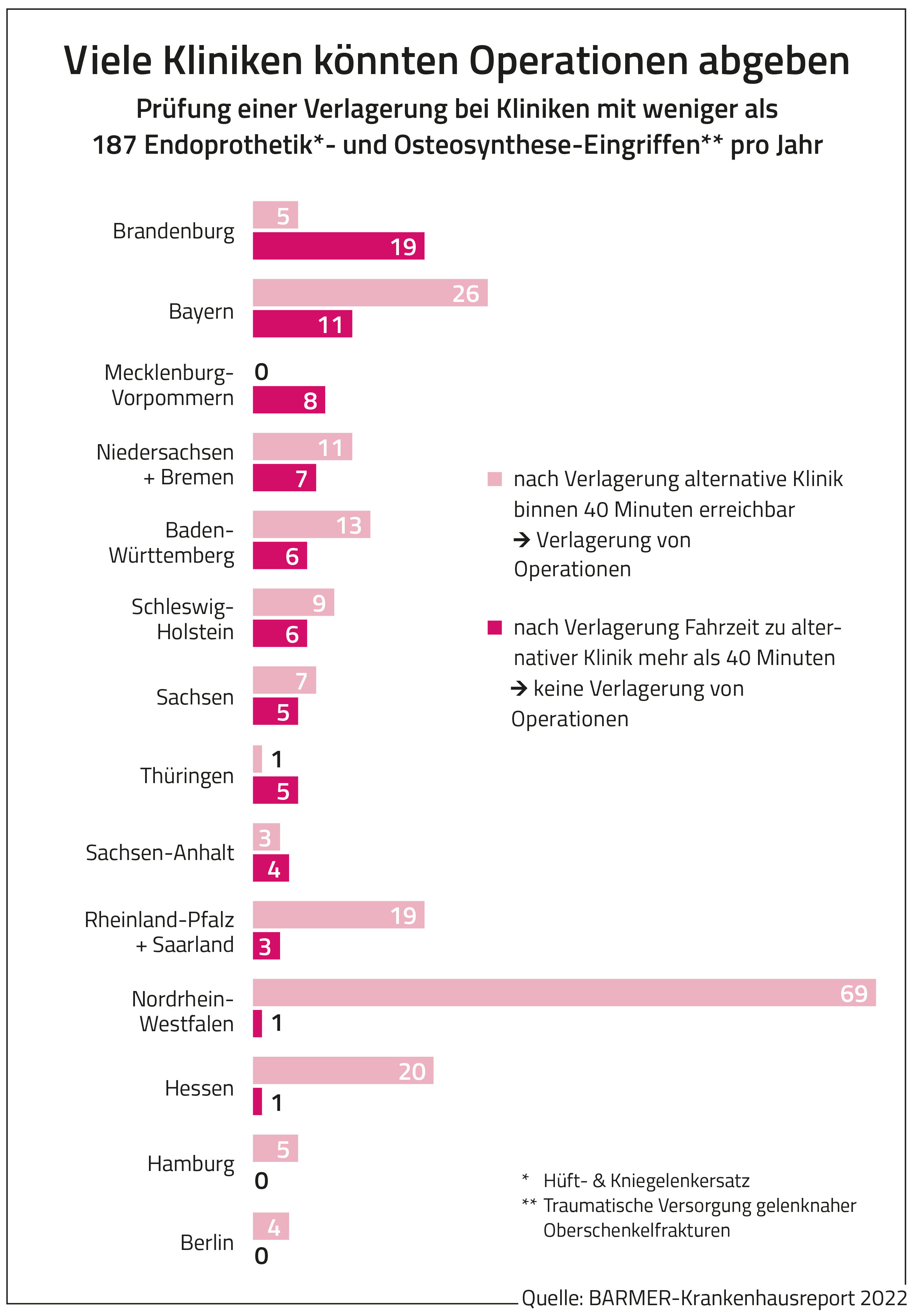 Laut dem Krankenhausreport sind die Potenziale zur Verlagerung von Operationen regional sehr unterschiedlich. Besonders in Ballungszentren Nordrhein-Westfalens, Bayerns und Hessens sowie in den Stadtstaaten können ohne Probleme viele Eingriffe verlagert werden, weil zahlreiche andere Häuser in relativ geringer Distanz vorhanden sind. In Mecklenburg-Vorpommern, Brandenburg, Sachsen-Anhalt und Thüringen stellt sich die Situation hingegen anders dar. Aufgrund der geringeren Klinikdichte seien hier Verlagerungen nur begrenzt möglich. „In manchen Bundesländern gibt es weniger Potenzial für Verlagerungen. Aber auch hier kann die Qualität der Versorgung signifikant verbessert werden. Die Barmer hat in ihrem 10-Punkte-Papier zur sektorenübergreifenden Versorgung einige Vorschläge gemacht, wie auch in diesem Fall die Versorgung optimiert werden kann“, sagte Straub. Dabei gehe es um regionale Versorgungszentren, in denen ortsnah sowohl die ambulante Behandlung als auch die Grund- und Notfallversorgung gewährleistet werde. Komplexe chirurgische Eingriffe sollten dagegen in größeren Kliniken erfolgen, in denen Ärztinnen und Ärzte sowie das Pflegepersonal die nötige Expertise für solche Operationen hätten. Die Verlagerung von Eingriffen an diese Standorte wäre ein wichtiger Schritt hin zu mehr Versorgungsqualität, so Barmer-Chef Straub. Dabei verstehe die Barmer ihren Report als einen Impuls für weiterführende Diskussionen über den Konzentrations- und Spezialisierungsprozess im stationären Sektor.