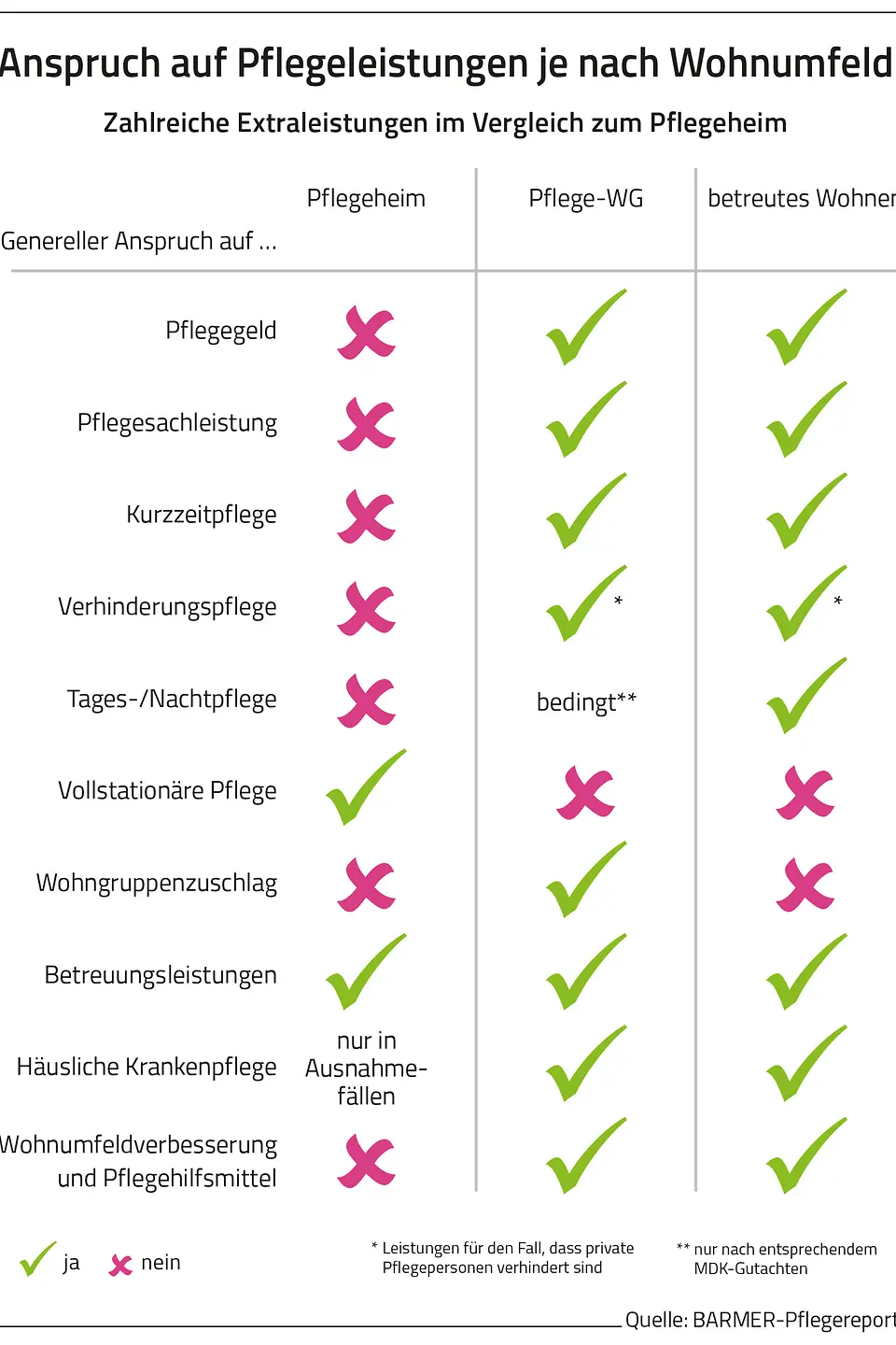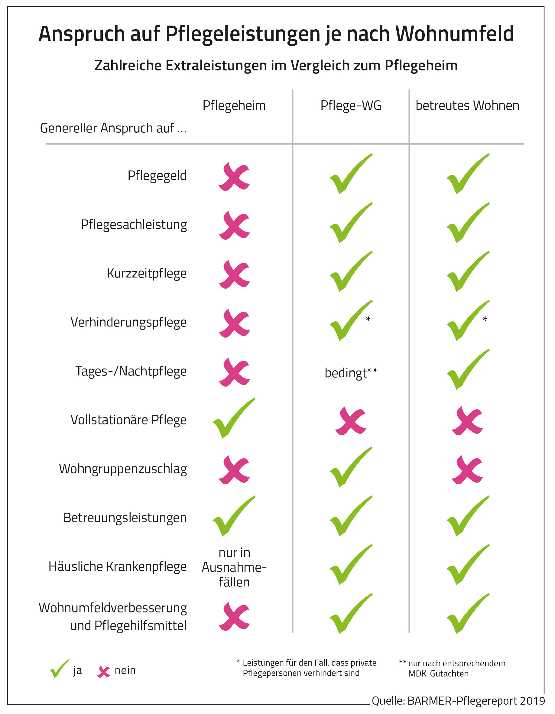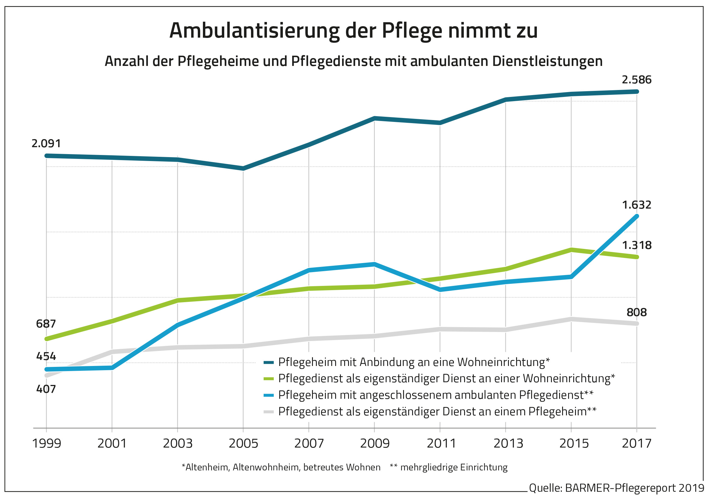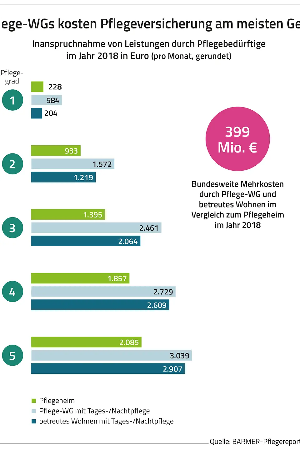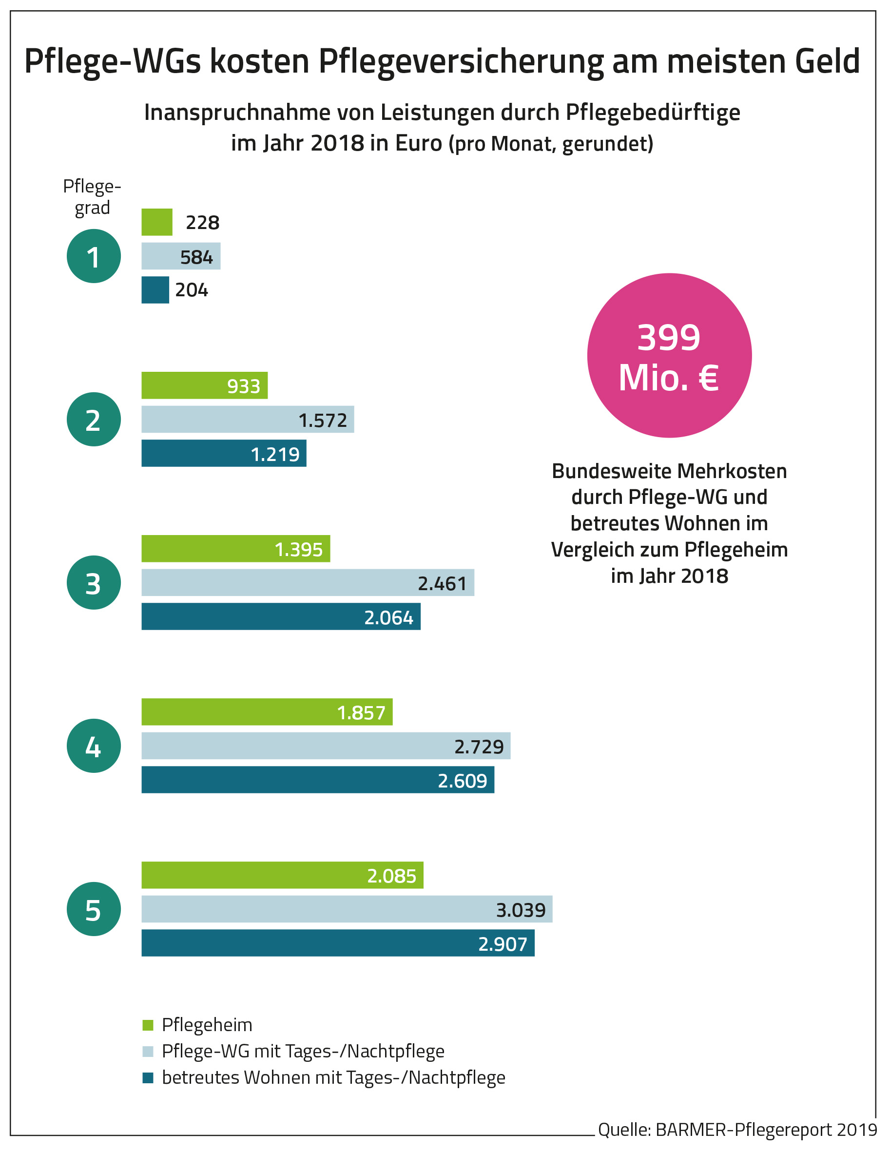 Berlin, 28. November 2019 – Auf dem deutschen Pflegemarkt gibt es immer häufiger betreutes Wohnen und Wohngemeinschaften. Diese Wohnformen waren im Vergleich zum Pflegeheim allein im Jahr 2018 um knapp 400 Millionen Euro teurer, ohne dass es einen gesicherten Nachweis der Pflegequalität gäbe. Das geht aus dem heute in Berlin vorgestellten Barmer-Pflegereport 2019 hervor. Aktuell leben in diesen Einrichtungen bereits 181.000 Pflegebedürftige, 150.000 davon in betreutem Wohnen.