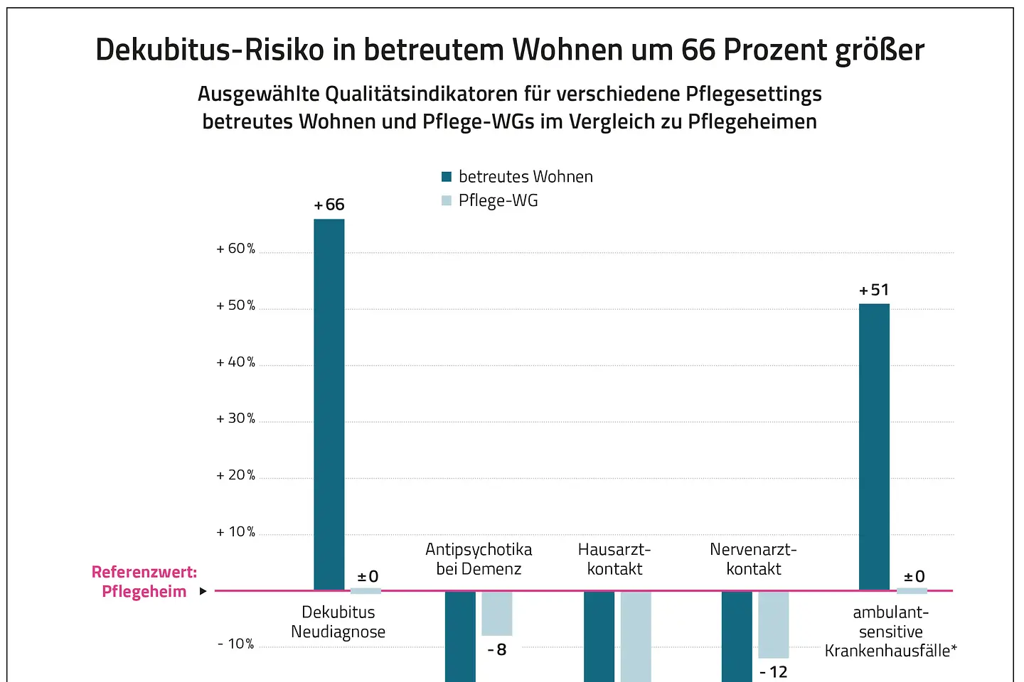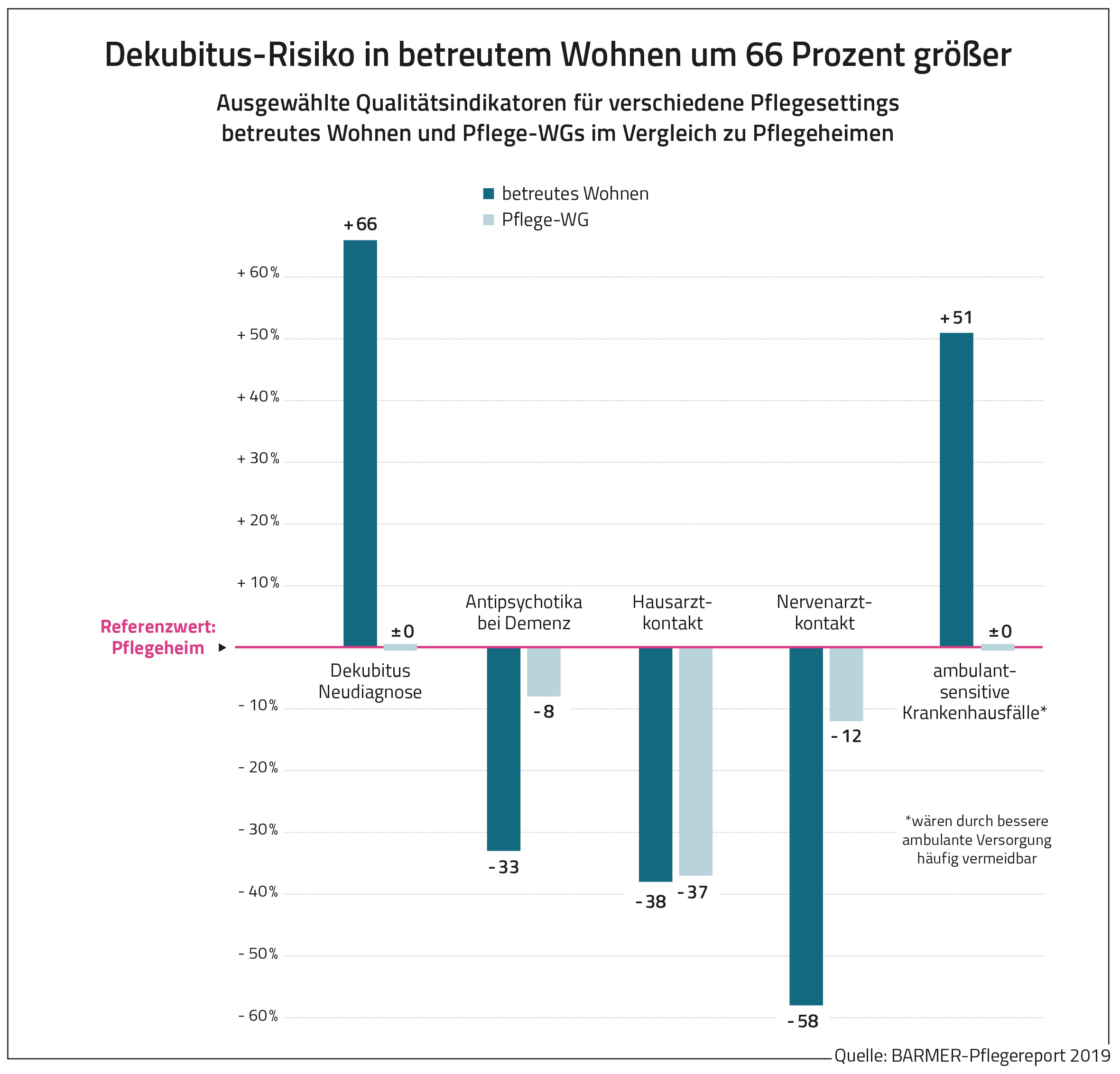 Neue Fälle von Wundliegen, dem sogenannten Dekubitus, seien in betreutem Wohnen zu 66 Prozent wahrscheinlicher als im Pflegeheim. Zugleich müssten 3,6 Prozent der Bewohnerinnen und Bewohner des betreuten Wohnens wegen Erkrankungen ins Krankenhaus, die sich eigentlich ambulant sehr gut behandeln ließen. In Pflegeheimen träten nur 2,4 Prozent solcher Fälle je Monat auf. Als Ursache dafür sieht die Barmer vor allem das Fehlen gleichartiger Qualitätsanforderungen. „Wir fordern eine Harmonisierung der rechtlichen Rahmenbedingungen zwischen den Bundesländern und einen Pflege-TÜV für die neuen Wohn- und Pflegeformen“, so Straub. Außerdem sollten die Länder generell für die Pflege die Aufsicht übernehmen und für mehr Transparenz auf dem Markt sorgen. Dazu benötigten die Pflegebedürftigen und ihre Familien Übersichten über Angebote, deren Qualität und Anbieter.