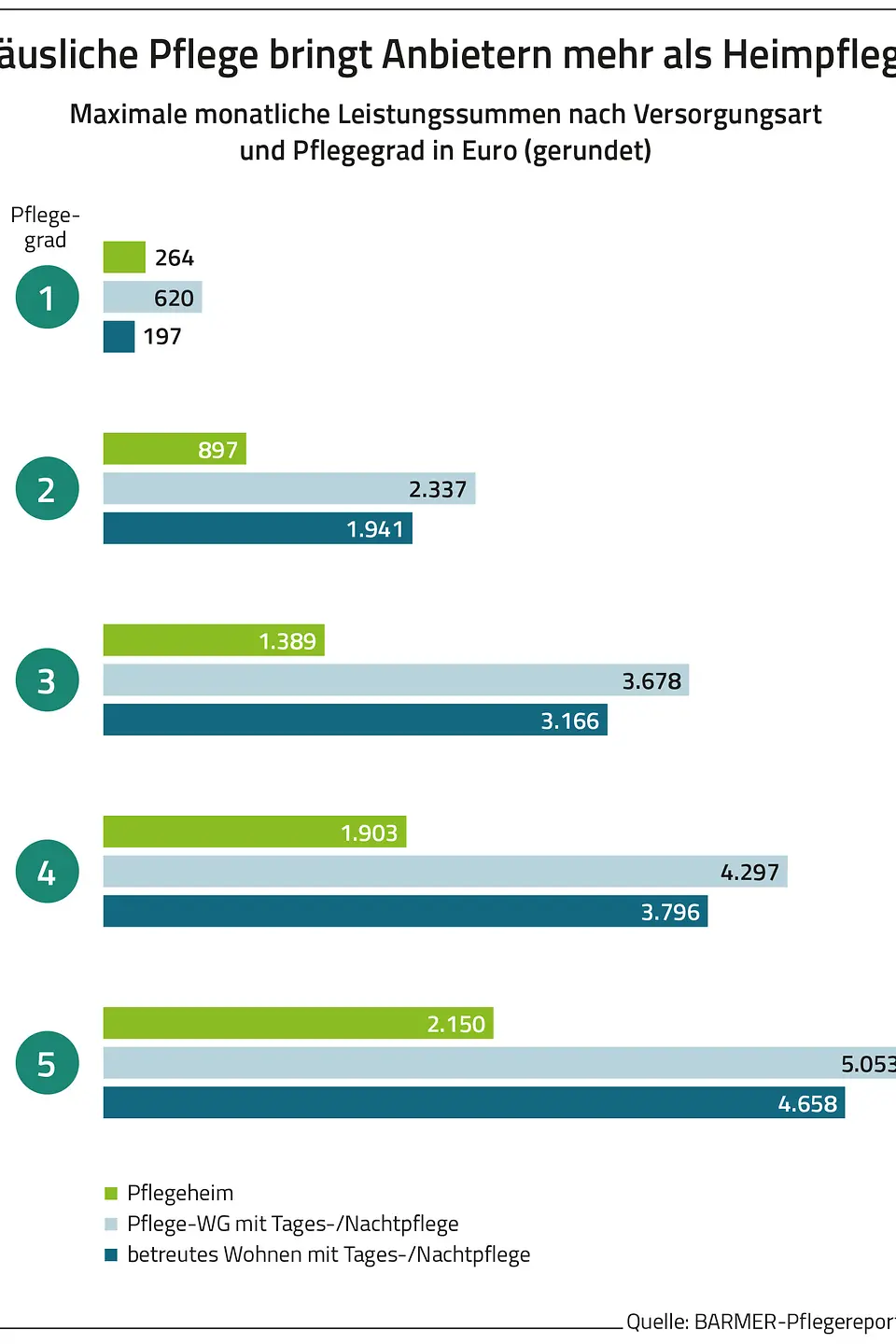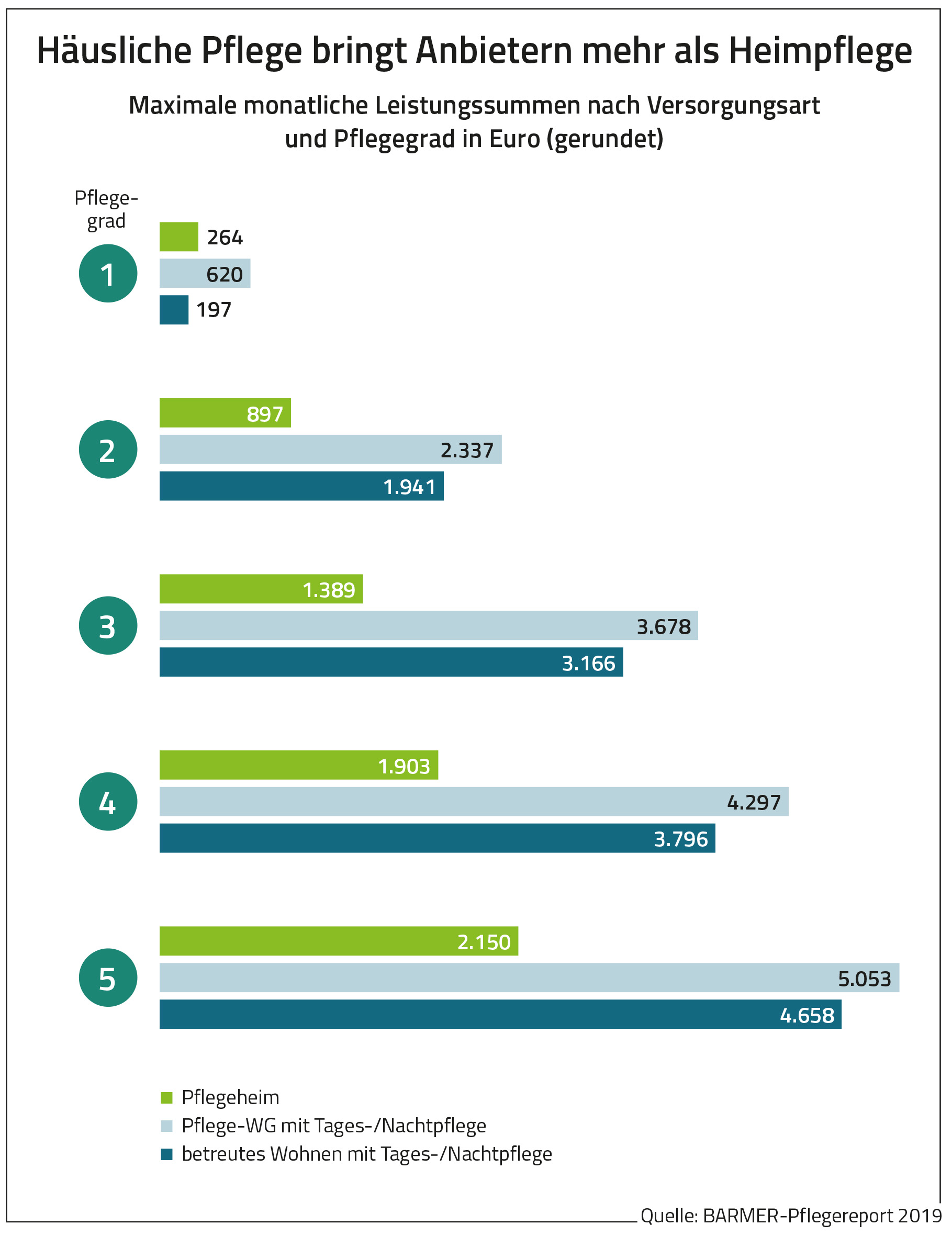 Dass die neuen Wohn- und Pflegeformen sowohl für Bewohner als auch Betreiber finanziell attraktiv sind, resultiert laut Studienautor Prof. Dr. Heinz Rothgang von der Universität Bremen aus ihrer besonderen Konstruktion. Die neuen Shooting-Stars des Pflegemarktes kombinierten Elemente der ambulanten und stationären Pflege mit Leistungen der gesetzlichen Krankenkassen, etwa der häuslichen Krankenpflege. So ließen sich in neuen Wohn- und Pflegeformen maximale Leistungssummen erzielen, die doppelt so hoch seien wie in der vollstationären Pflege. Das entlaste die Pflegebedürftigen und mache die Alternative zum Pflegeheim auch für die Betreiber wirtschaftlich hoch interessant. „Betreutes Wohnen und Wohngemeinschaften richten sich immer mehr an der Pflege aus und werden in steigendem Maße direkt von Pflegeeinrichtungen angeboten. Wir sprechen deshalb zu Recht von einer Ambulantisierung der Pflege“, so Rothgang. Während nach aktuellen Daten im Jahr 2018 jede vierte betreute Wohnanlage unabhängig von Pflegeeinrichtungen betrieben worden sei, sei es 15 Jahre zuvor noch fast jede zweite gewesen. Insgesamt trage die Entwicklung neuer Wohn- und Pflegeformen im Einklang dazu bei, dass die Pflege ambulanter werde. So hätten sich die Ausgaben für die ambulante Pflege in den Jahren 2000 bis 2018 von acht Milliarden auf 22,6 Milliarden Euro fast verdreifacht. In der stationären Pflege habe es hingegen nicht einmal eine Verdoppelung der Leistungsausgaben gegeben, von 7,5 auf 14,3 Milliarden Euro.
