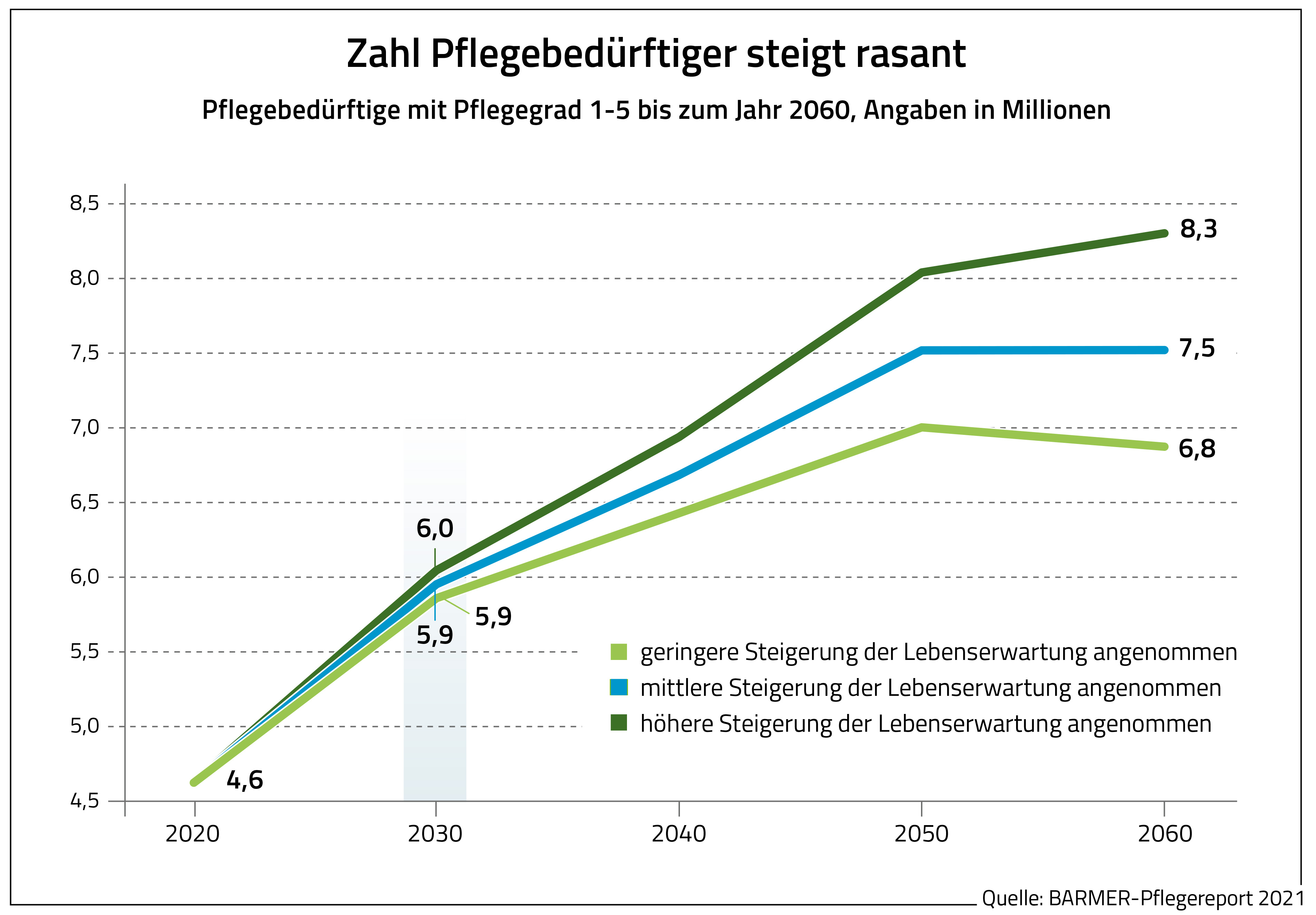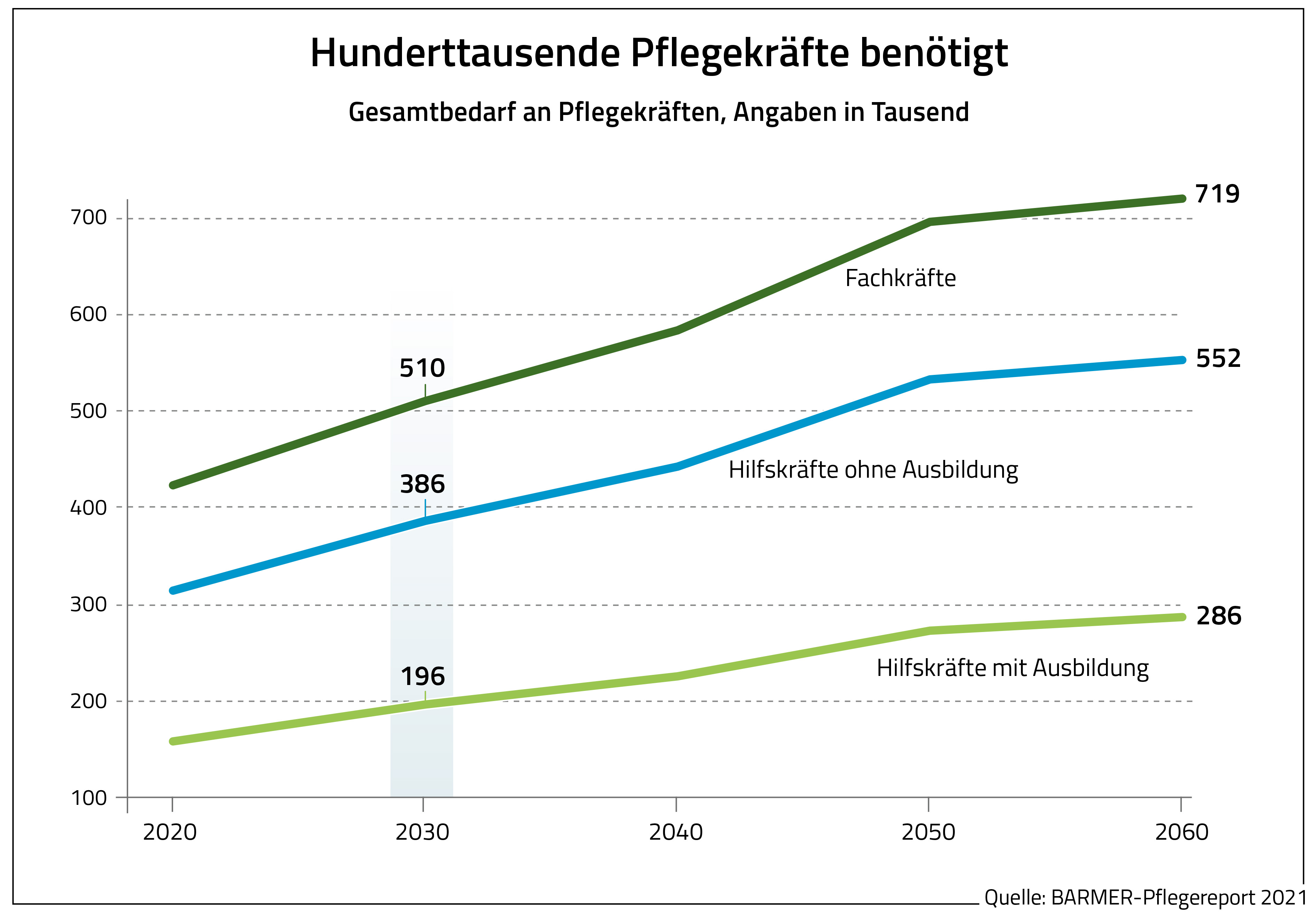 Berlin, 1. Dezember 2021 – Der Pflegenotstand in Deutschland wird nach neuesten Hochrechnungen der Barmer brisanter als bisher angenommen. Bis zum Jahr 2030 sollen bei konservativen Annahmen mehr als 180.000 Pflegekräfte fehlen, auch weil es mit dann insgesamt rund sechs Millionen Pflegebedürftigen über eine Million Betroffene mehr geben wird als bisher angenommen. Das geht aus dem aktuellen Pflegereport der Barmer hervor, der heute in Berlin vorgestellt wurde. „Die Politik muss zügig gegensteuern, andernfalls bleibt die Pflege eine Großbaustelle auf schwachem Fundament. Im Koalitionsvertrag stehen dazu einige richtungsweisende Vorhaben. Das begrüßen wir ausdrücklich! Nun muss rasch die Umsetzung angegangen werden“, forderte Prof. Dr. Christoph Straub, Vorstandsvorsitzender der Barmer.