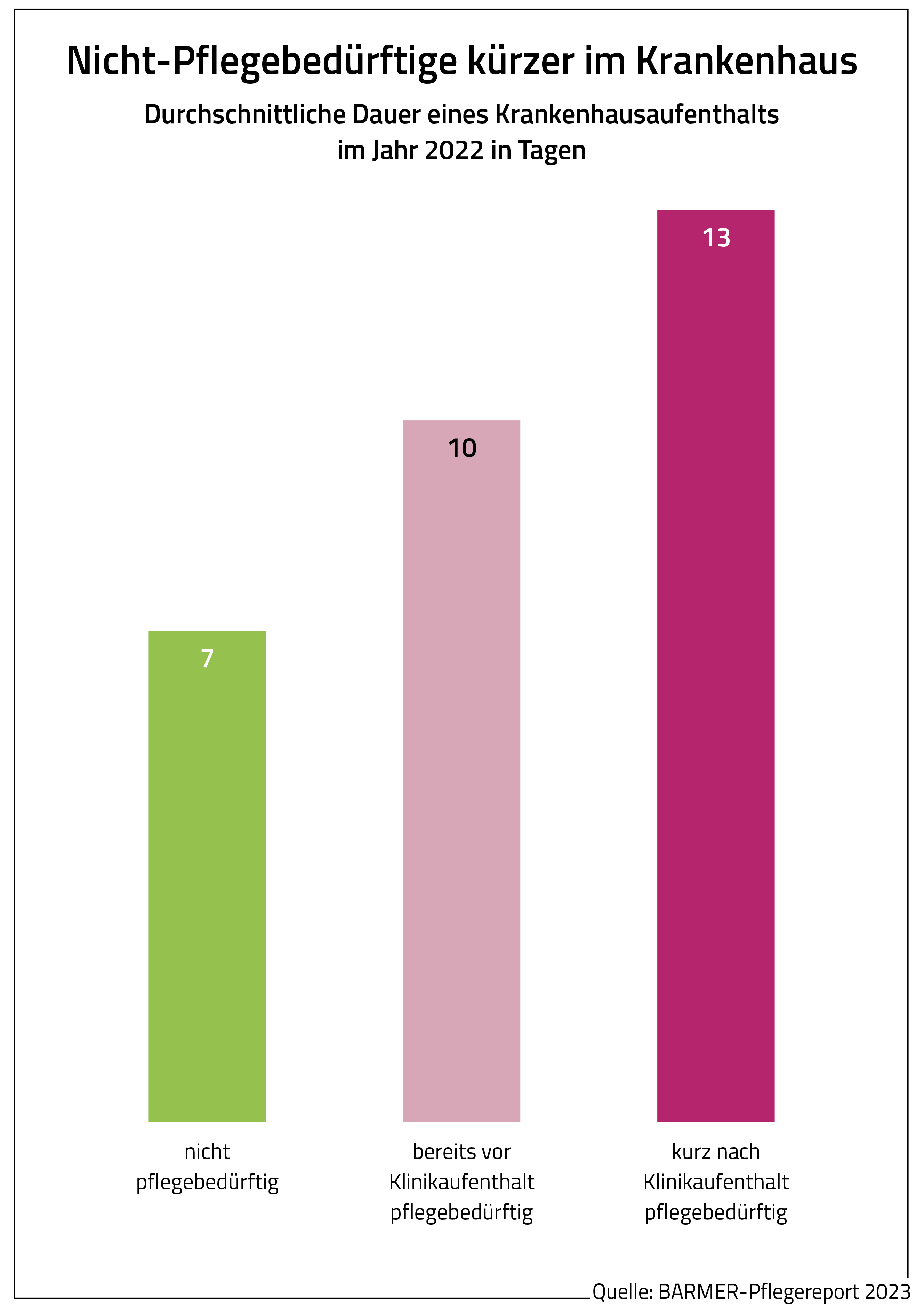 Knapp ein Viertel der Krankenhauspatienten war laut Pflegereport im vergangenen Jahr bereits vor der Aufnahme in die Klinik pflegebedürftig. Rund 275.000 Menschen beziehungsweise 1,9 Prozent wurden dies unmittelbar im Anschluss an die stationäre Behandlung. „Wer nach einem Krankenhausaufenthalt pflegebedürftig wird, liegt zuvor länger in der Klinik. Im Vergleich zu nicht pflegebedürftigen Patienten sind das durchschnittlich 3,4 Tage mehr. Das liegt insbesondere an der Schwere der Grunderkrankung“, sagte Rothgang. Auch wer bereits pflegebedürftig ins Krankenhaus komme, müsse dort mit bis 2,7 Tagen mehr rechnen. Ein weiterer Faktor für eine verzögerte Entlassung aus der Klinik sei, dass die Pflege zuhause oft erst organisiert werden müsse. Der stationäre Aufenthalt verlängere sich sogar um mehr als sechs Tage, wenn ihm eine Kurzzeitpflege folge. Rothgang: „Krankenhausaufenthalte verlängern sich deutlich, wenn die Pflege danach erst organisiert werden muss. Deshalb ist die Kurzzeitpflege so wichtig. Sie hilft insbesondere dabei, die Zeit bis zum Wechsel in ein Arrangement mit einem höheren Anteil formeller Pflege zu überbrücken.“ Um eine bessere Versorgung zu gewährleisten, sollten beispielsweise die Kliniken die Kranken- und Pflegekassen regelhaft informieren, sobald klar sei, wann ein Patient entlassen werde, ergänzte Straub. Möglich wäre dies in Rahmen des digitalen Datenaustauschs. Die Kranken- und Pflegekassen benötigten diese Information möglichst frühzeitig, um eine reibungslose Versorgung der Betroffenen zu erleichtern – zum Beispiel für eine zeitnahe Unterstützung mit Hilfsmitteln.