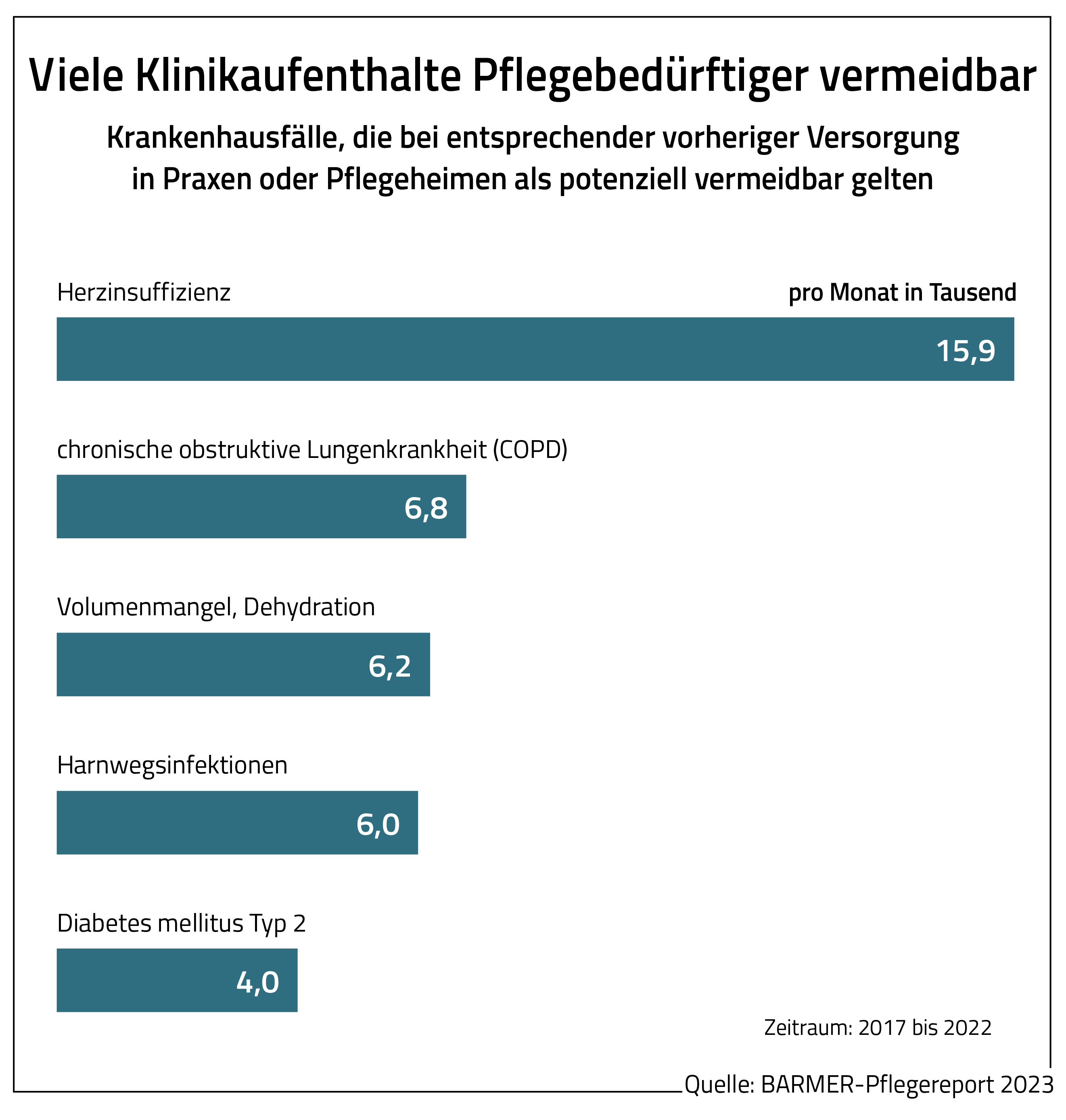 Sektorenübergreifende Einrichtungen könnten verschiedene Gesundheitsberufe, Arztpraxen und Pflegedienste vereinen. So könnten vor allem die Menschen in dünn besiedelten Gebieten wohnortnah effizienter versorgt werden. Je besser dies gelinge, desto eher könnten stationäre Aufenthalte vermieden werden. Hier bestehe dringender Handlungsbedarf, sagte der Barmer-Chef. Dem Pflegereport zufolge waren zwischen den Jahren 2017 und 2022 monatlich im Schnitt rund 280.000 pflegebedürftige und kurz vor der Pflegebedürftigkeit stehende Patienten in einer Krankenhausbehandlung. Dabei handelte es sich häufig um ambulant-sensitive oder Pflegeheim-sensitive Fälle, die unter besseren medizinischen Bedingungen von der Hausarztpraxis oder im Pflegeheim behandelt werden können. Dazu zählen Herzinsuffizienz mit monatlich rund 15.900 Krankenhausfällen und Diabetes mellitus Typ 2 mit etwa 4.000 Fällen. „Bei einer gezielteren Versorgung im Vorfeld müssten Pflegebedürftige mit entsprechenden Erkrankungen meist gar nicht erst in ein Krankenhaus. Dafür müssen aber die Rahmenbedingungen stimmen“, betonte Studienautor Prof. Dr. Heinz Rothgang von der Universität Bremen.