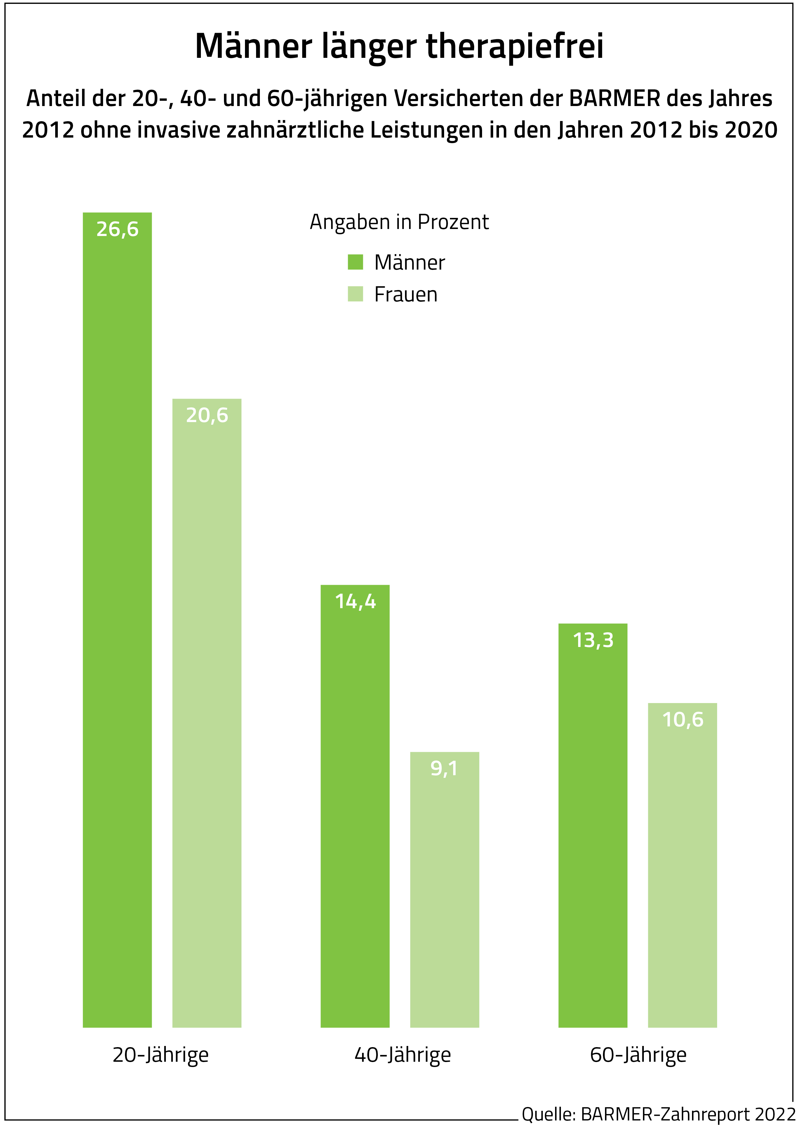 Den Ergebnissen des Reportes zufolge gibt es deutliche Unterschiede in der Zahngesundheit zwischen den Geschlechtern. Demnach sind Männer während eines weiten Teils deutlich häufiger langfristig therapiefrei als Frauen. So waren zum Beispiel rund 12,4 Prozent der 49-jährigen Männer und 8,4 Prozent der gleichaltrigen Frauen langfristig ohne zahninvasive Behandlung. Erst ab 70 Jahren kehrt sich das Geschlechterverhältnis um, wobei der Anteil der Personen ohne invasive Zahnbehandlung mit zunehmendem Alter steigt. „Frauen nehmen offenbar mehr zahnärztliche Leistungen in Anspruch als Männer. Zugleich verlieren sie weniger Zähne“, sagte Barmer-Chef Straub.