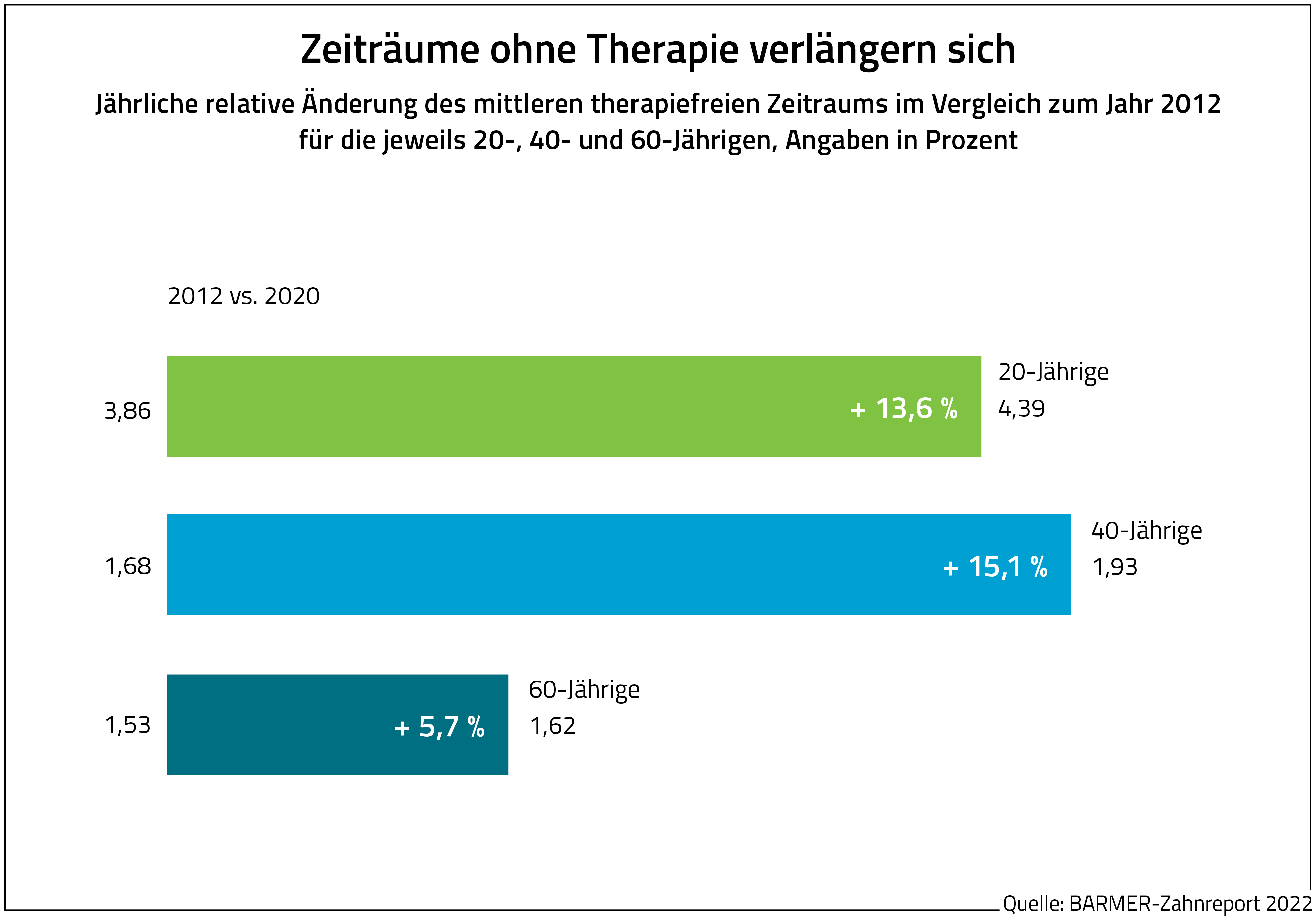 Wie aus dem Zahnreport weiter hervorgeht, sind fast zwölf Prozent der 60-Jährigen zwischen den Jahren 2012 und 2020 ohne invasive Zahnbehandlungen ausgekommen. Bei den 40-Jährigen traf dies auf gut elf Prozent zu und bei den 20-Jährigen auf knapp 24 Prozent. „Bei den jungen Erwachsenen sind die Zahlen durchaus ermutigend. Im mittleren Alter hätten wir uns aber ein deutlich besseres Ergebnis gewünscht“, sagte Prof. Dr. Michael Walter von der Technischen Universität Dresden, Autor des Barmer-Zahnreports. Dabei zeige sich in der jüngsten Alterskohorte, dass die Unterschiede zwischen Ost und West, die in den Zahnreporten der vergangenen Jahre immer wieder auffielen, offenbar geringer werden. Während die mittlere therapiefreie Zeit im Jahr 2012 in den westlichen Bundesländern noch um mehr als zwölf Monate länger gewesen sei als in den östlichen, sei der Abstand zuletzt auf gut zehn Monate zurückgegangen, wie entsprechende Hochrechnungen zeigten. Bei der nach der Wiedervereinigung aufgewachsenen Generation junger Erwachsener gebe es offenbar eine Annäherung der Zahn-Versorgungserfahrungen. Gleichwohl fänden sich zwischen einzelnen Bundesländern zum Teil noch erhebliche Unterschiede. Die für das Jahr 2020 für 20-Jährige berechnete mittlere therapiefreie Zeit habe in Hamburg 4,5 Jahre, in Thüringen dagegen nur 3,3 Jahre betragen.