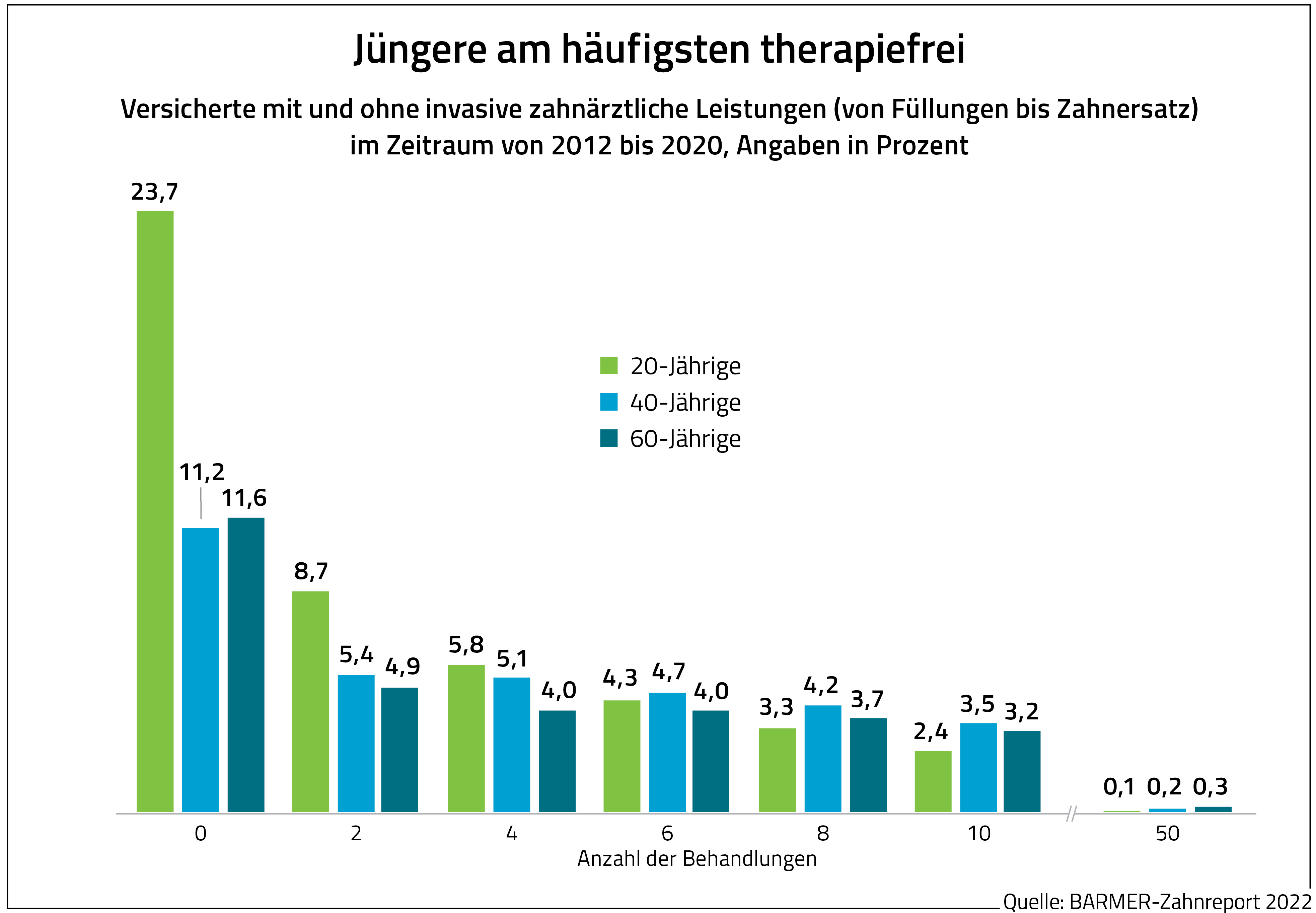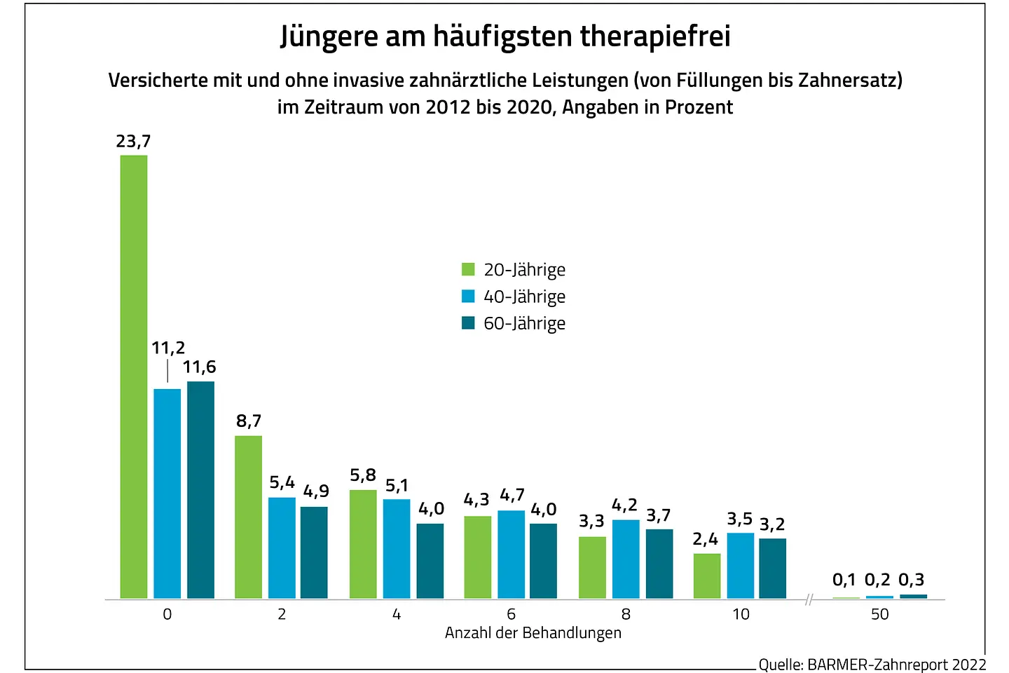 Laut BARMER-Zahnreport hängt die Zahnversorgung auch vom Alter ab. Demnach ist die Zahl der zwischen den Jahren 2012 und 2020 therapiefreien Versicherten im sehr jungen und im hohen Alter am größten. Zwischen 40 und 50 Jahren waren die wenigsten Versicherten in den neun Folgejahren ohne Therapie. Ab etwa 70 Jahren nimmt die Zahl der langfristig therapiefreien Versicherten stark zu. „Im mittleren Lebensalter kommen die wenigsten Versicherten langfristig ohne Therapie aus. Dies mag auch an der in dieser Phase zunehmend auftretenden Parodontitis liegen, die zum Therapiebedarf beiträgt. Dieser wird im Alter wieder weniger, was unter anderem an der abnehmenden Anzahl der Zähne liegt“, sagte Zahnreport-Autor Walter.
