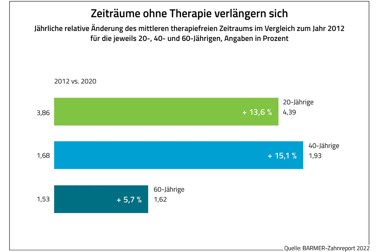 Berlin, 20. Oktober 2022 – Die Zahngesundheit im jungen und mittleren Lebensalter wird in Deutschland immer besser. Zwischen den Jahren 2012 und 2020 ist bei 20-Jährigen der mittlere Zeitraum ohne invasive Zahntherapie um mehr als sechs Monate auf 4,4 Jahre gestiegen. Bei den 40-Jährigen gab es einen Zuwachs um drei Monate auf 1,9 Jahre. Trotzdem können die Zahlen insgesamt noch nicht zufriedenstellen. Das geht aus dem aktuellen Zahnreport der Barmer hervor, den die Krankenkasse am Donnerstag in Berlin vorgestellt hat. Der Report hat für verschiedene Alterskohorten untersucht, über welchen Zeitraum sie keine invasive Zahntherapie wie zum Beispiel Wurzelbehandlungen, Füllungen, Parodontitisbehandlungen, neue Kronen oder Zahnextraktionen benötigten. Den geringsten Fortschritt gab es demnach bei den 60-Jährigen, bei denen die mittlere therapiefreie Zeit um etwa einen Monat auf 1,6 Jahre angewachsen ist. „Bei der zahnmedizinischen Versorgung in Deutschland deutet sich ein Wandel an. Dieser ist aber noch lange nicht vollzogen. Der Wandel von einer therapie- zu einer nachhaltig präventionsgeprägten Zahnmedizin sollte konsequent weiterverfolgt werden, denn Prävention muss Vorrang vor Intervention haben“, sagte der Vorstandsvorsitzende der Barmer, Prof. Dr. med. Christoph Straub.